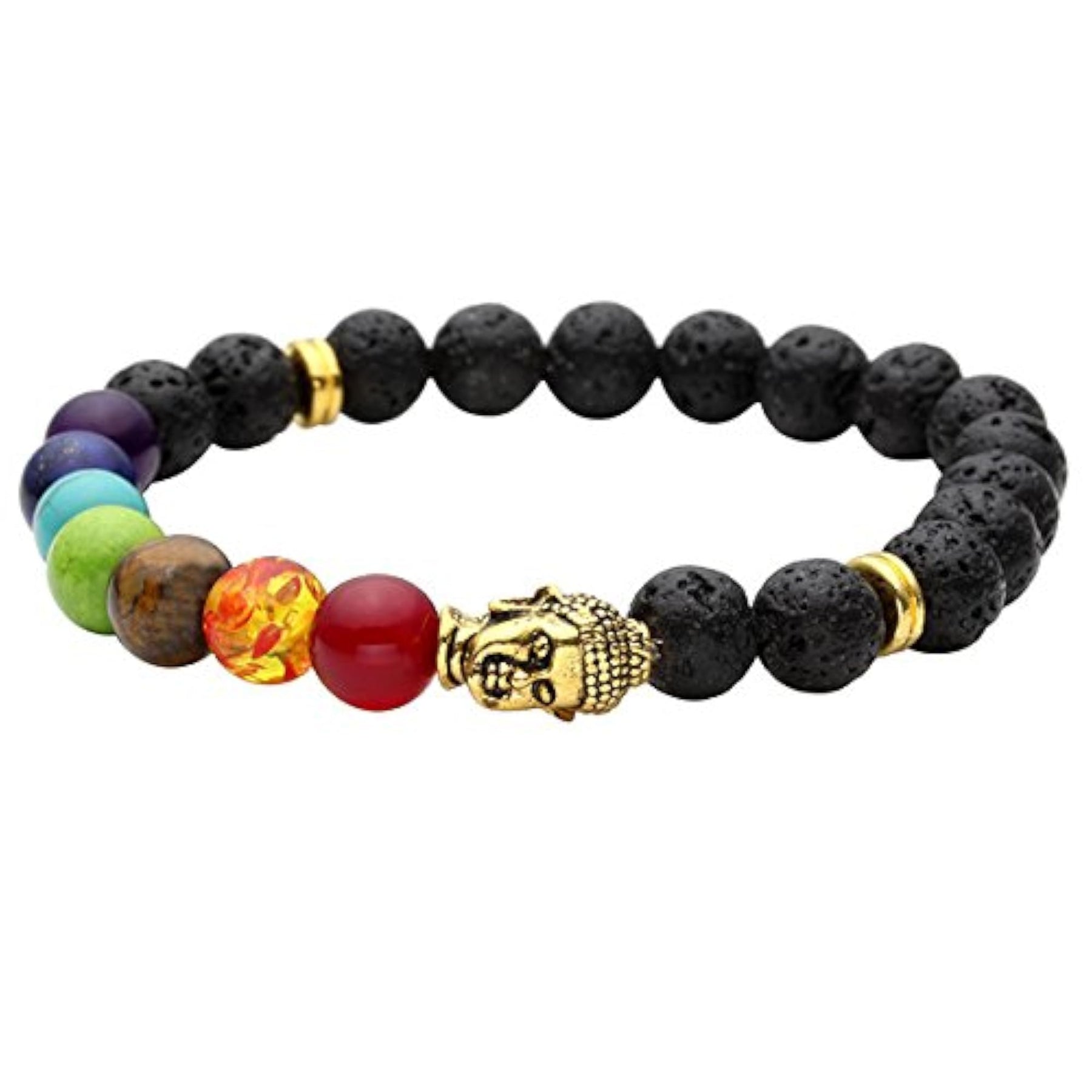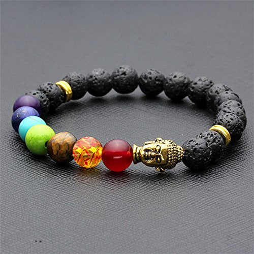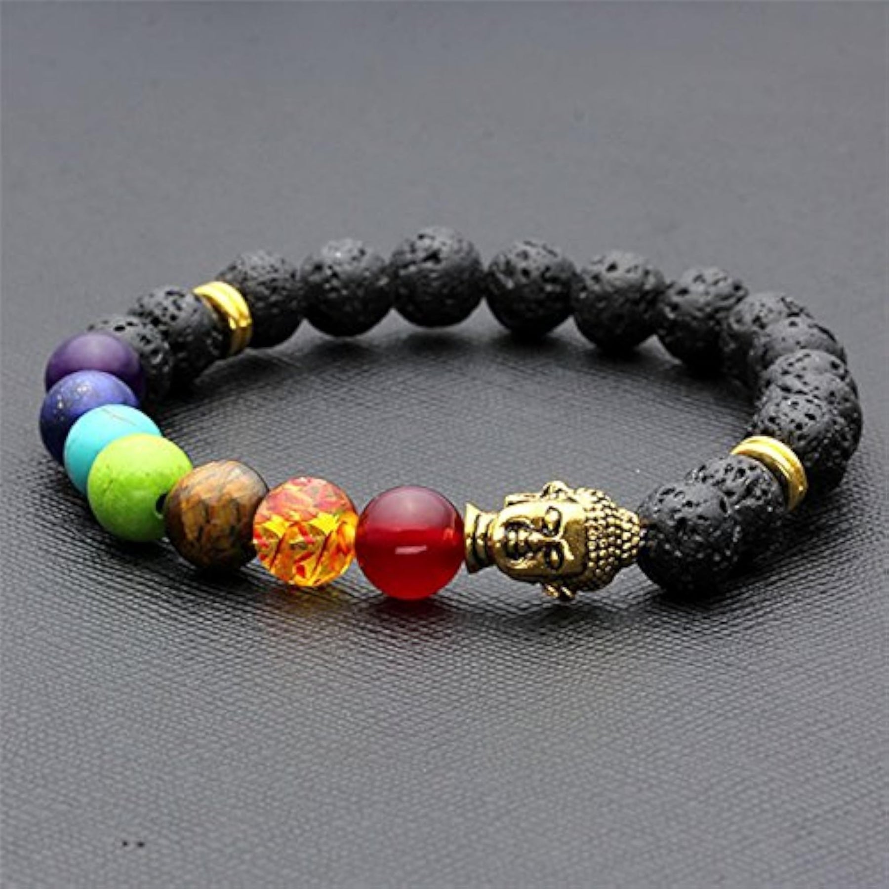 Enhance your style with this natural lava stone bracelet featuring seven chakra beads and a Buddha charm.