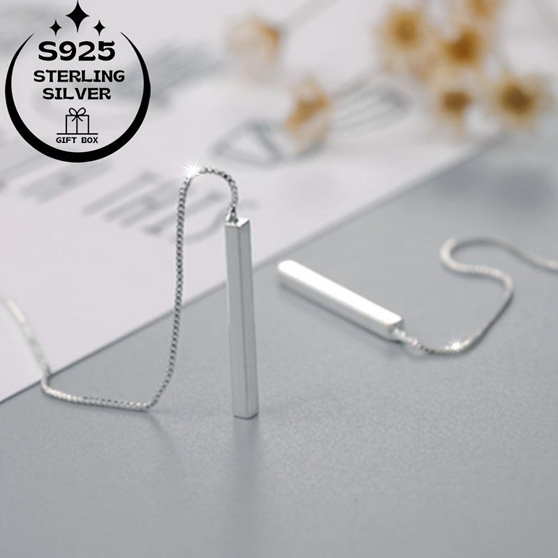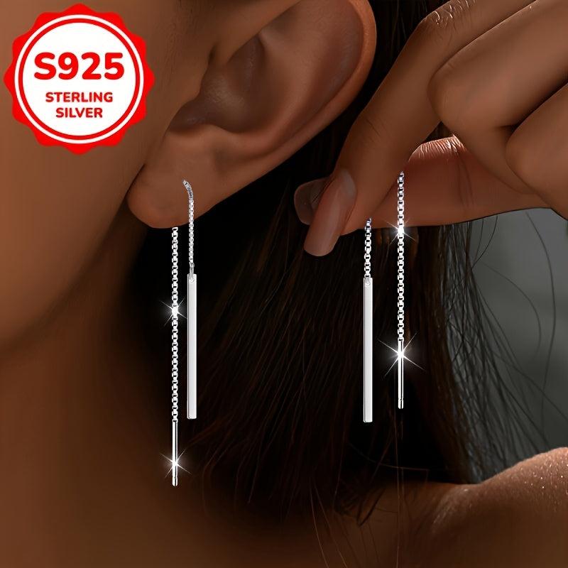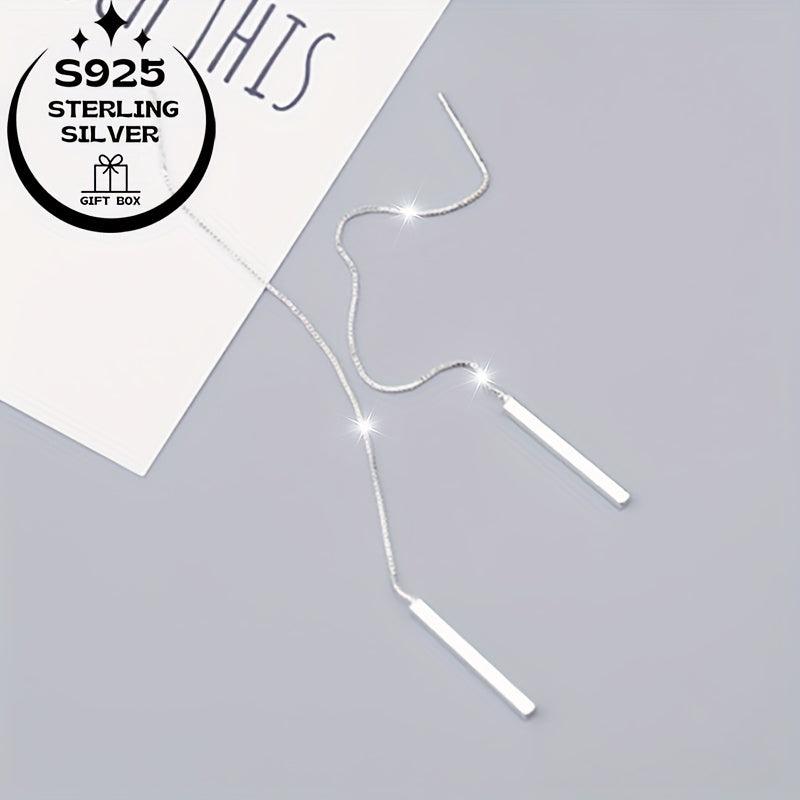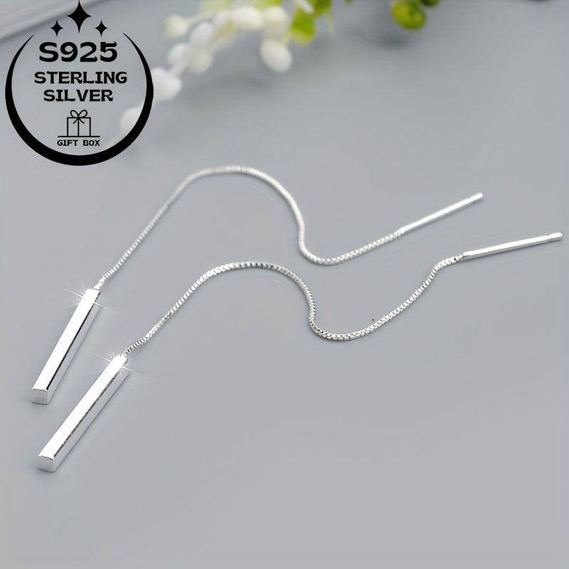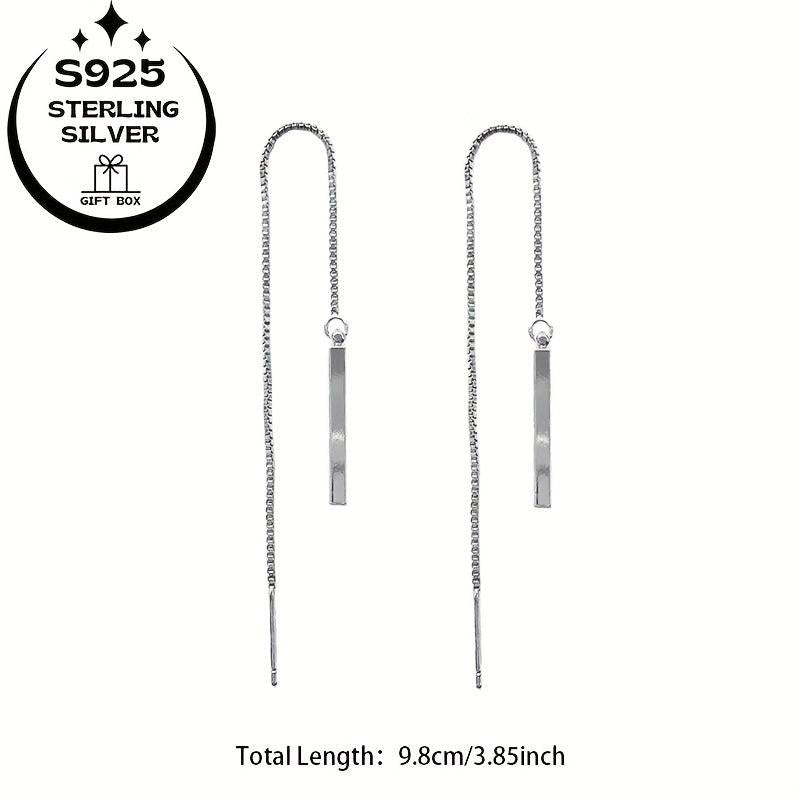 Elegant 925 sterling silver dangling earrings featuring a long rectangular tassel design with sparkling chain and crystal accents. Ideal for birthdays, anniversaries, and special occasions.