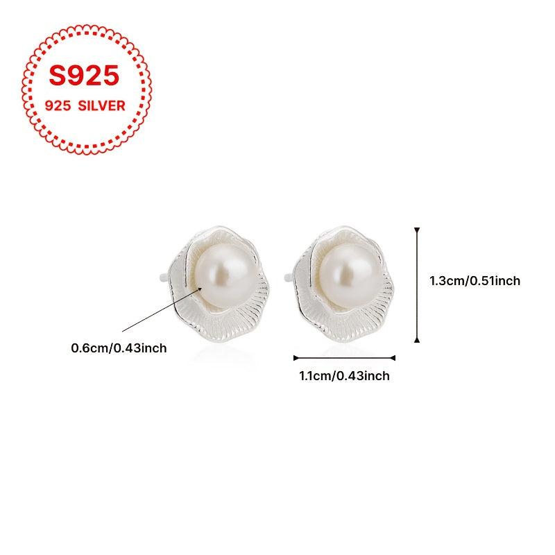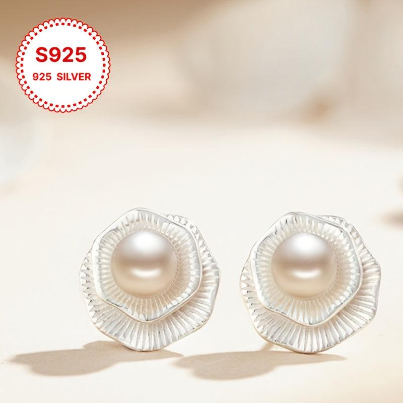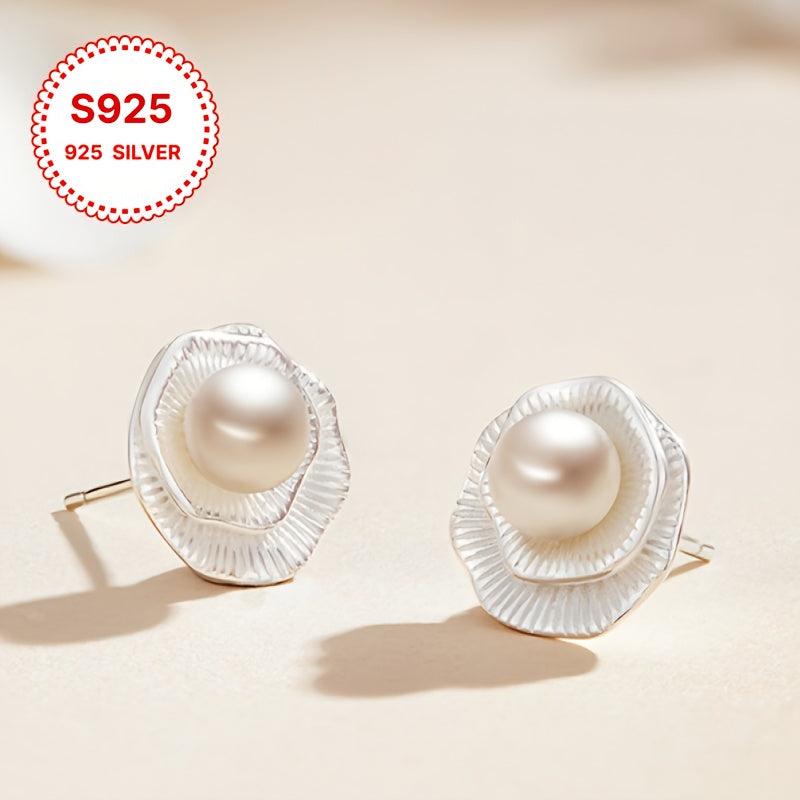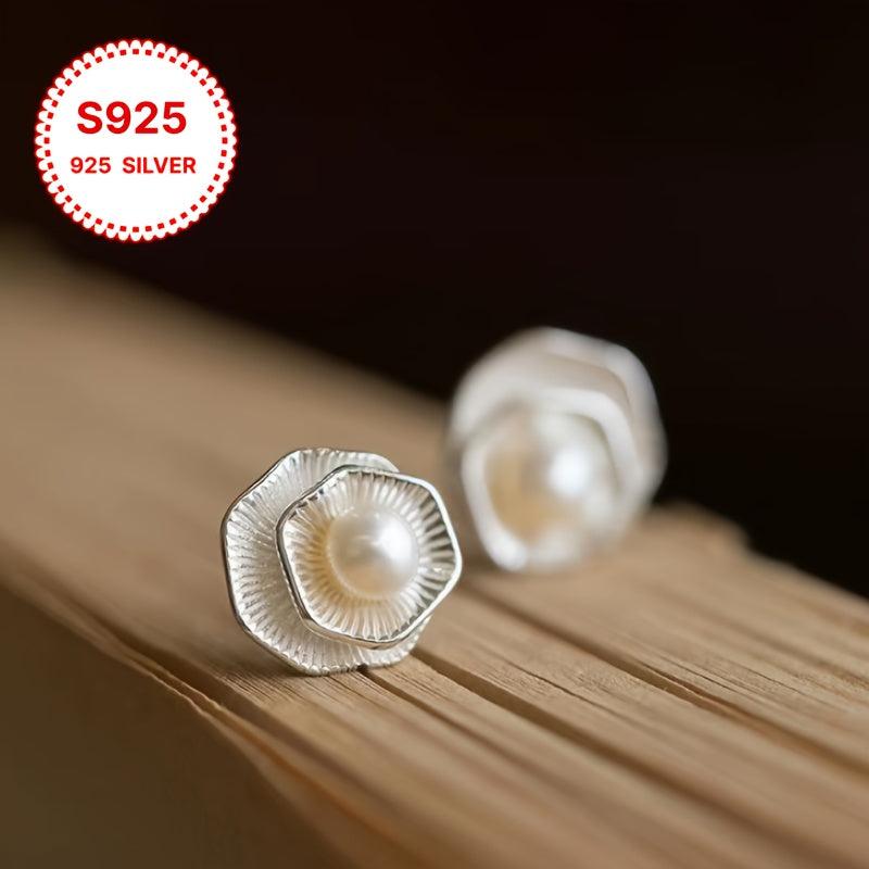 Beautiful geometric lotus flower earrings made of 925 sterling silver with pearl accents. Low allergy and minimalist design perfect for daily wear or special occasions. Ideal gift for loved ones.