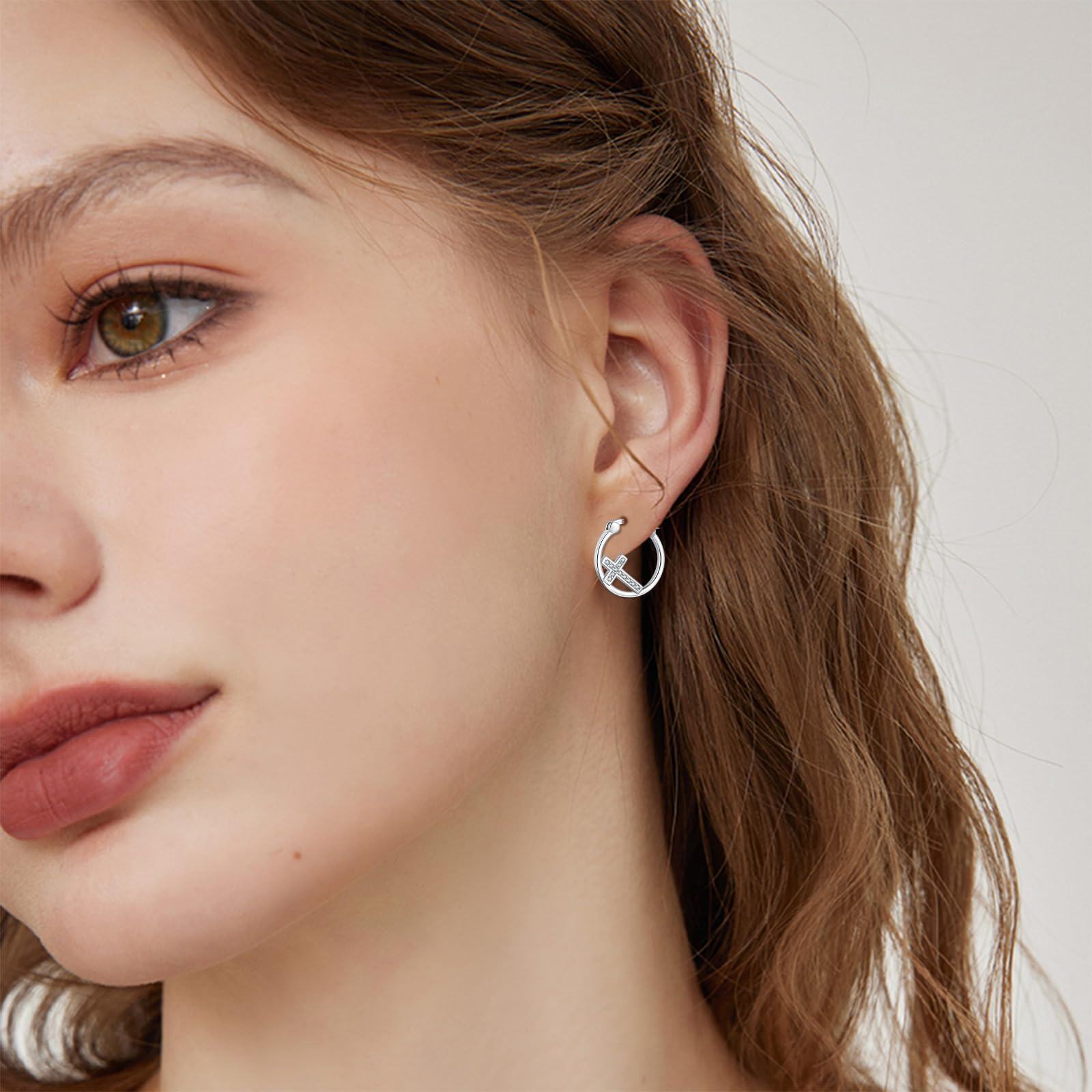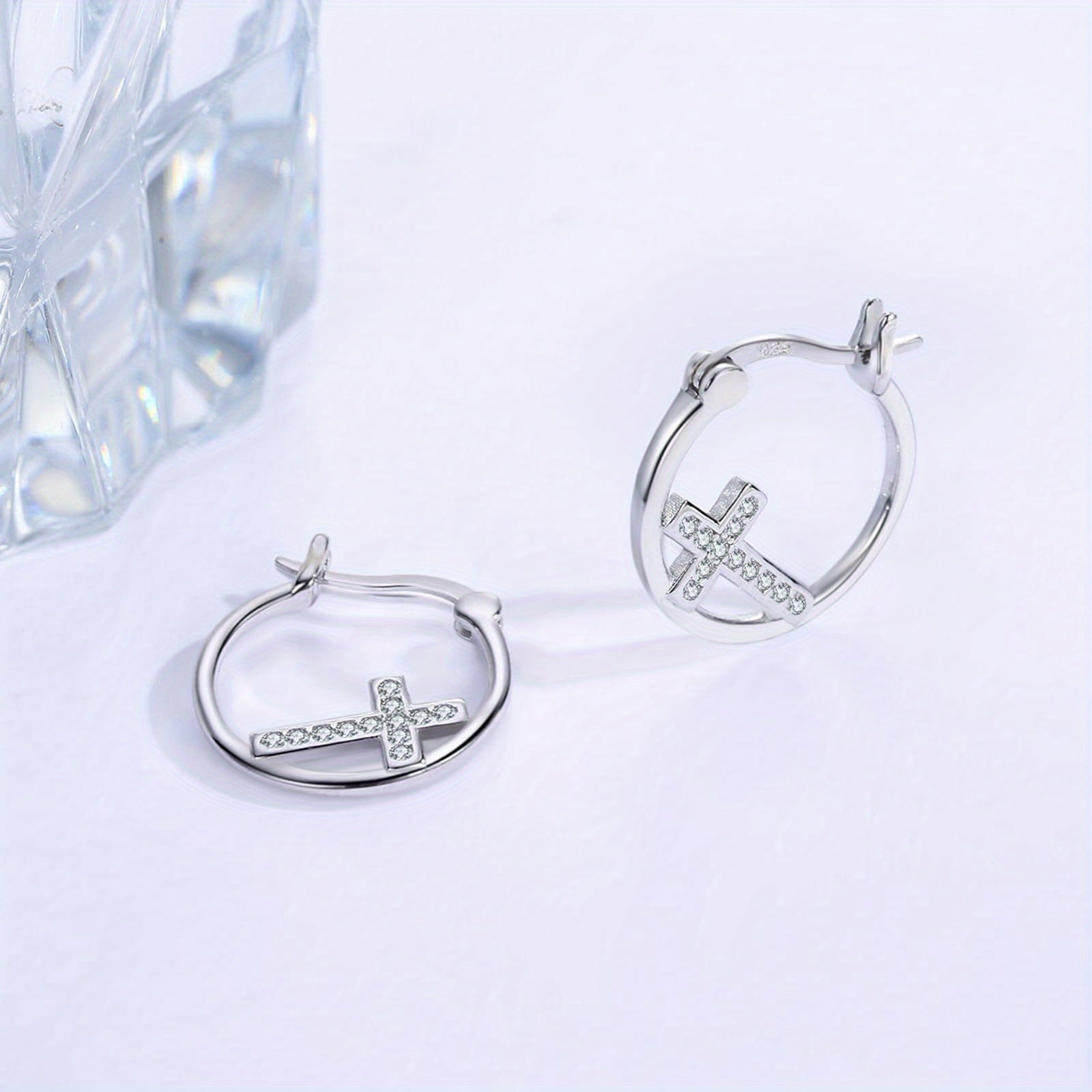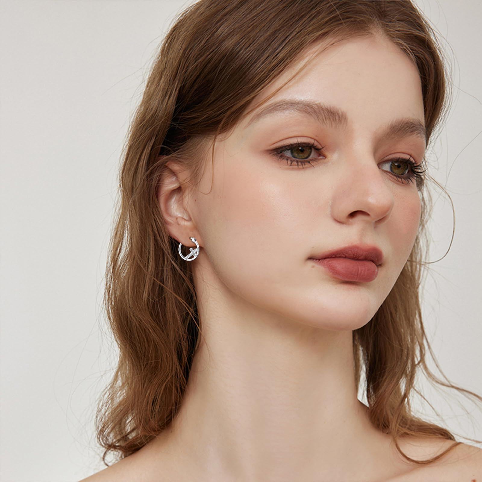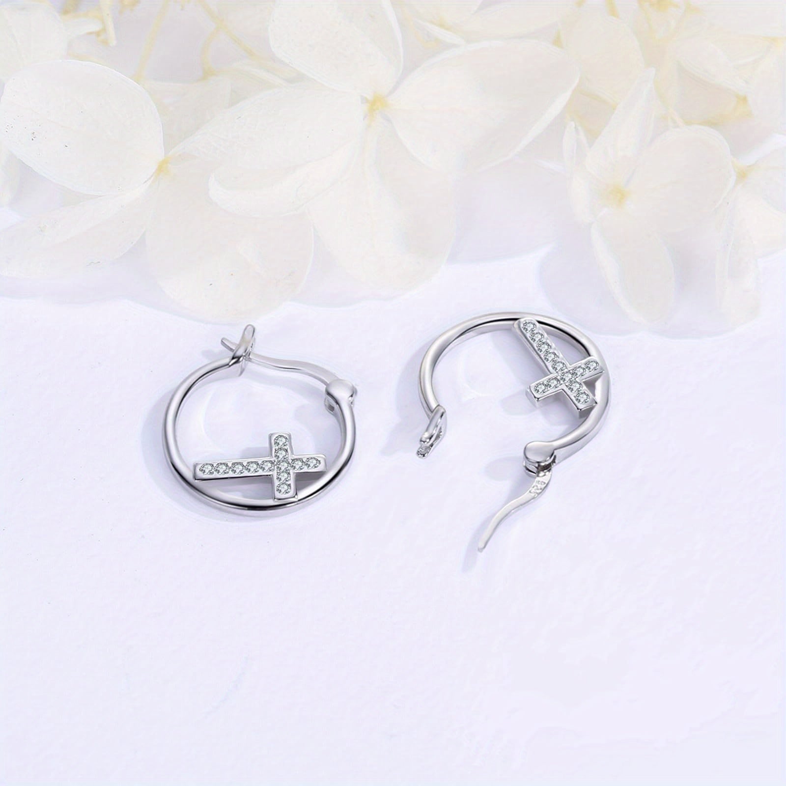 925 Silver Small Cross Hoop Earrings Cubic Zirconia Religious Jewelry