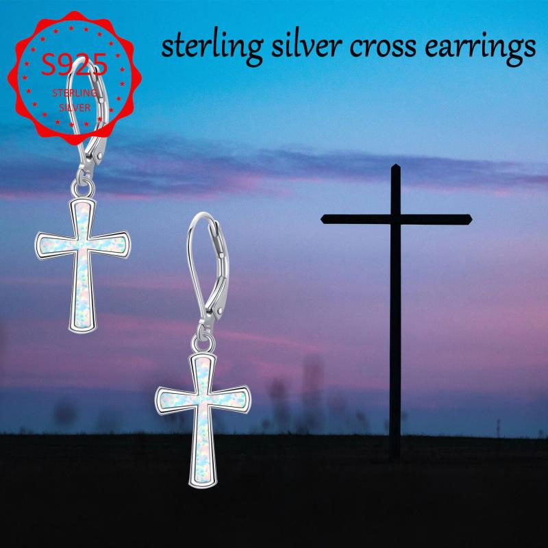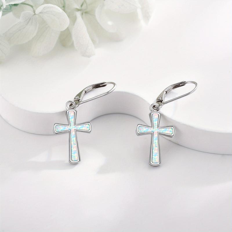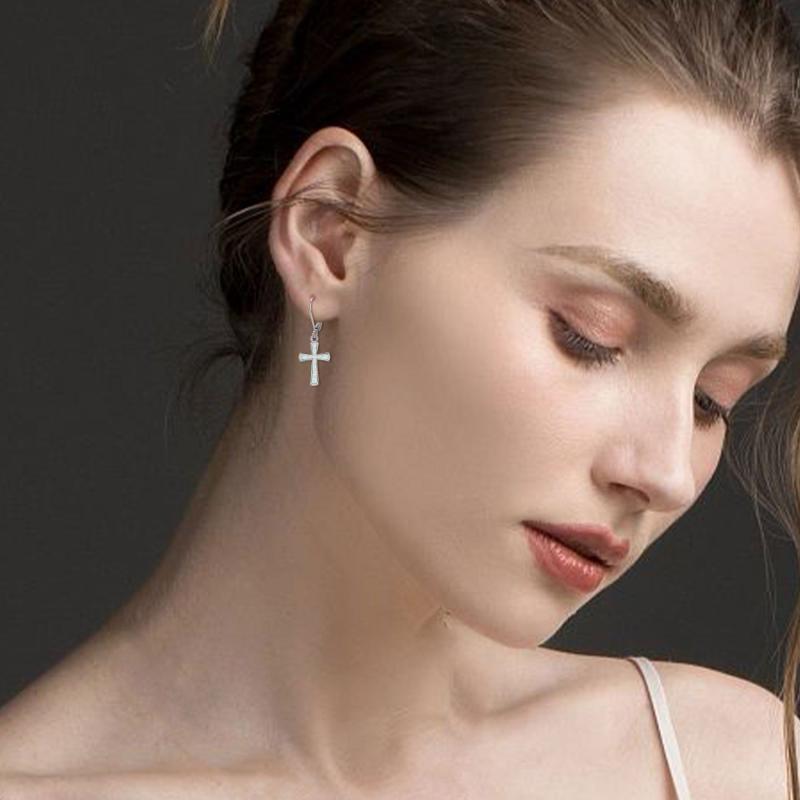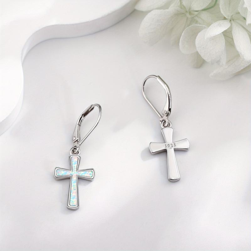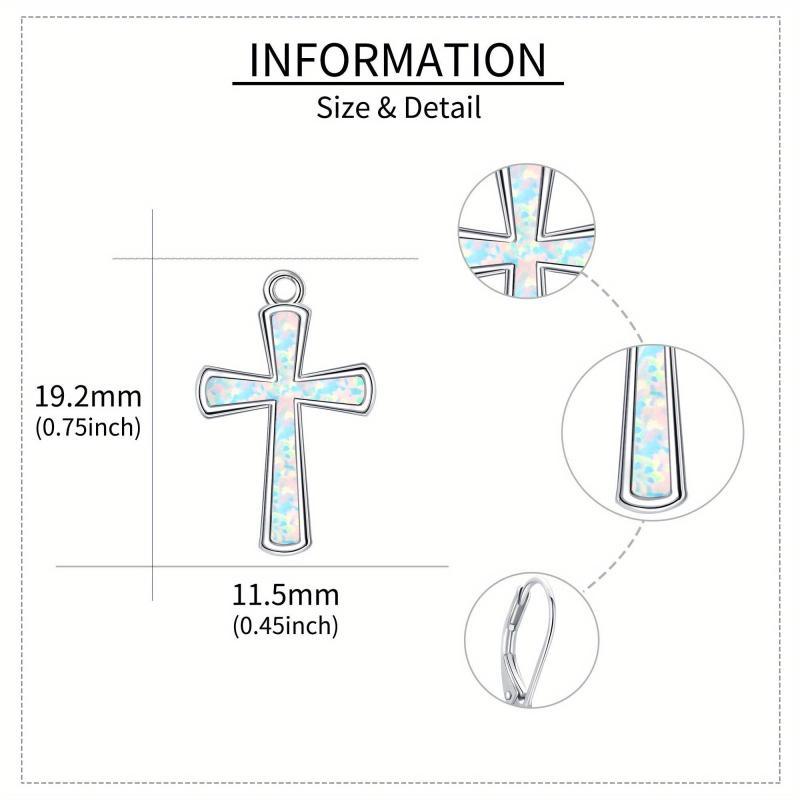 These cross earrings are made of 925 pure silvery metal with synthetic opal stone. They feature a cross lever pendant design, perfect for women and girls who want to express their Christian religious belief through their jewelry. A great gift idea for any occasion.