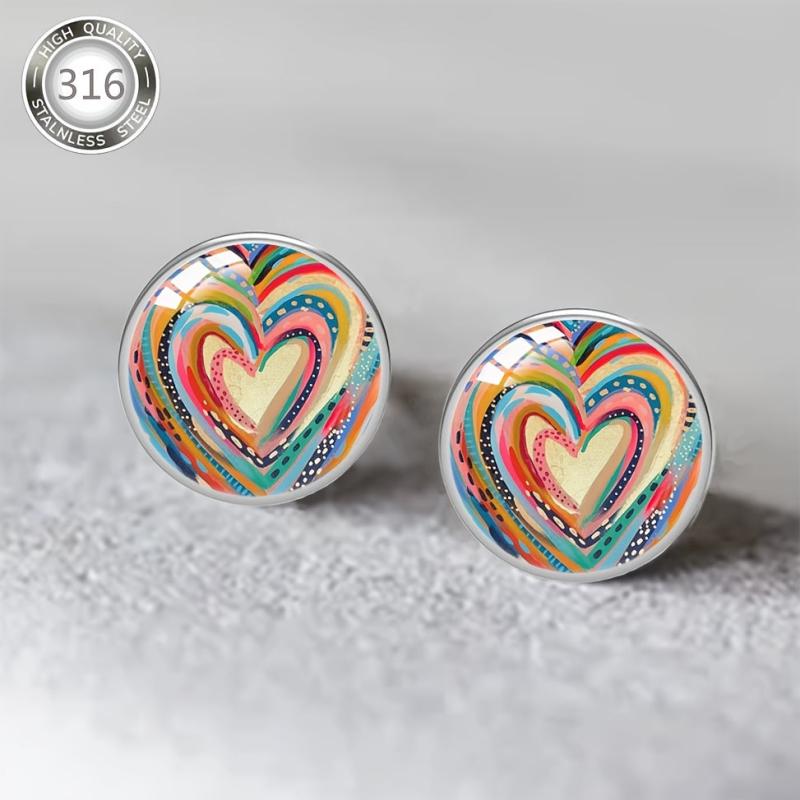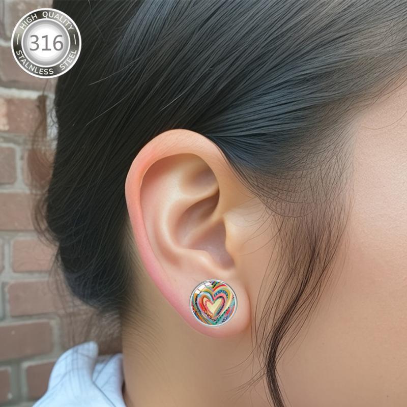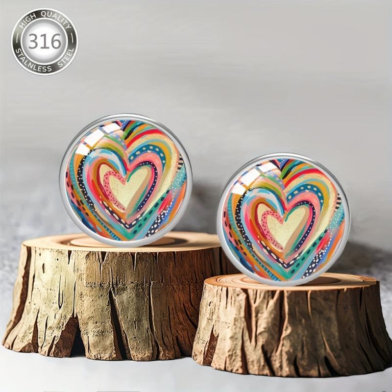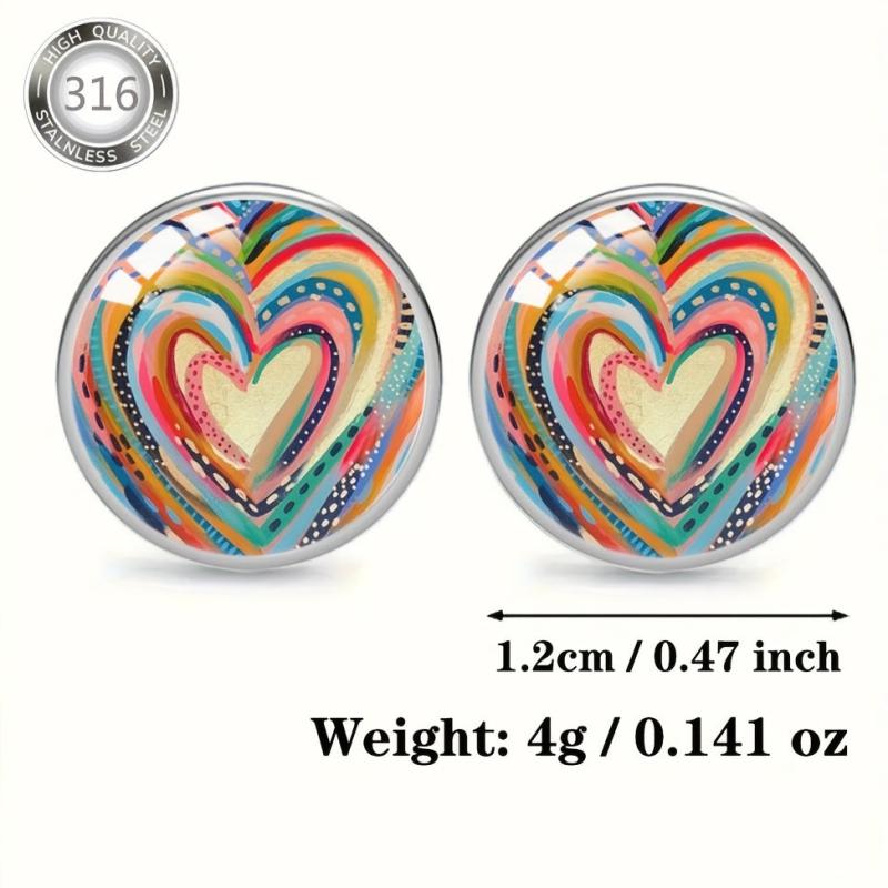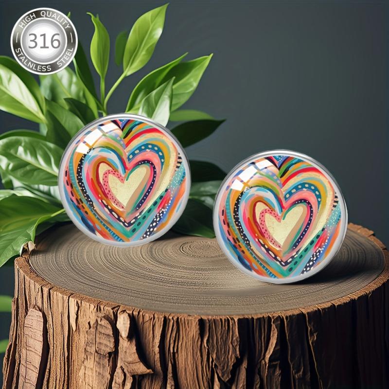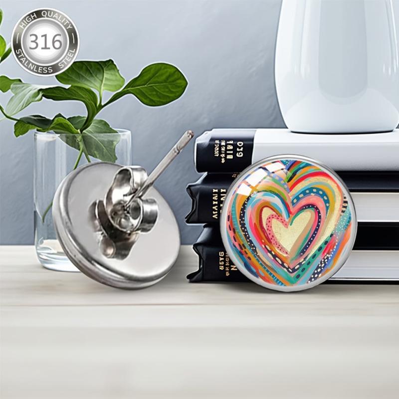 Add a pop of color to your look with these unique hand-painted heart-shaped stud earrings. The vibrant swirls and bead accents are protected by a convex glass inlay.