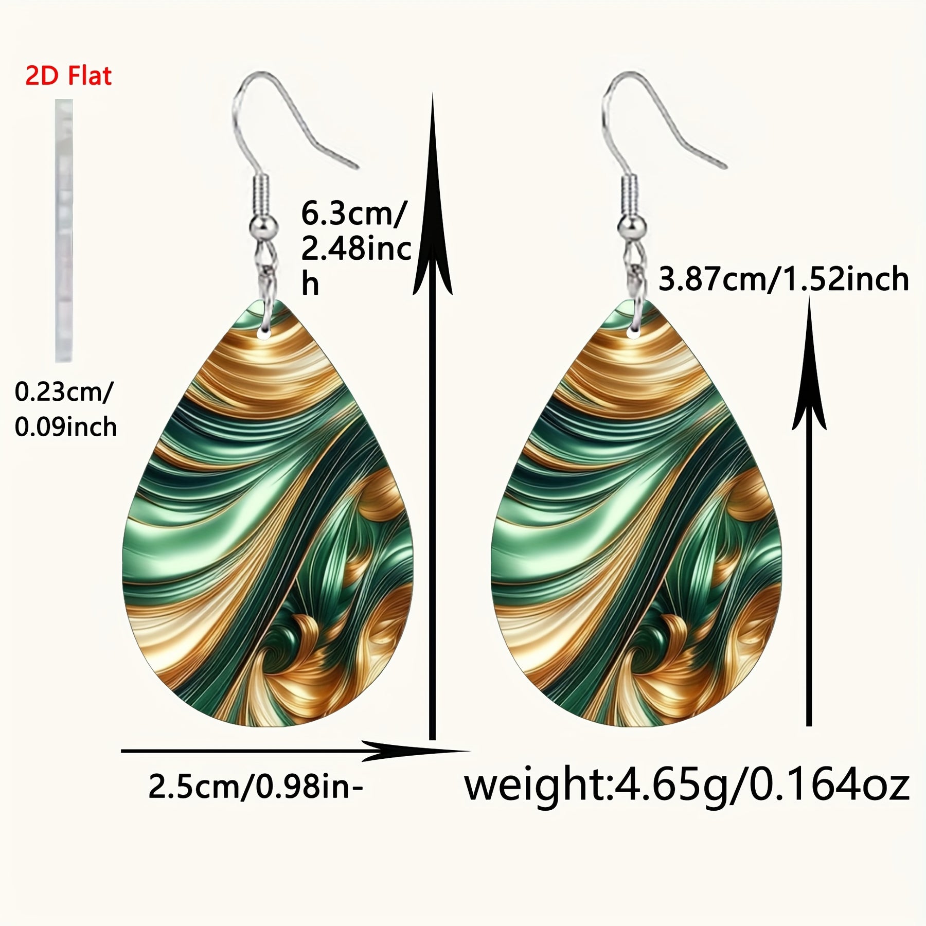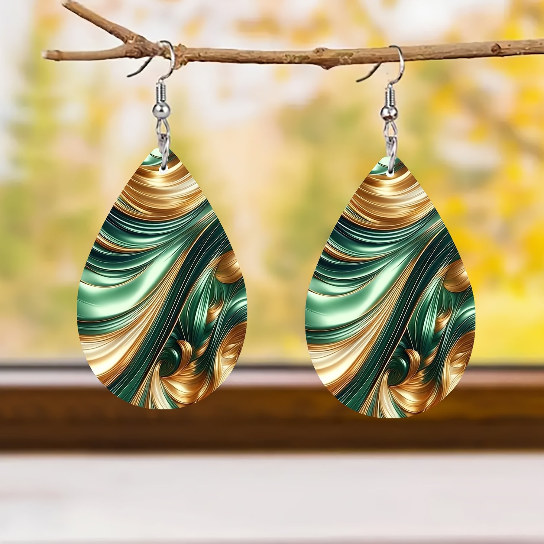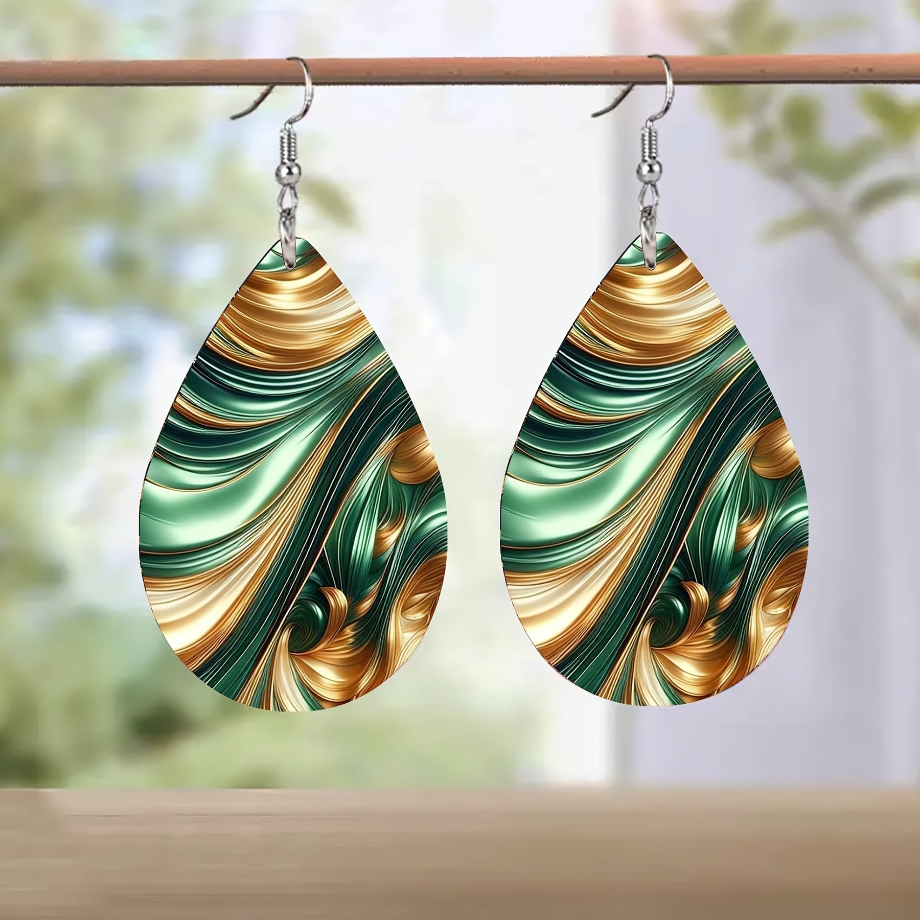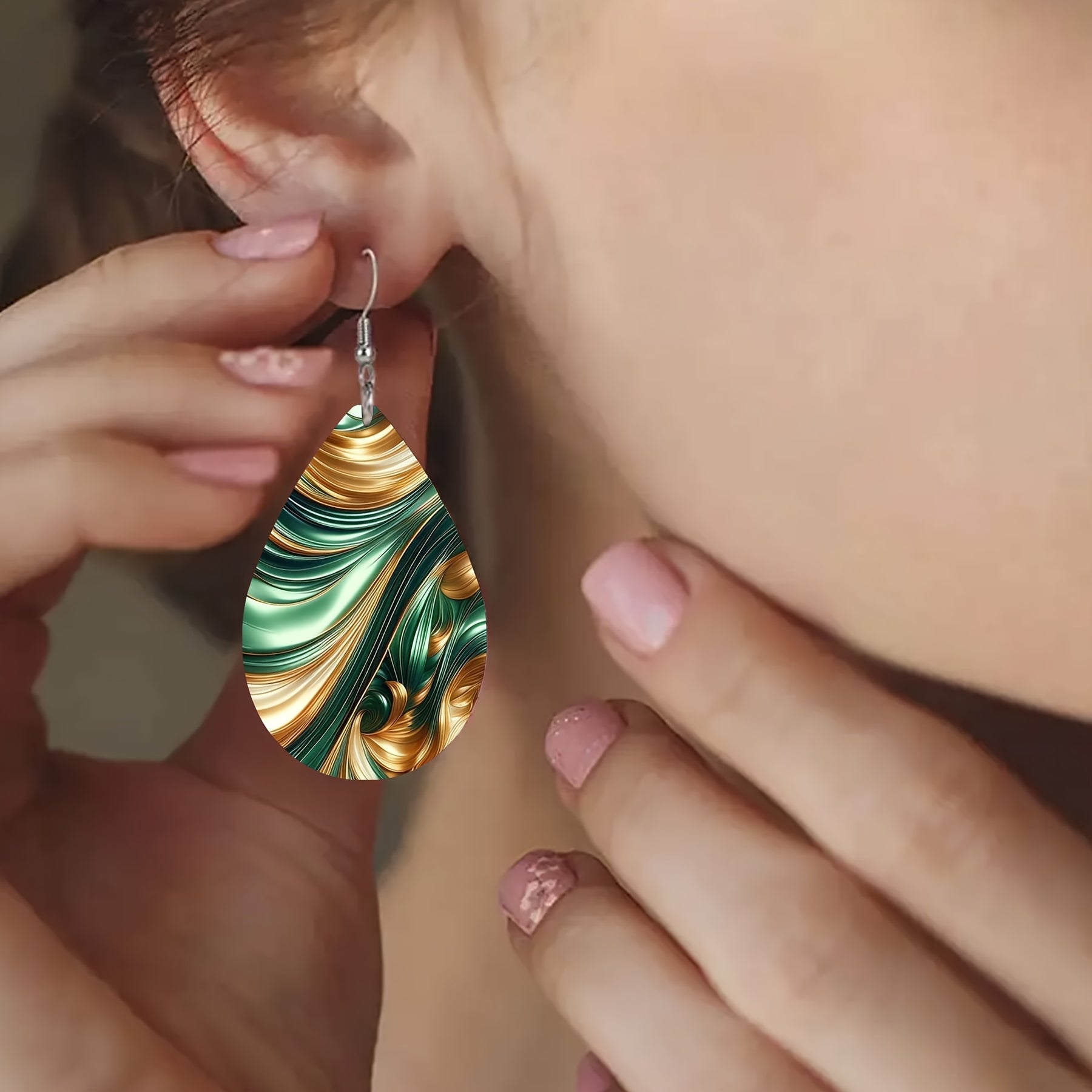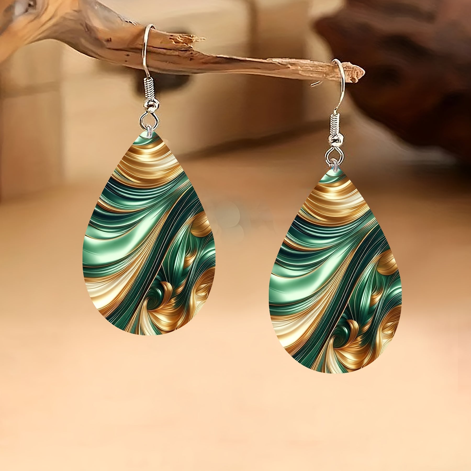 These teardrop earrings feature a marbled green and golden wave design. Perfect for April birthstone jewelry, lightweight for everyday wear.