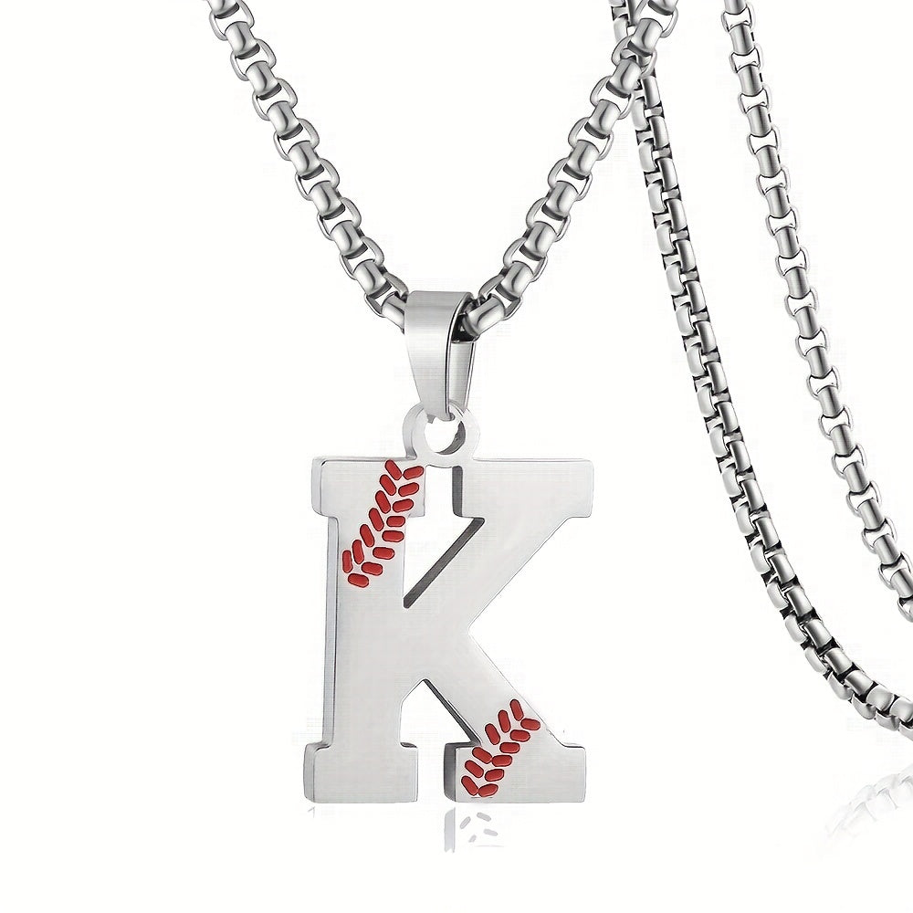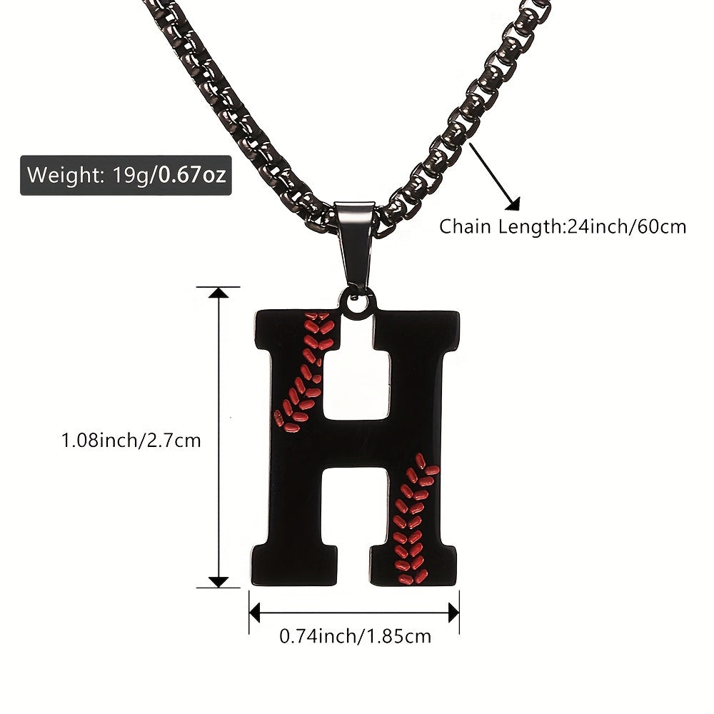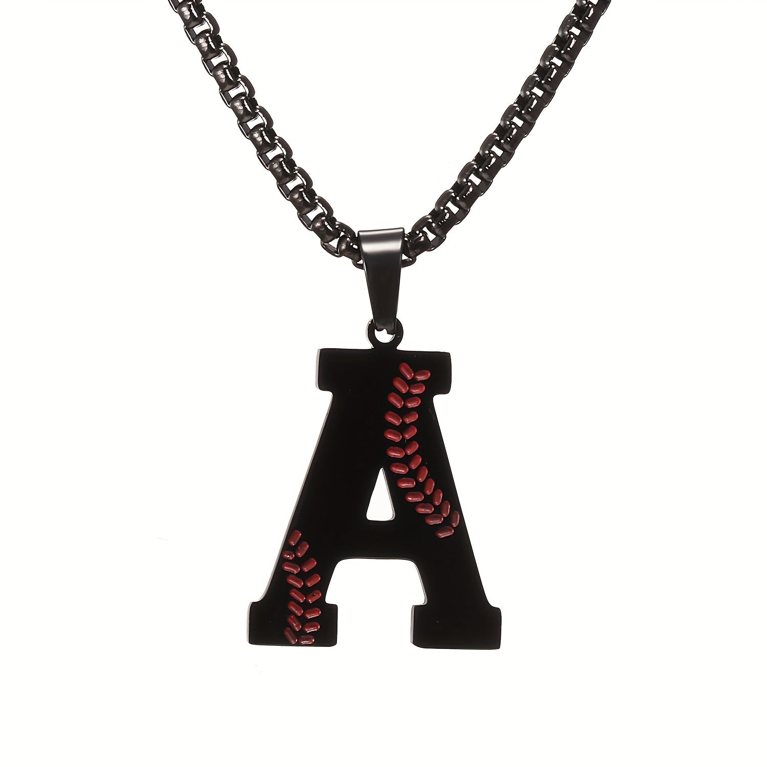 Stylish baseball initial necklace featuring letter A pendant, perfect for both men and women. Made of high-quality titanium and stainless steel in a silvery finish.