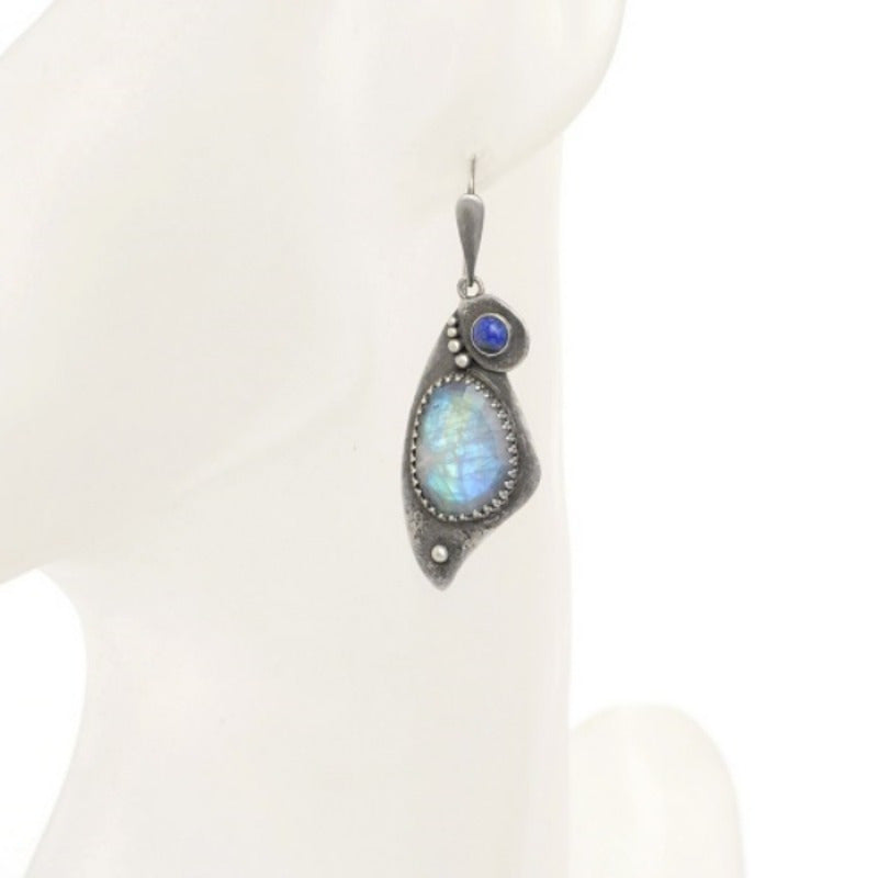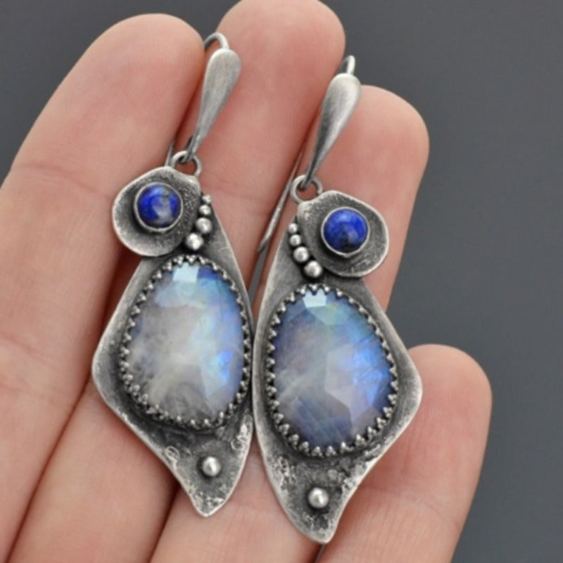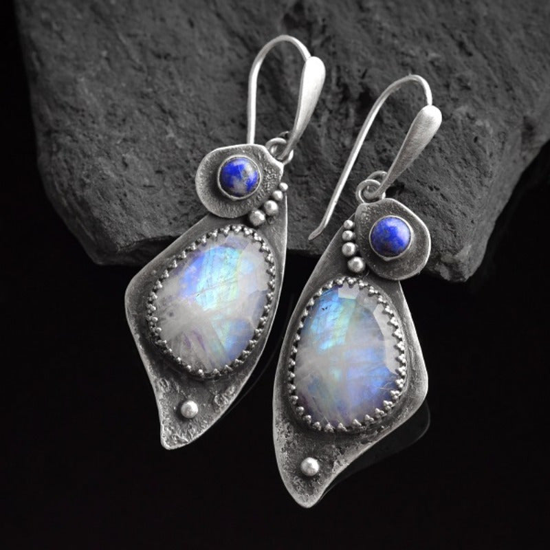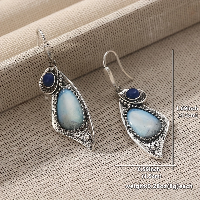 Vintage bohemian style copper earrings featuring hand-carved irregular pattern and synthetic opal teardrop pendants. These dangle earrings are golden plated and perfect for women.