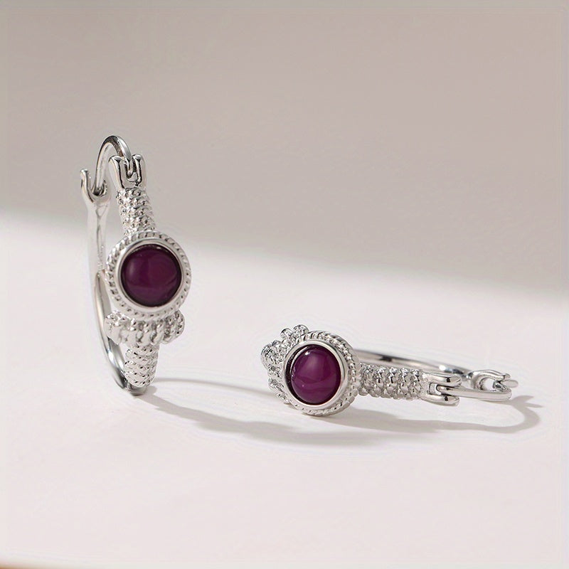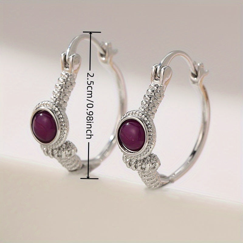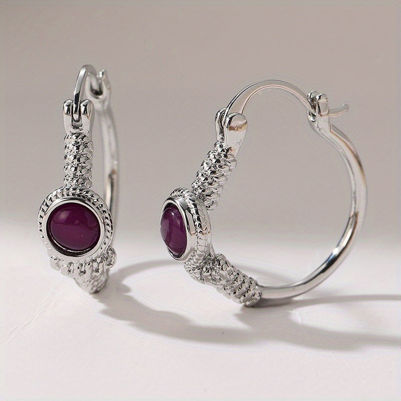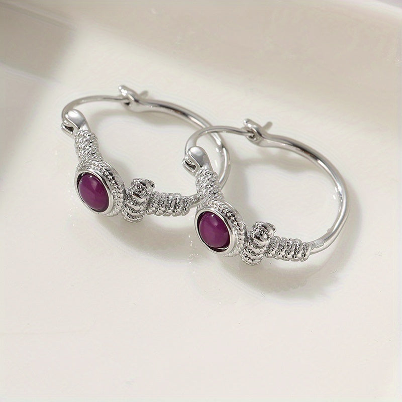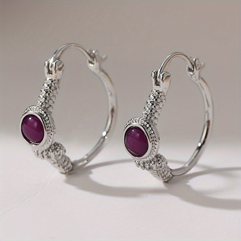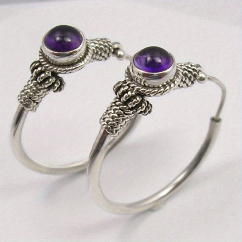 Add a touch of vintage charm to your casual attire with these hypoallergenic copper hoop earrings featuring purple gemstones. The retro design adds a quirky and unique flair to your look.