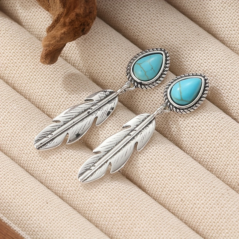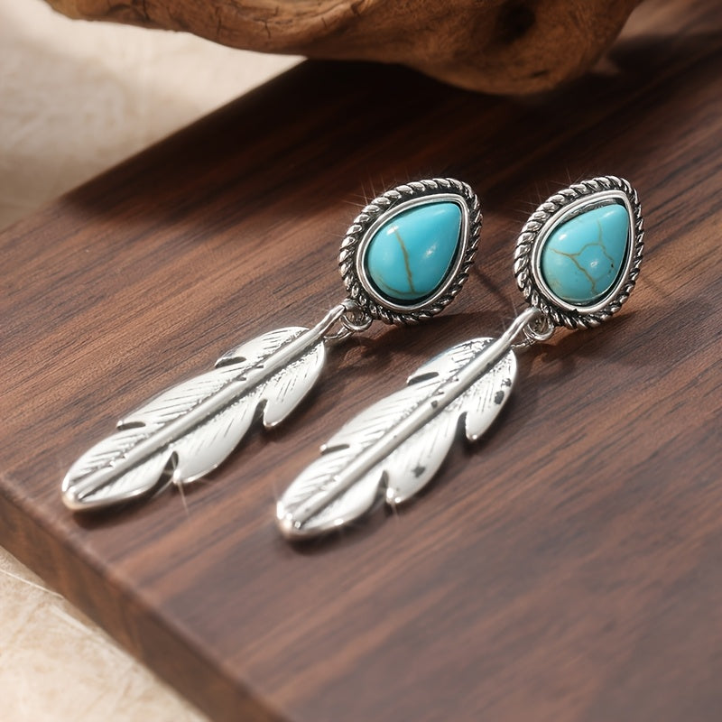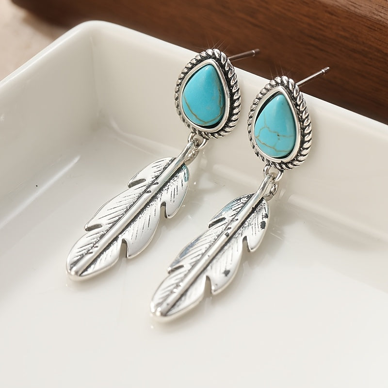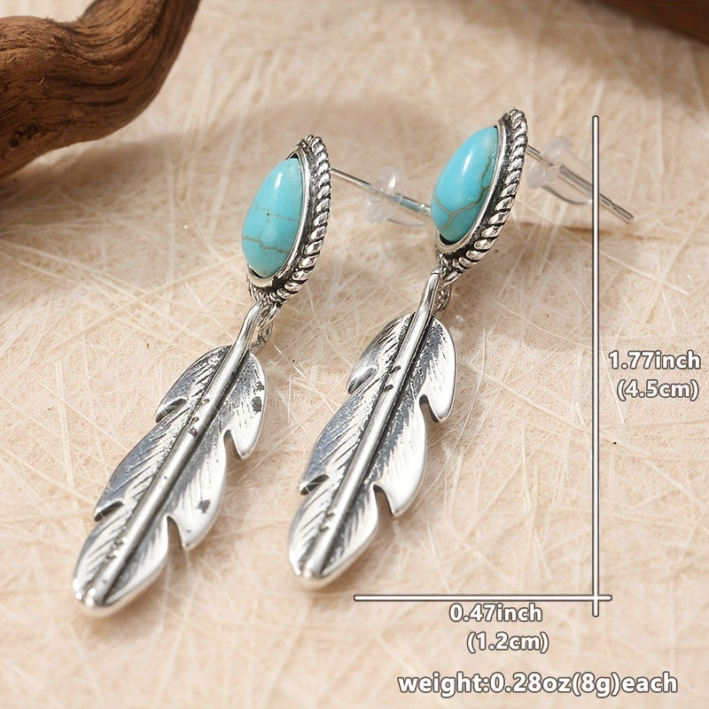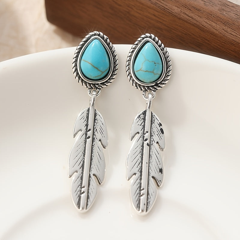 Vintage copper dangle earrings featuring synthetic turquoise in a leaf shape, ideal for casual wear or vacations.