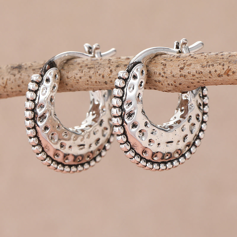 Vintage-inspired half circle hammered copper hoop earrings with a boho flair. These durable earrings are perfect for daily wear and make a great gift for any occasion.
