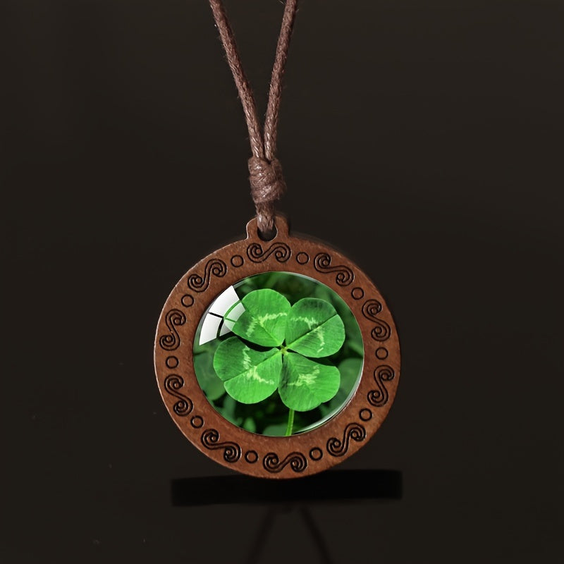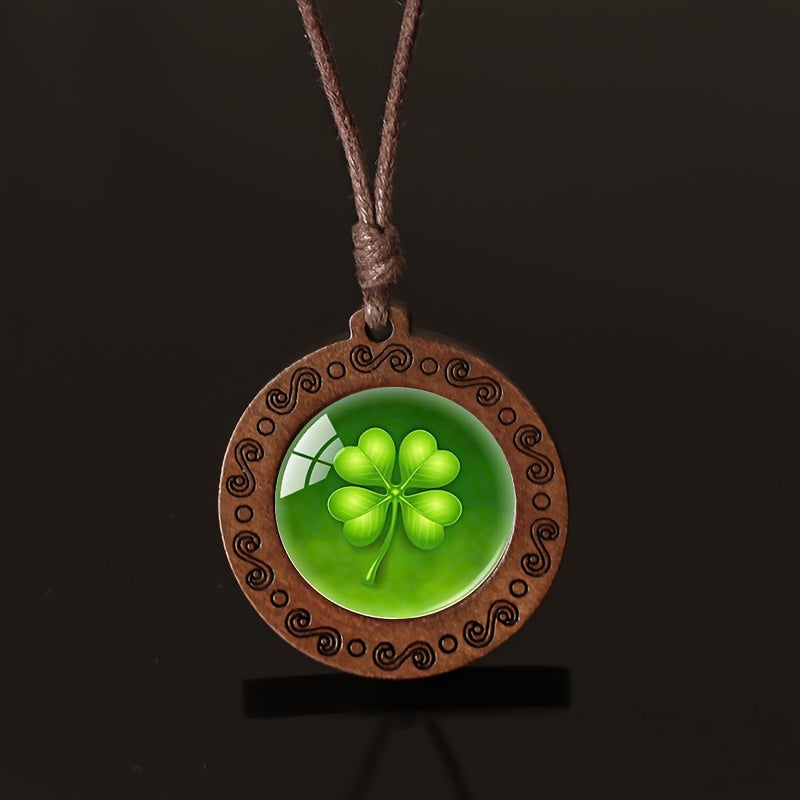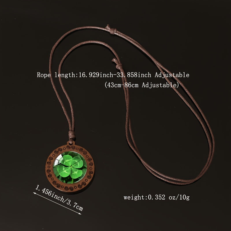 This bohemian style necklace features a wooden design with a beautiful glass clover pendant, making it a unique and lucky charm accessory for both men and women.