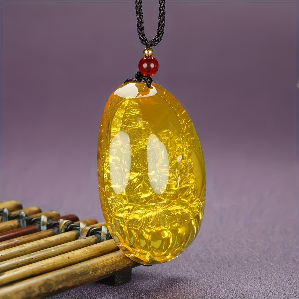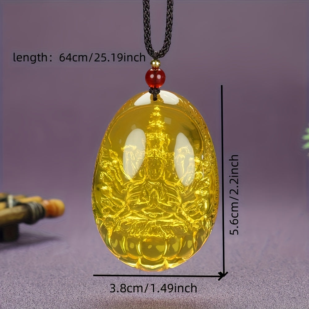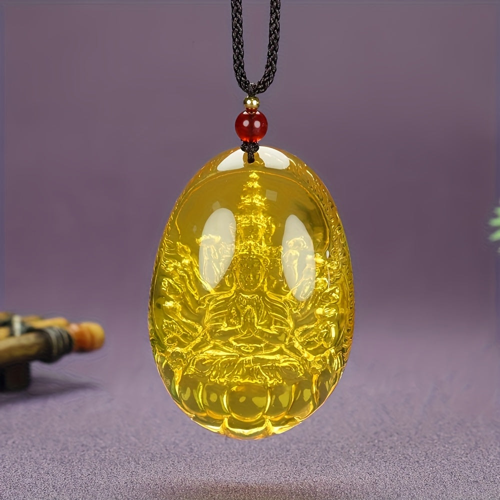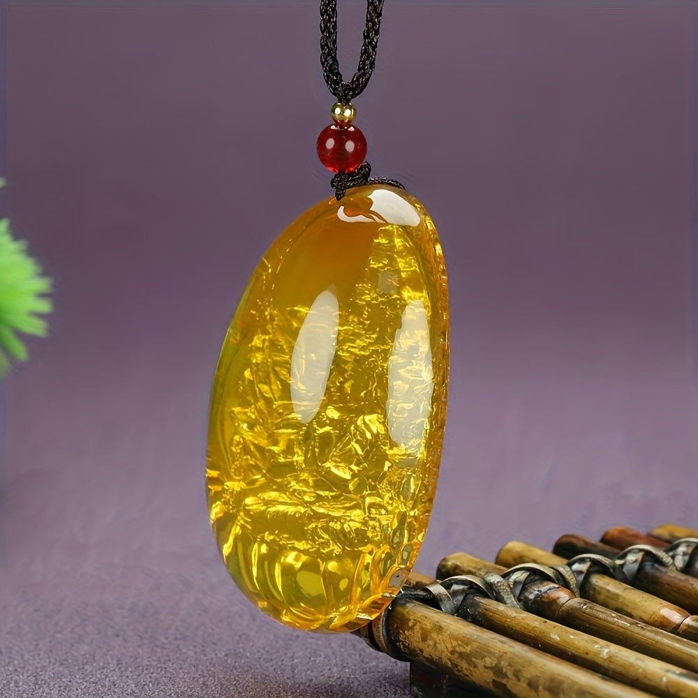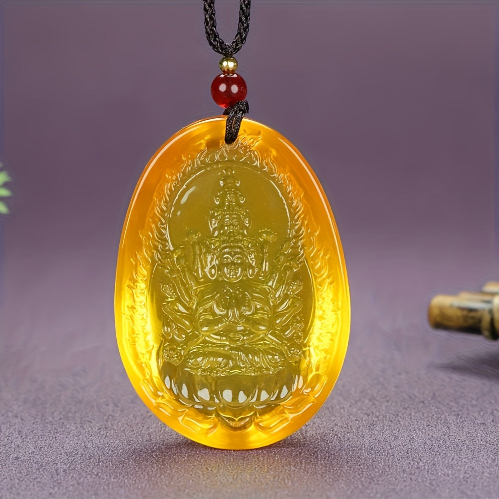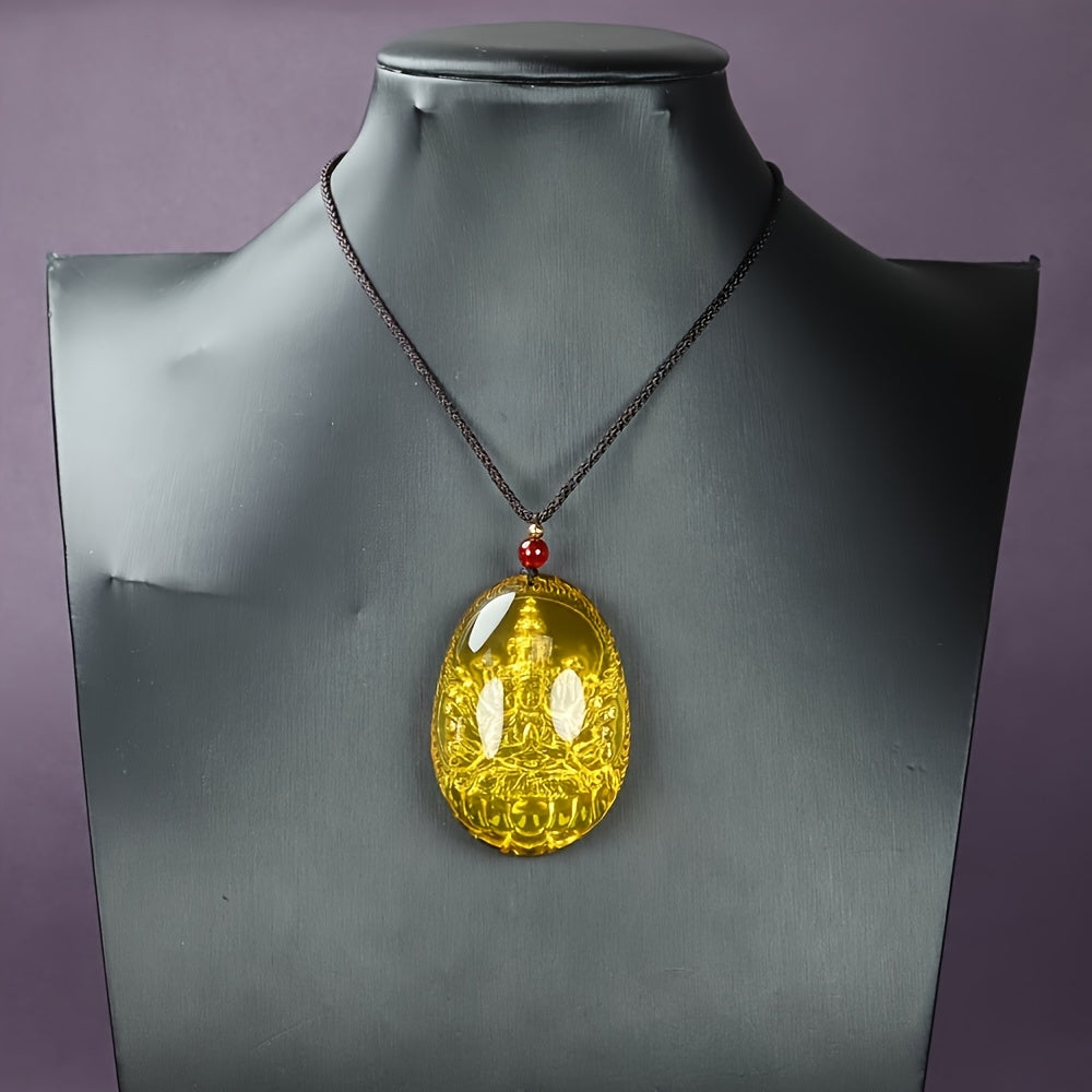 Embrace spiritual charm with this Bohemian style pendant necklace featuring a golden-inspired agate stone with intricate carving on a cord chain.