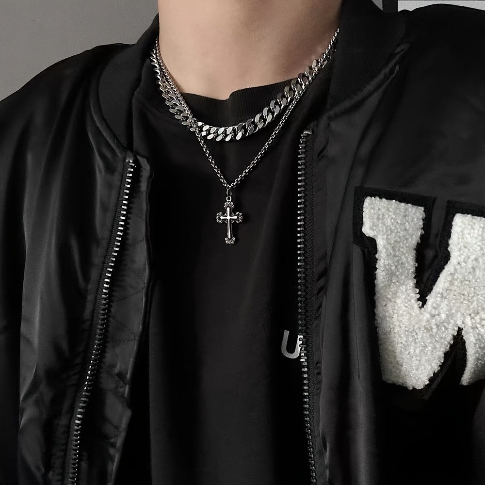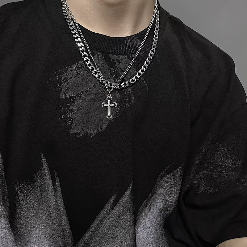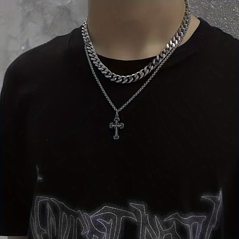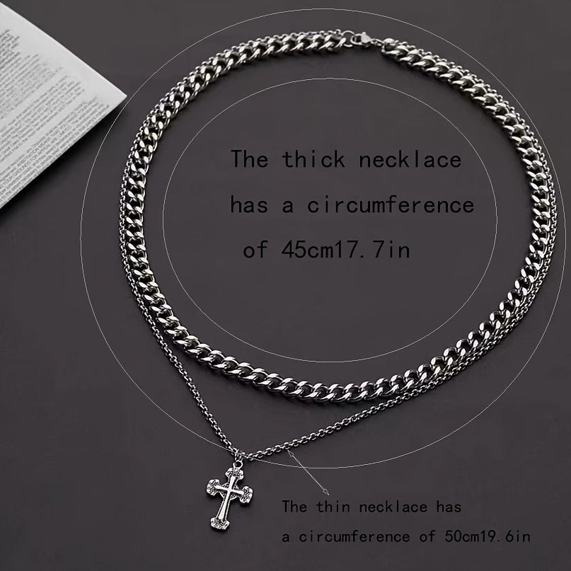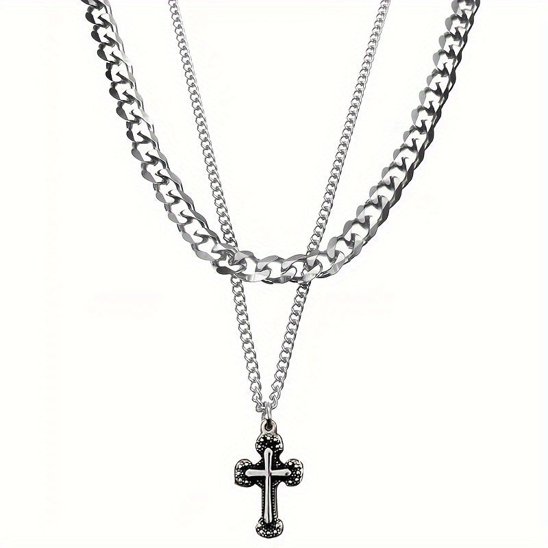 This stylish double layer necklace features a cross pendant, perfect for adding an edgy touch to any outfit.