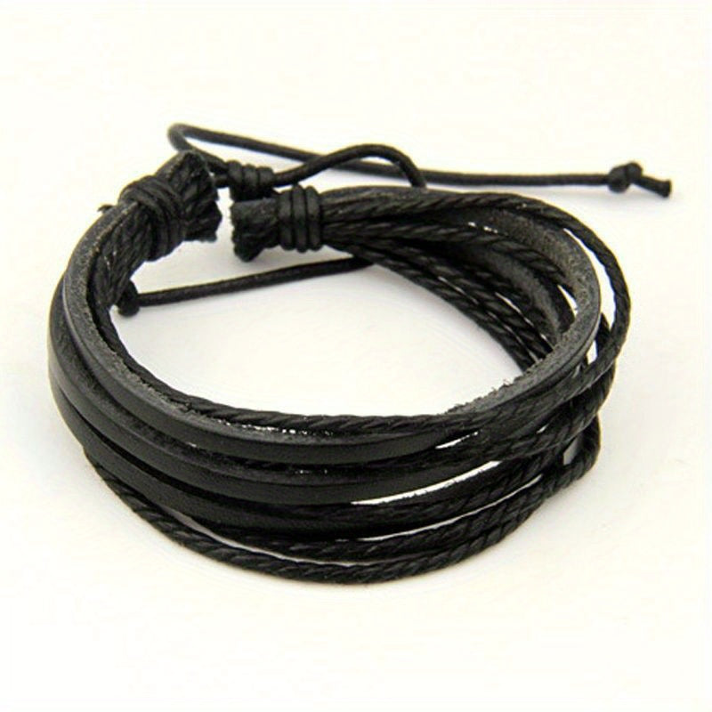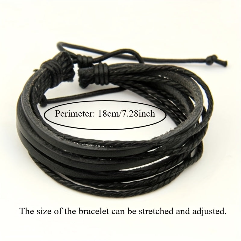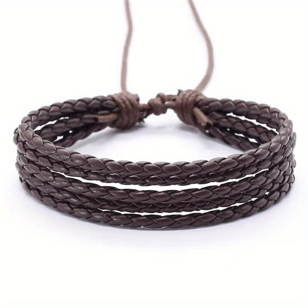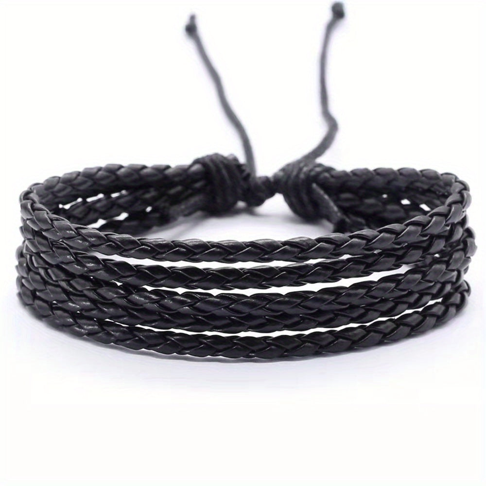 This braided faux leather bracelet features a punk Cuban chain style woven design. It is adjustable to fit different wrist sizes.