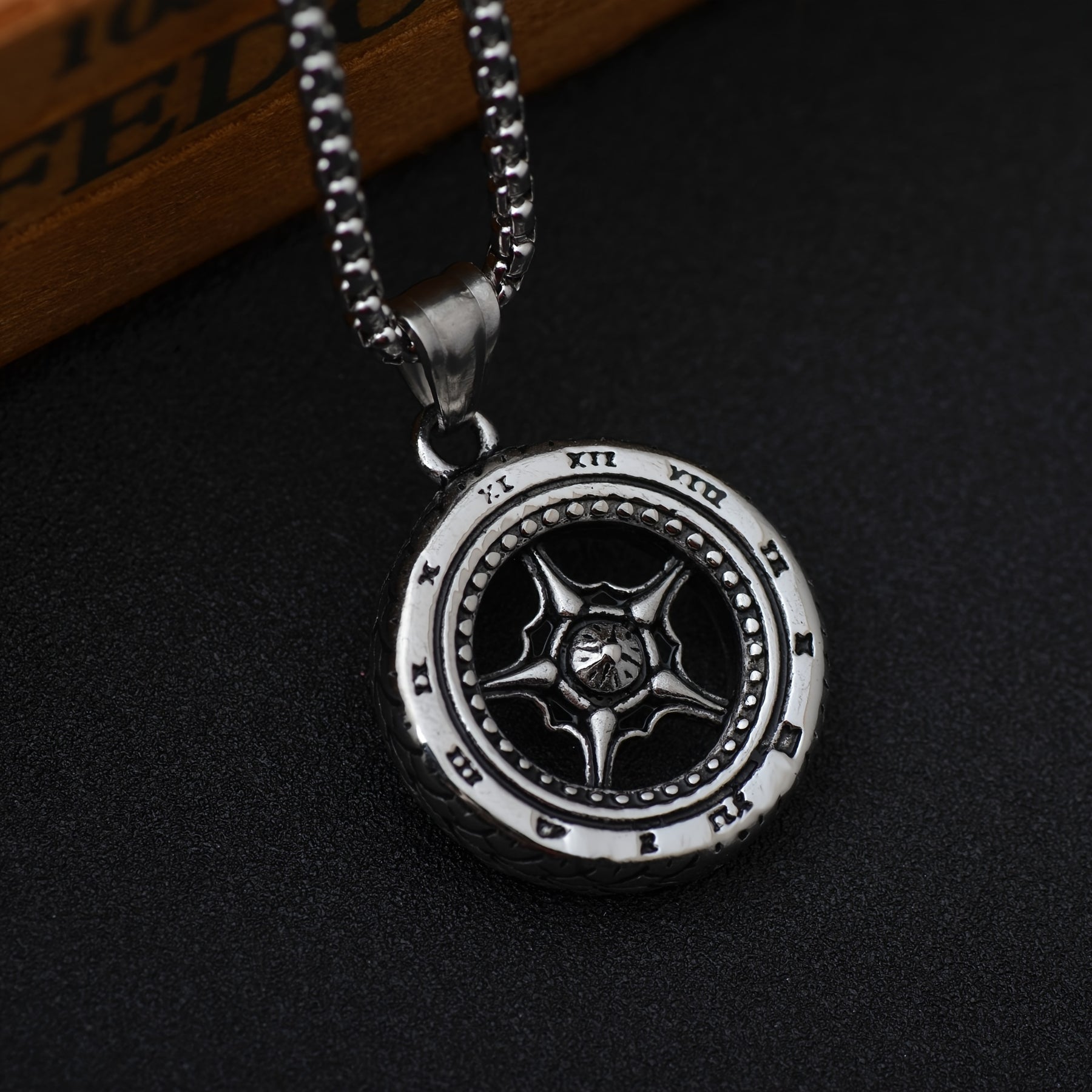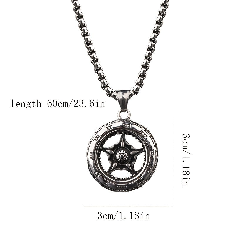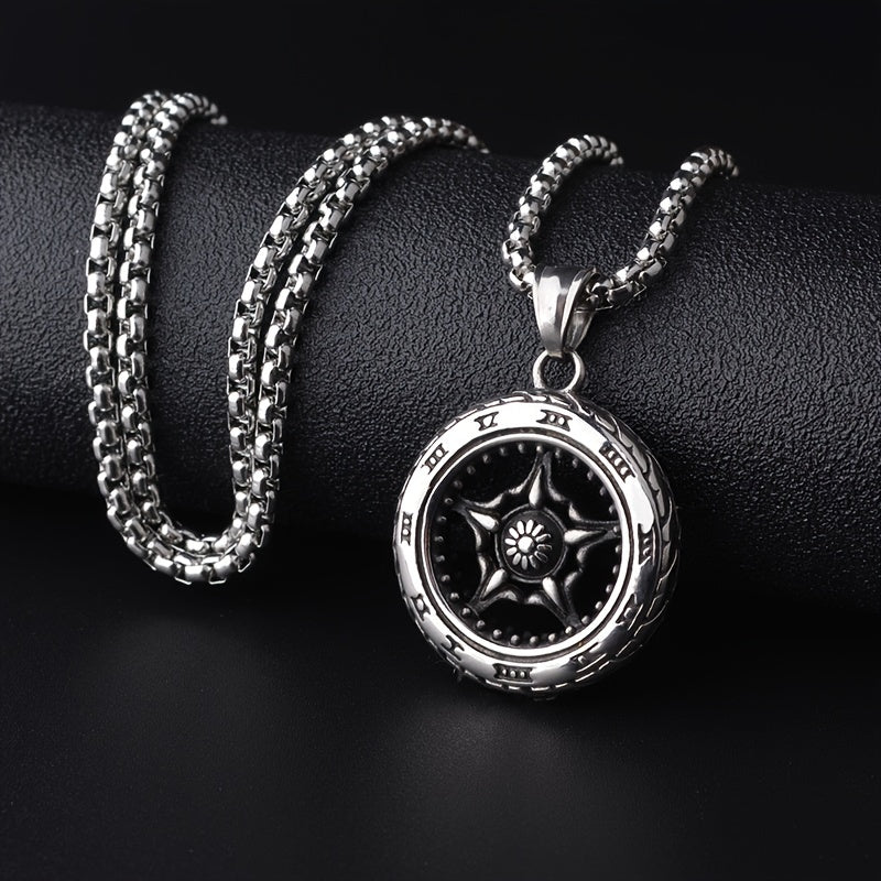 This pendant necklace features a car tire shape design, made of titanium steel. It's a stylish accessory for men's sweater chains.