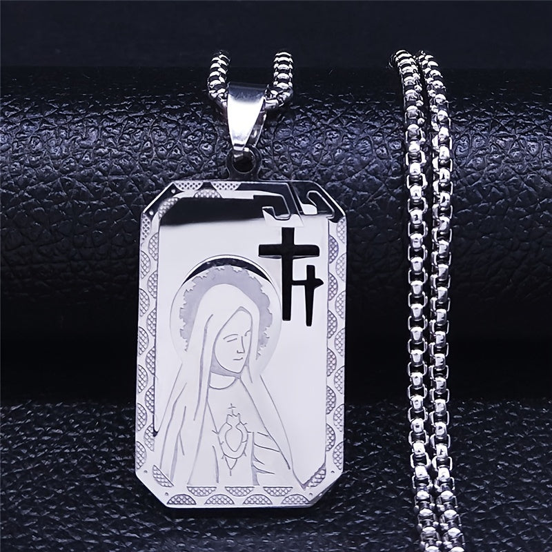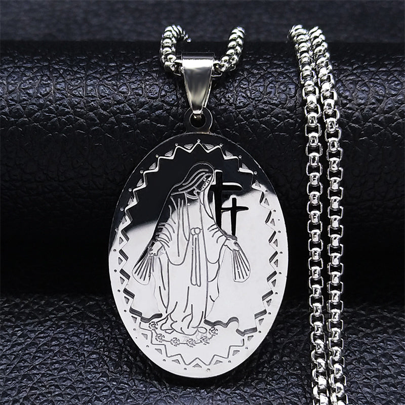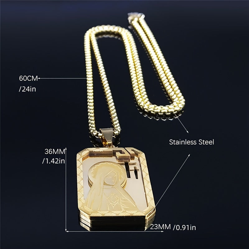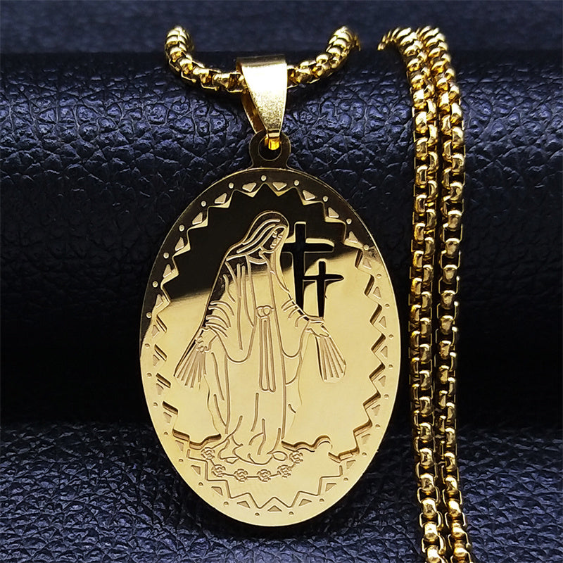 This stainless steel necklace features a Catholic Goddess Cross with Virgin Mary design, suitable for both men and women. The golden multilayer chain adds elegance to any outfit.