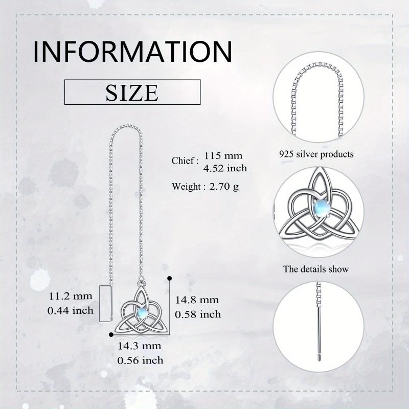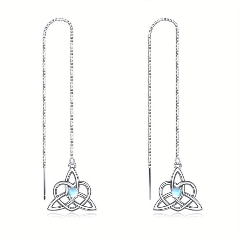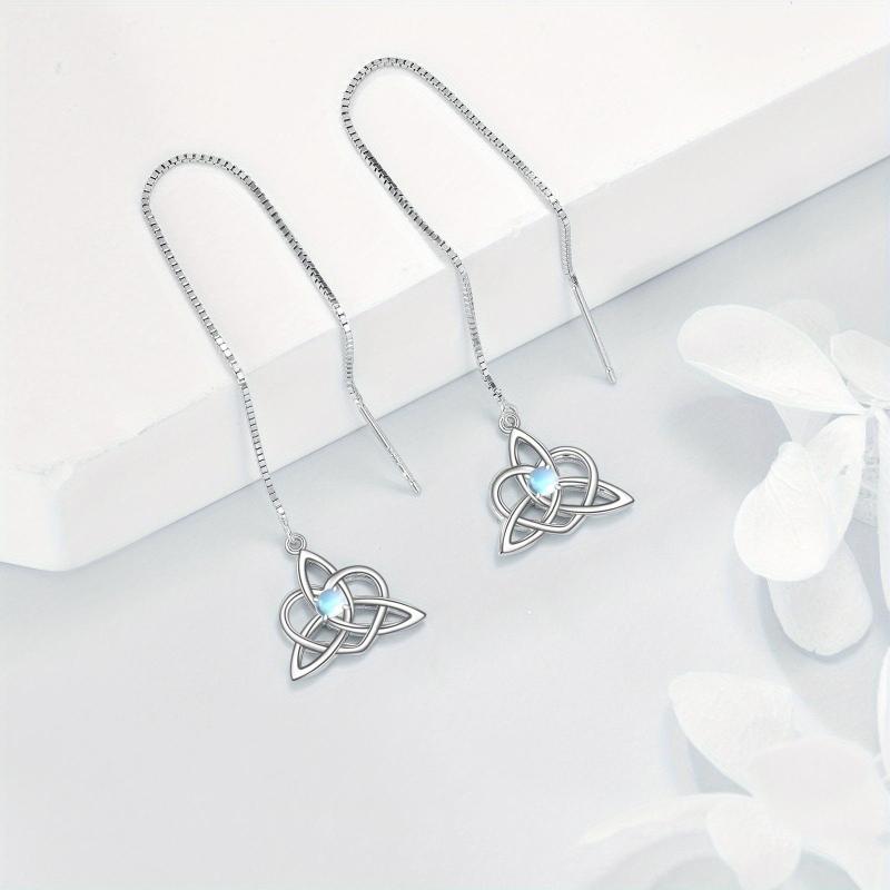 These Celtic threader earrings are crafted from 925 sterling silver with intricate Irish knot designs and moonstone accents. Perfect for adding a touch of Celtic charm to your look.