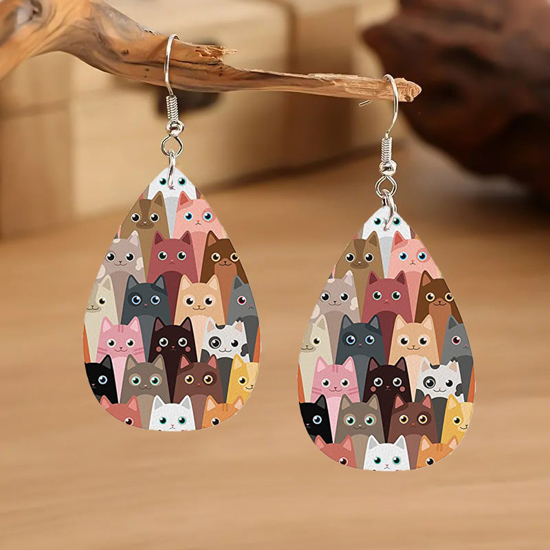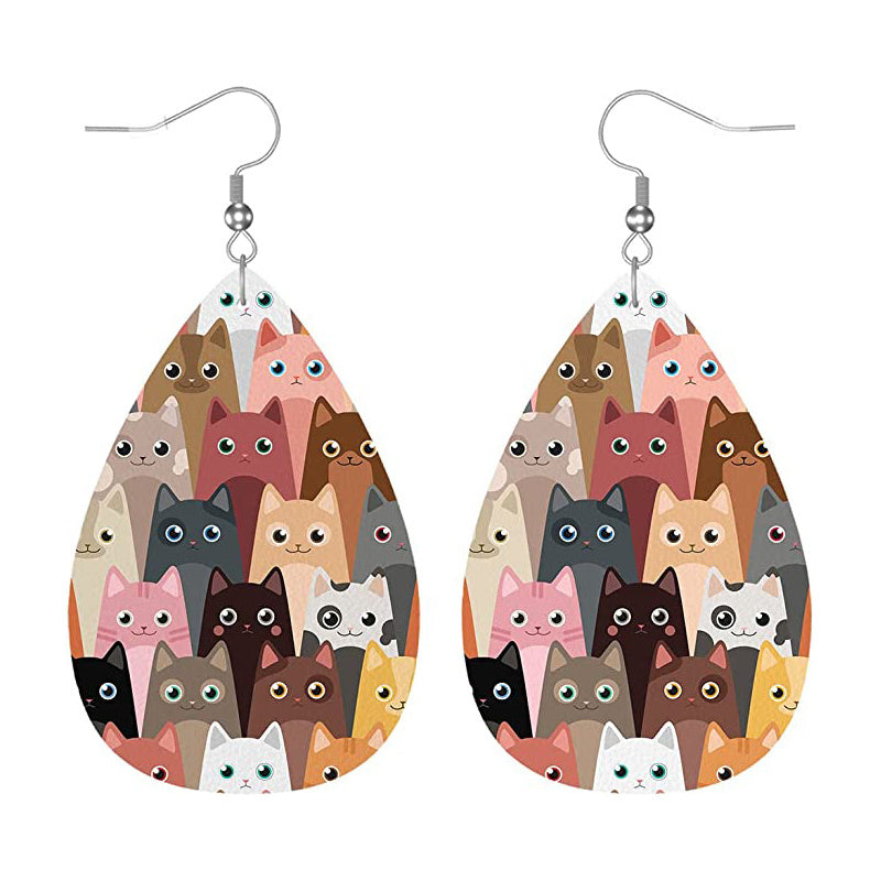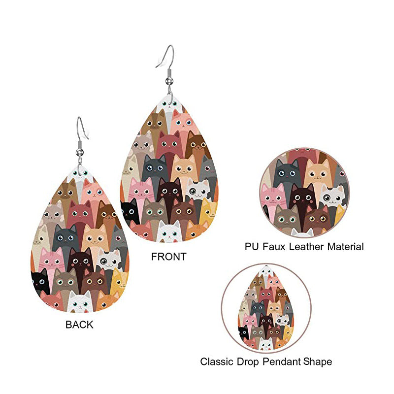 Adorn yourself with these cute cat print teardrop earrings made of PU leather, perfect for daily wear and adding a pop of color to your outfit.