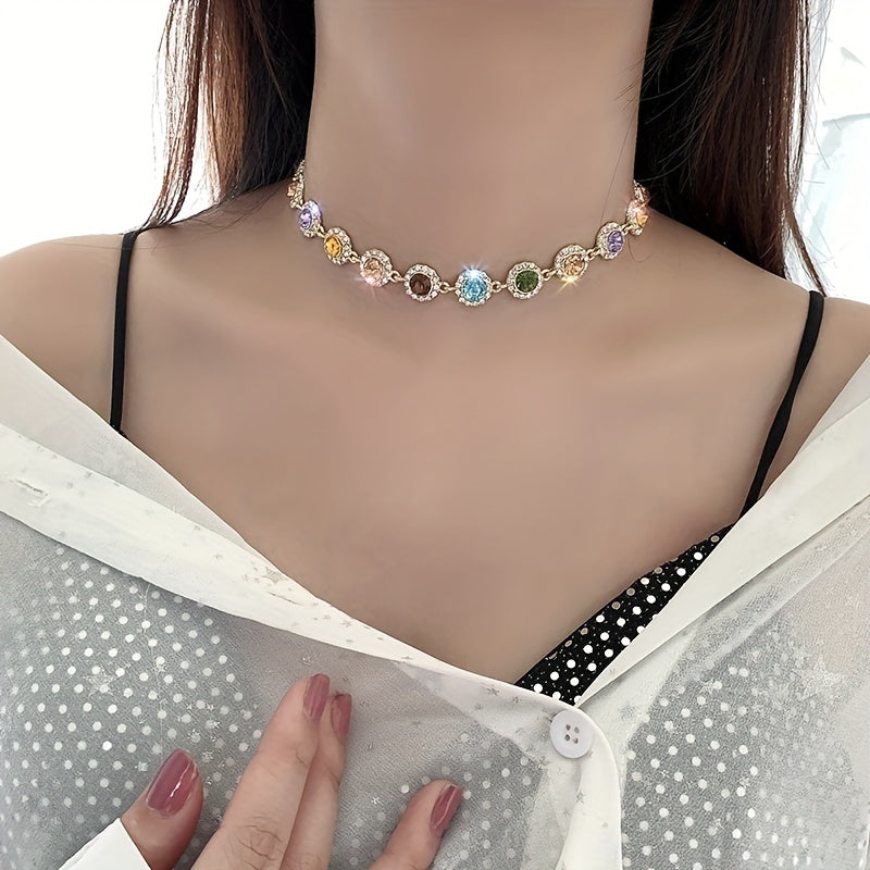 Add a pop of color to your outfit with this stunning rhinestones necklace. Made with high-quality 14K plated materials, this necklace is a perfect gift for any jewelry lover.