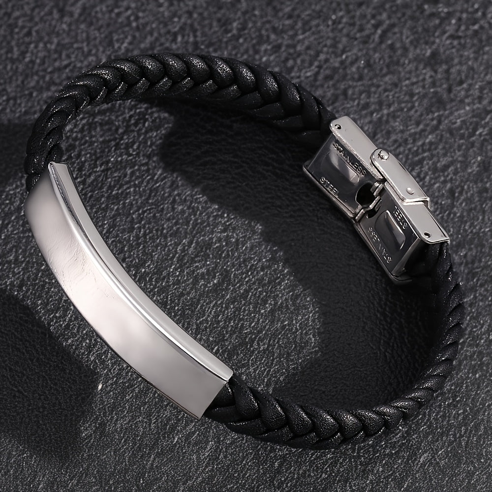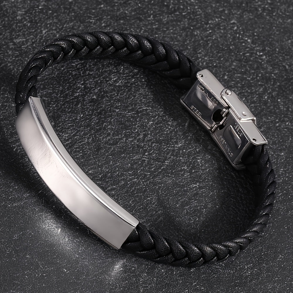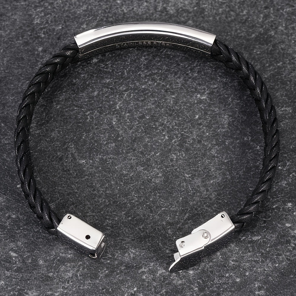 A sleek and stylish men's leather bracelet with custom text engraving made of durable 304 stainless steel. Perfect for events, logos, friends, and family. A unique and thoughtful gift for any occasion.