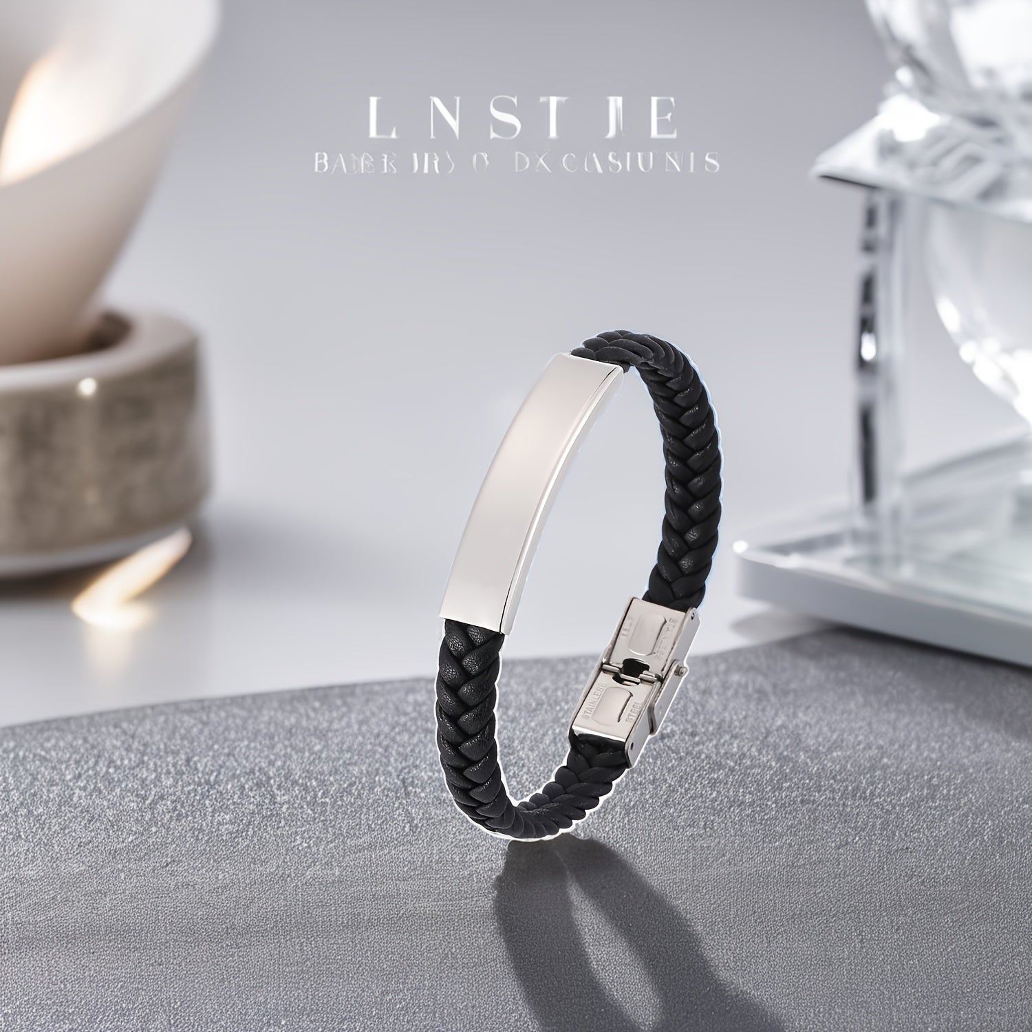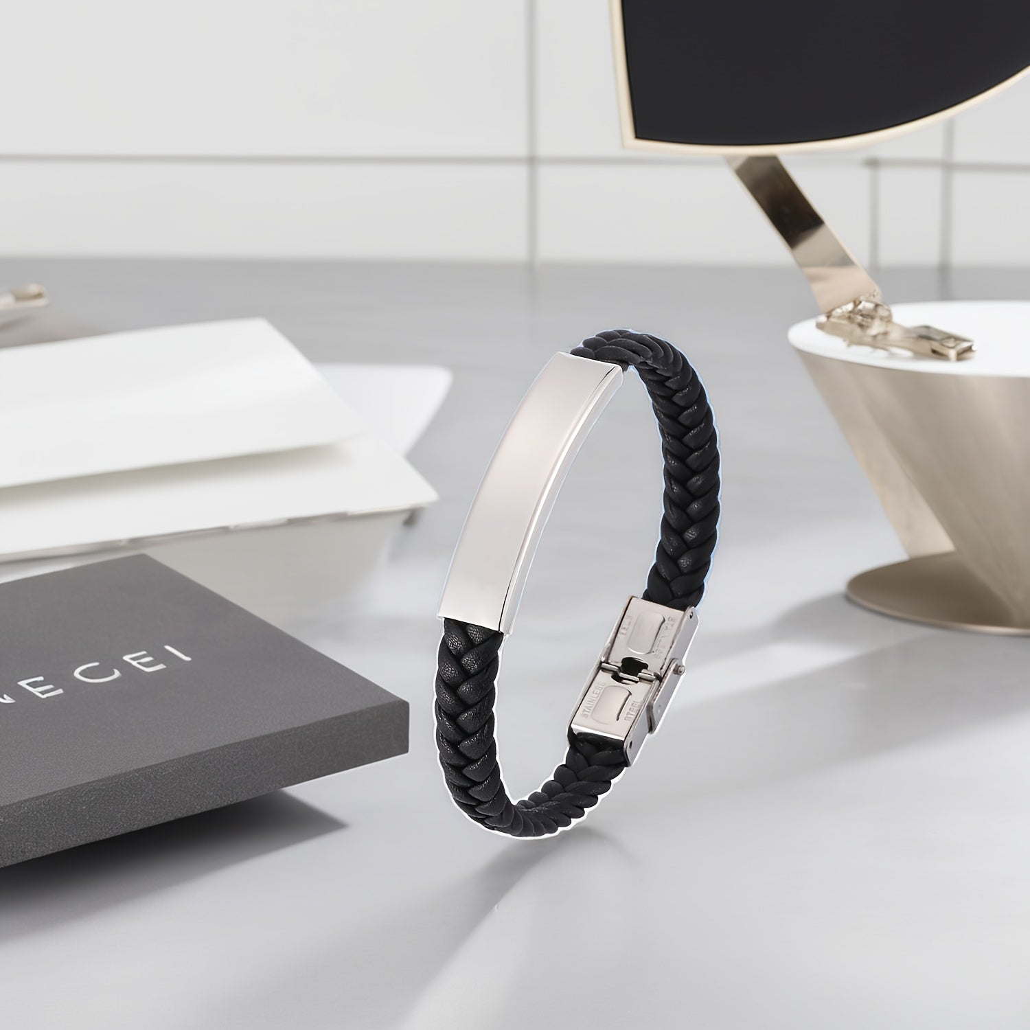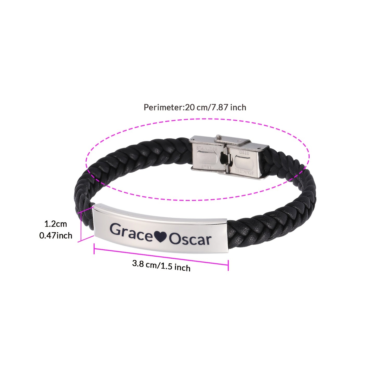A sleek and stylish men's leather bracelet with custom text engraving made of durable 304 stainless steel. Perfect for events, logos, friends, and family. A unique and thoughtful gift for any occasion.