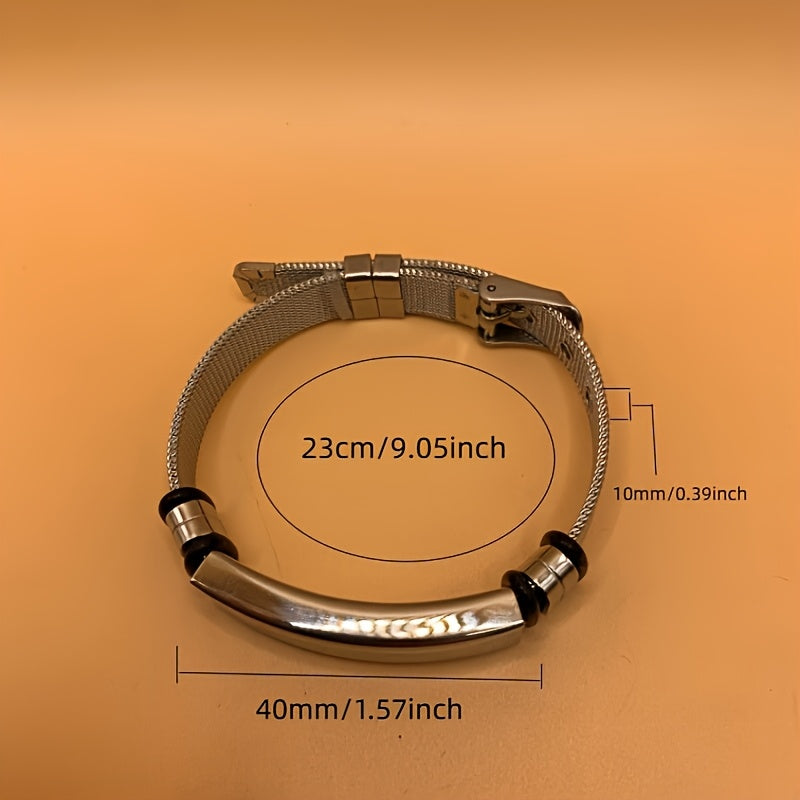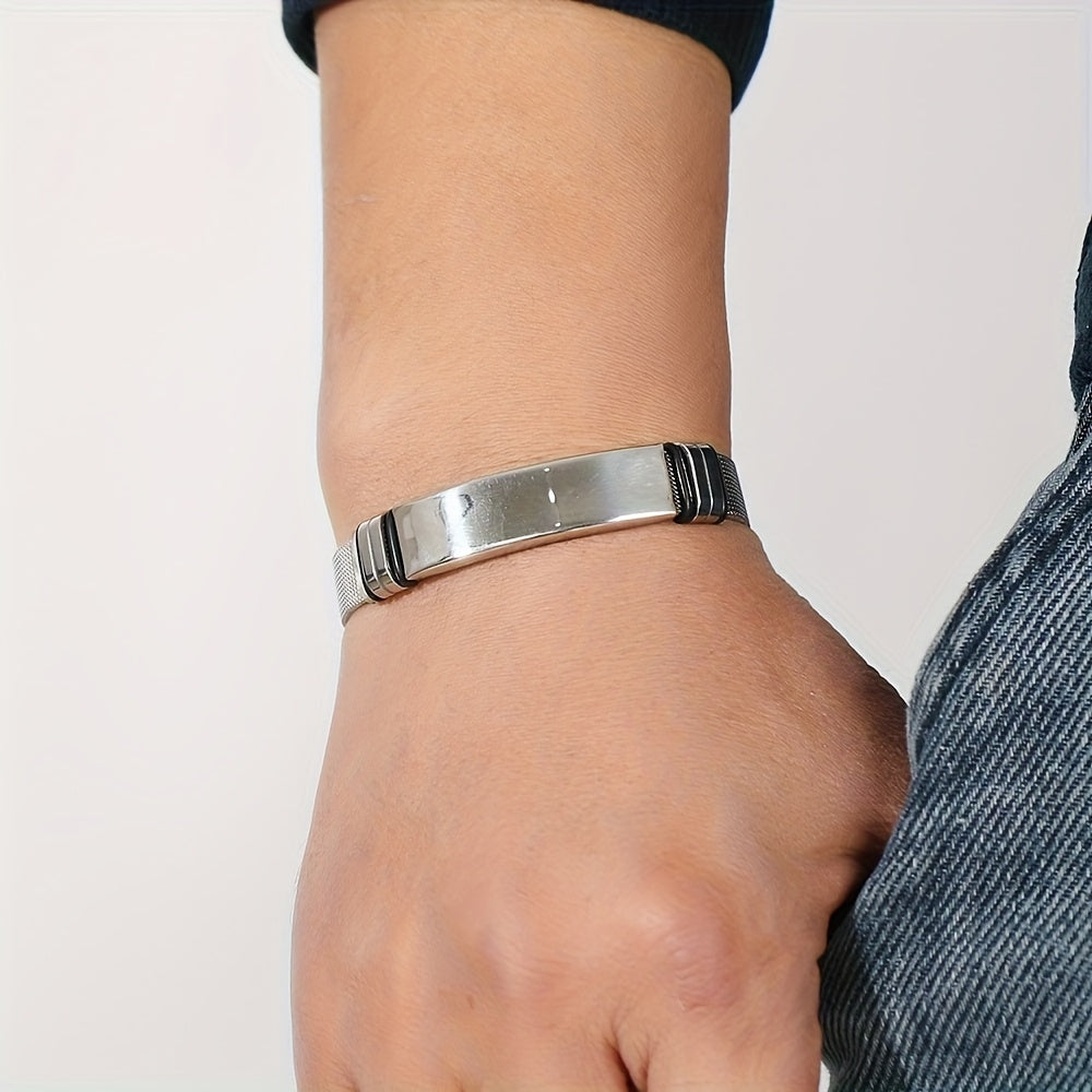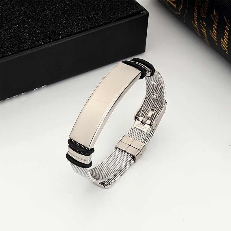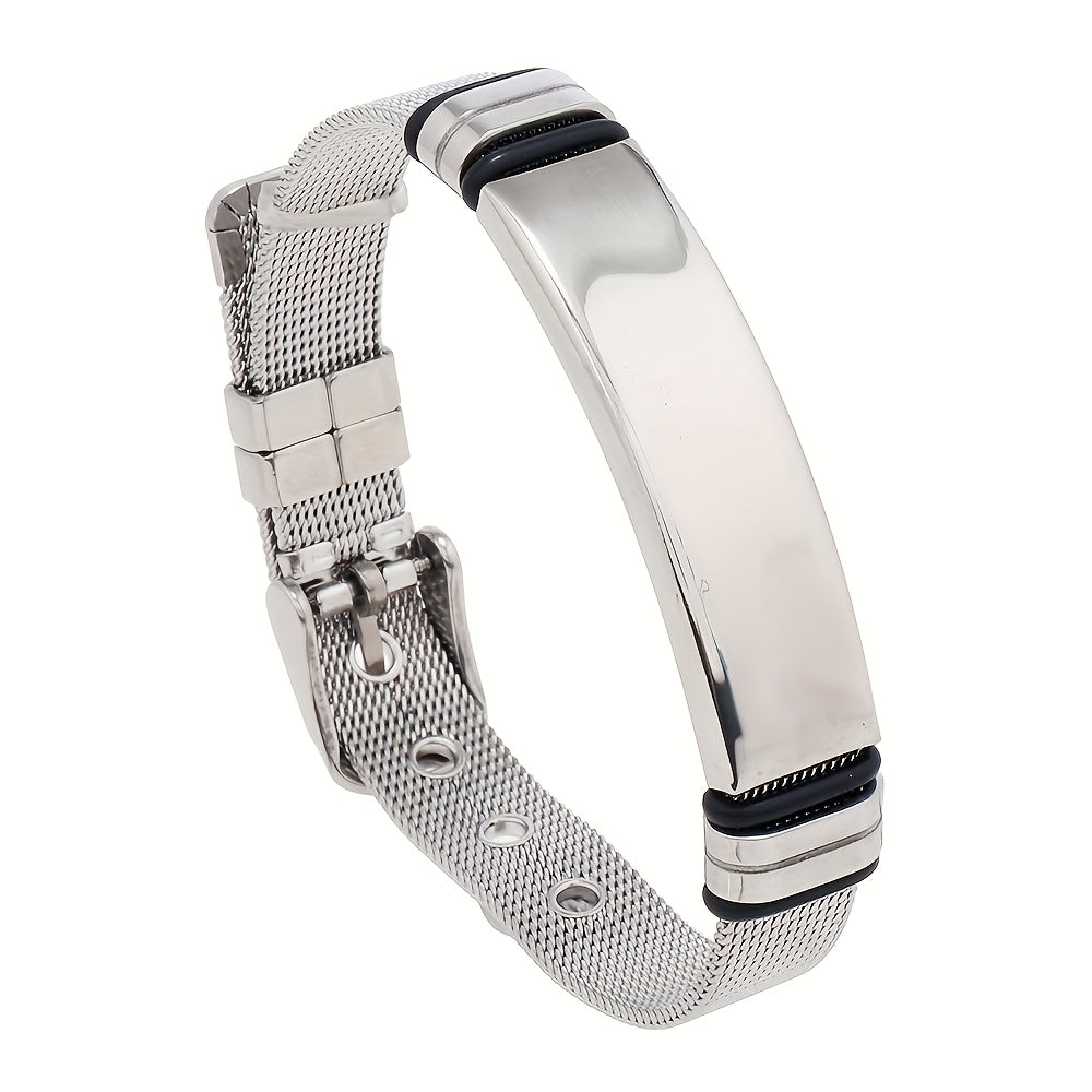 This adjustable stainless steel bracelet allows up to 3 rows of 10 characters each for personalized text.
