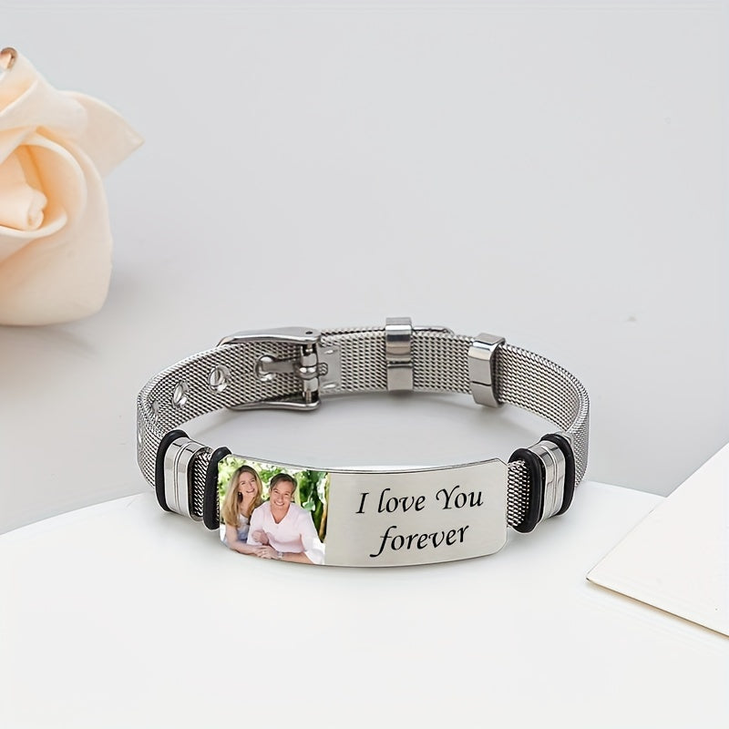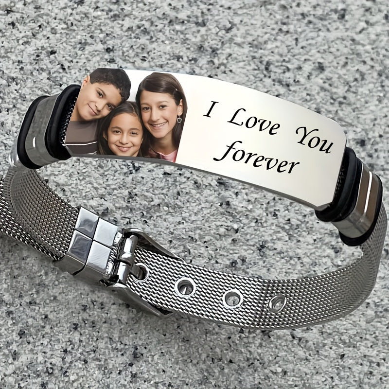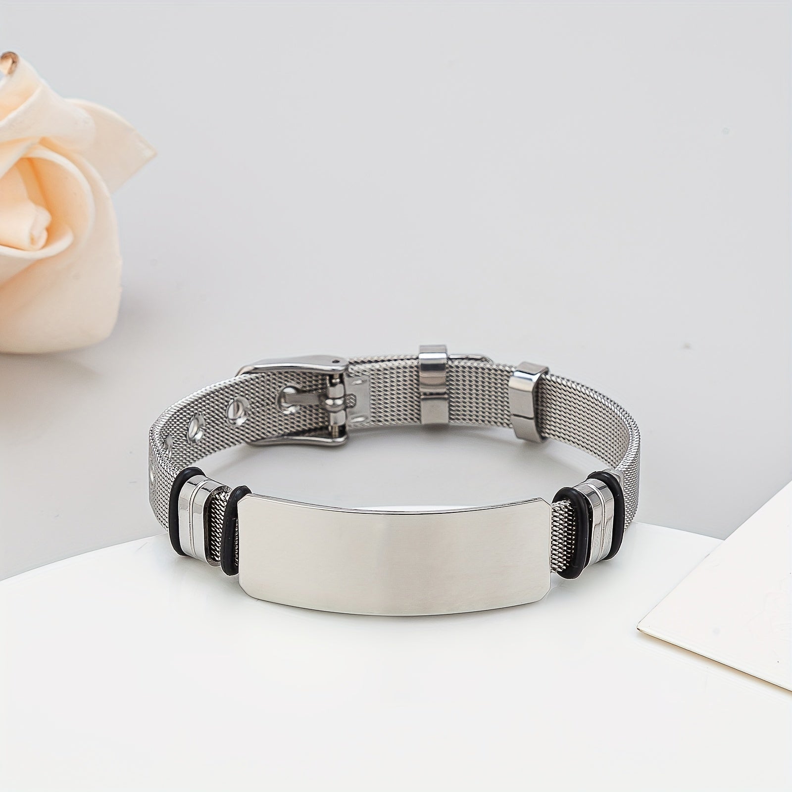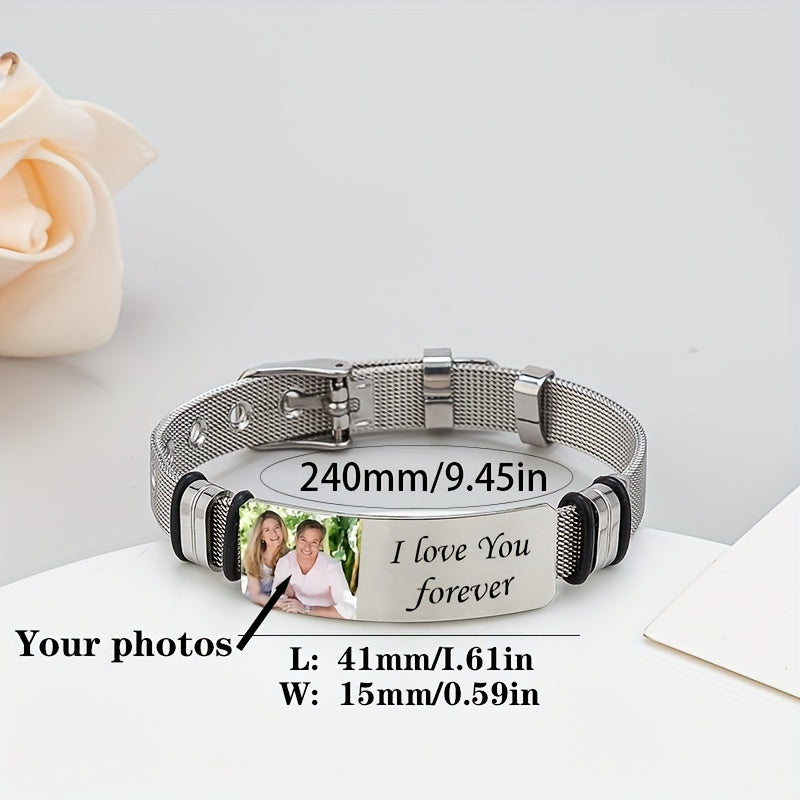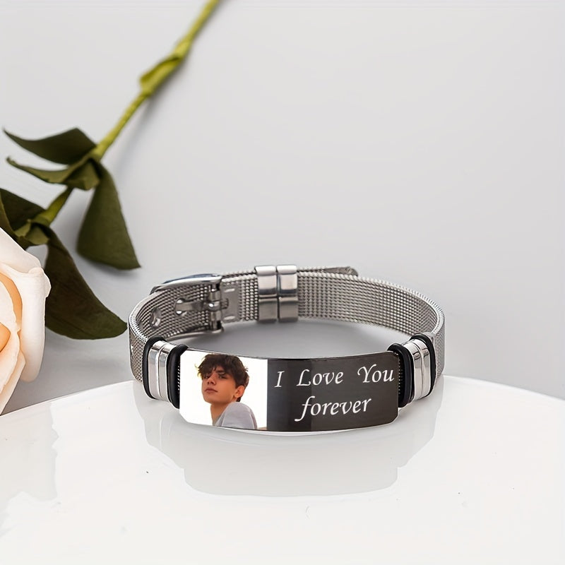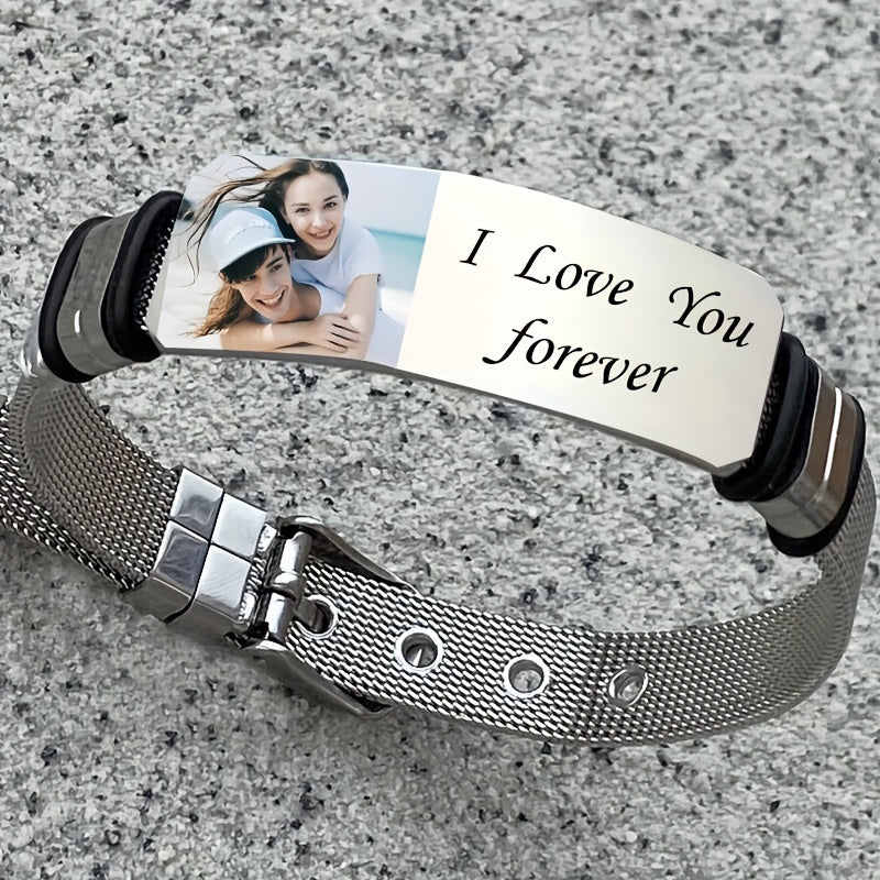 Create a personalized accessory with this adjustable 202 stainless steel bracelet featuring custom text and image engraving. The durable wide band design offers a sleek look with a metallic finish.