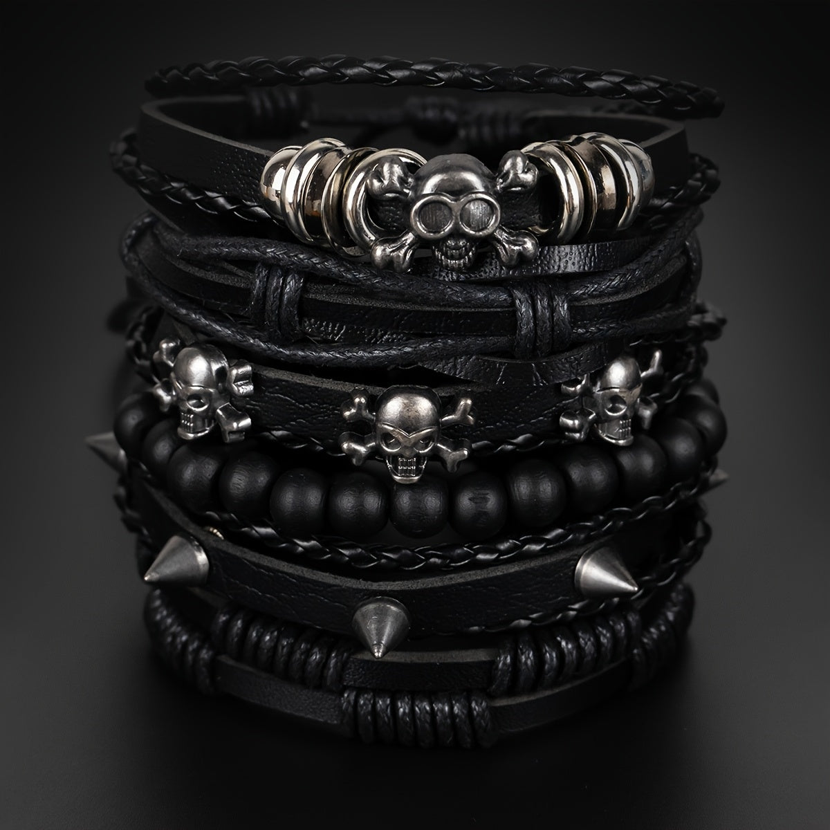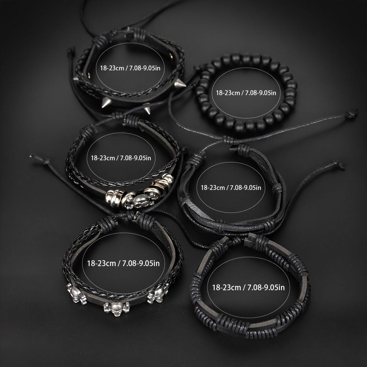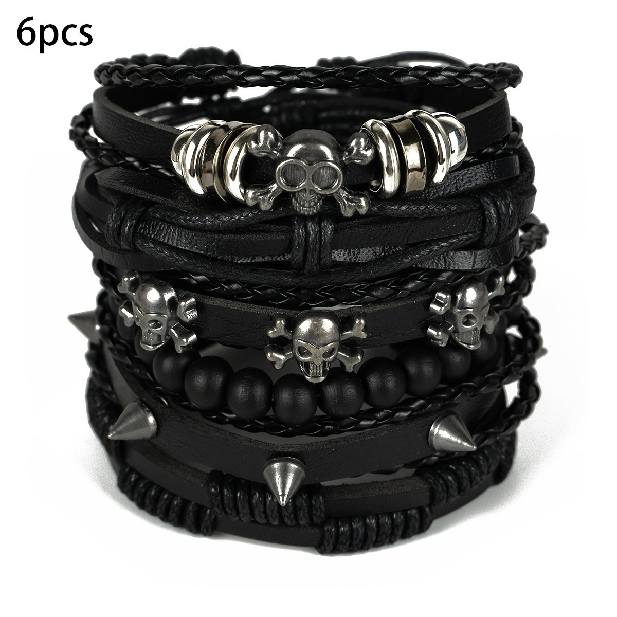 This 6-piece set of faux leather bracelets features a dark gothic punk style with beads. Suitable for daily wear or parties, it makes a perfect gift for men and women.
