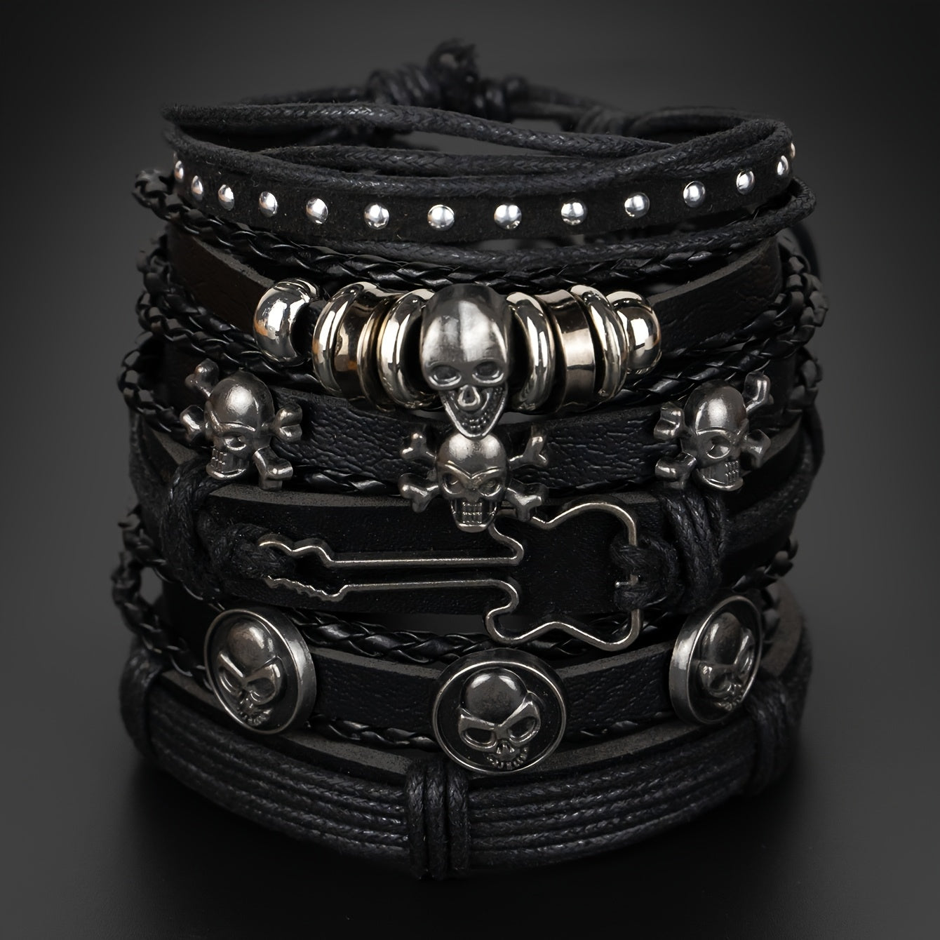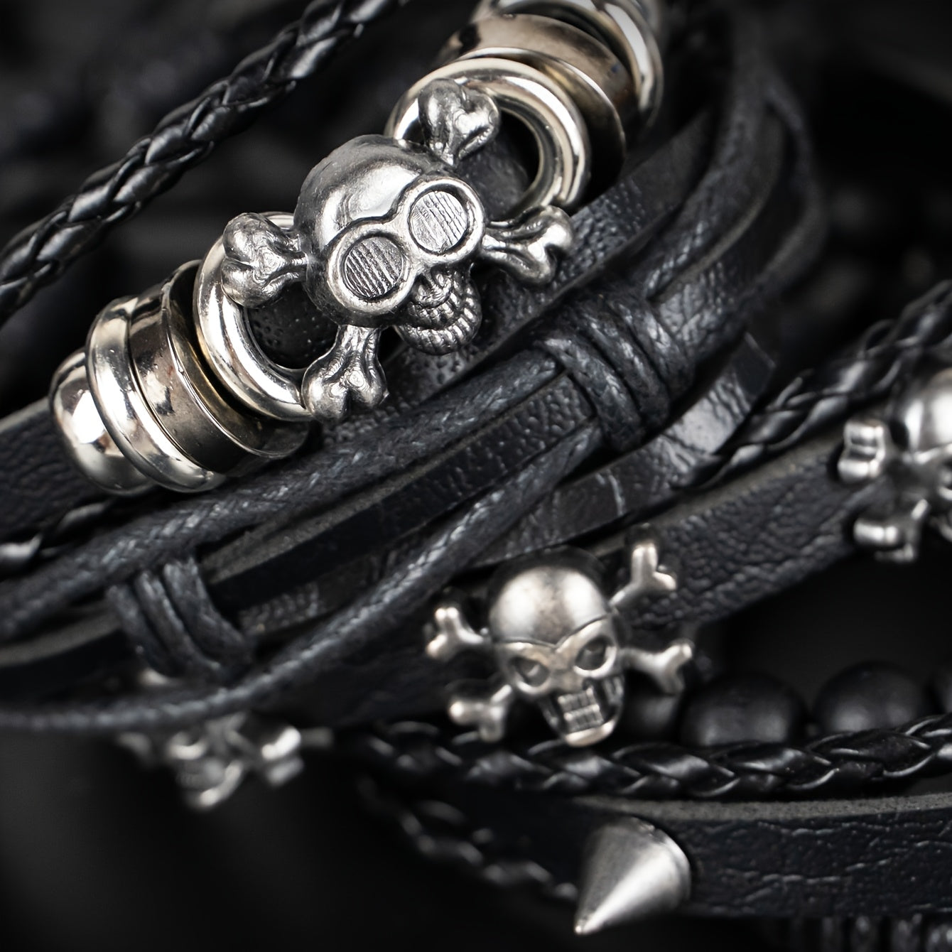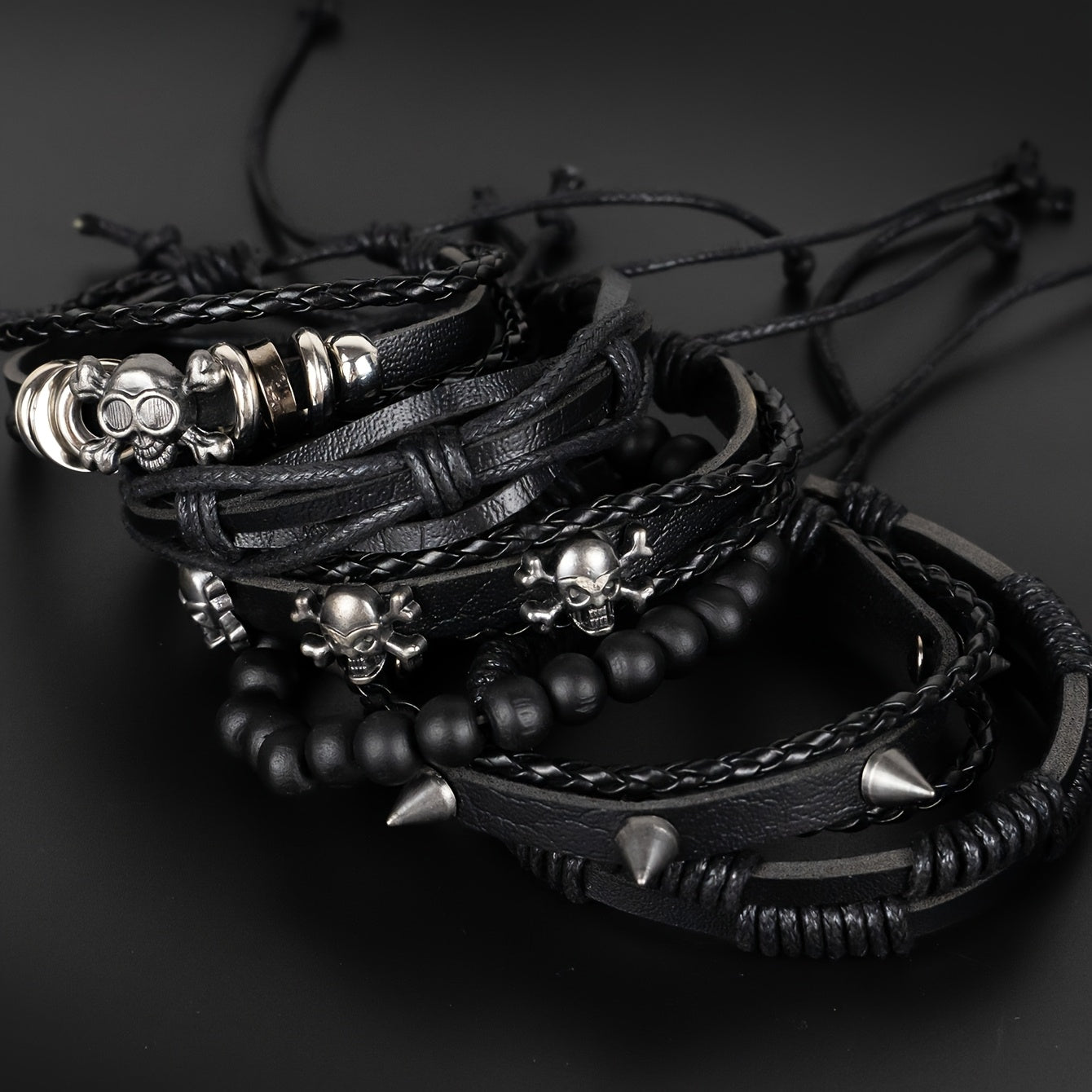 This 6-piece set of faux leather bracelets features a dark gothic punk style with beads. Suitable for daily wear or parties, it makes a perfect gift for men and women.