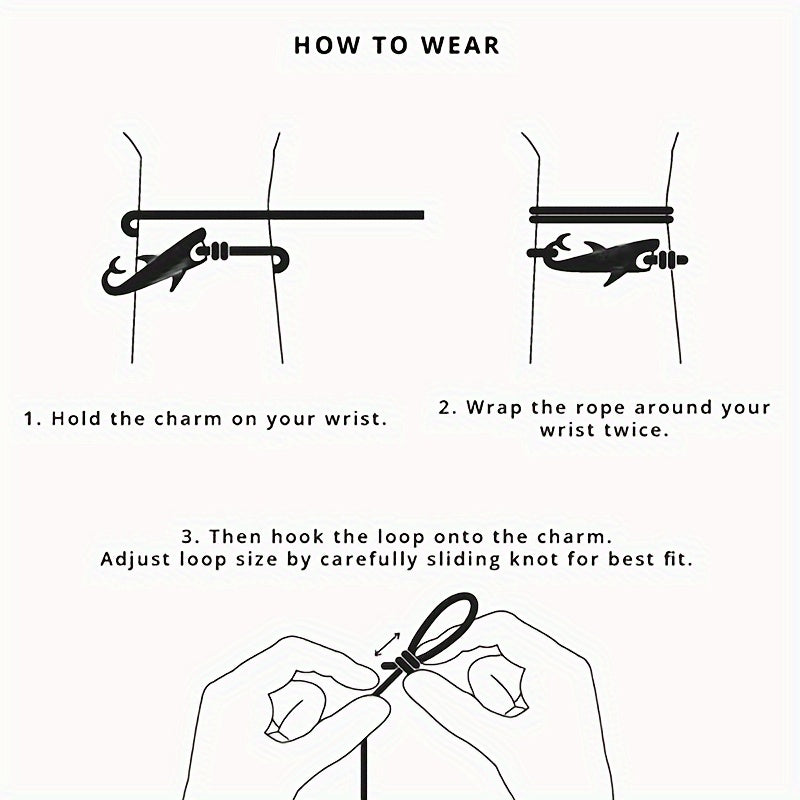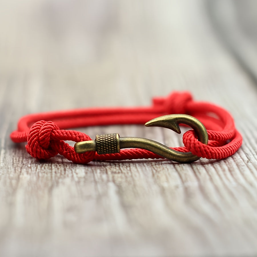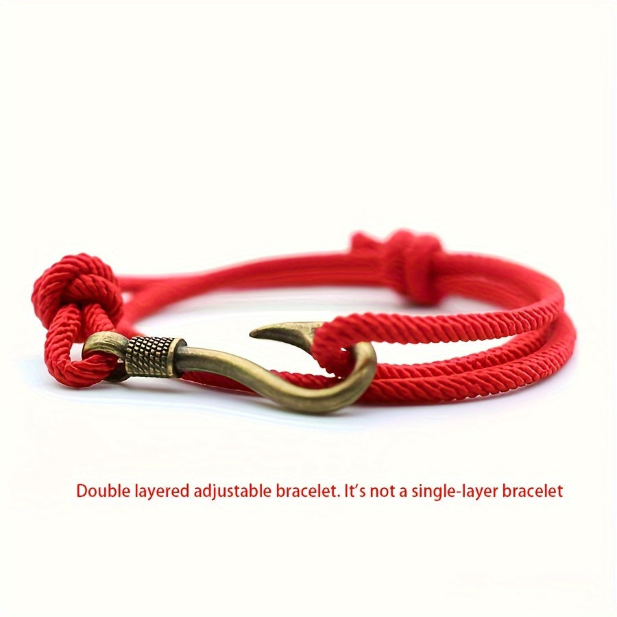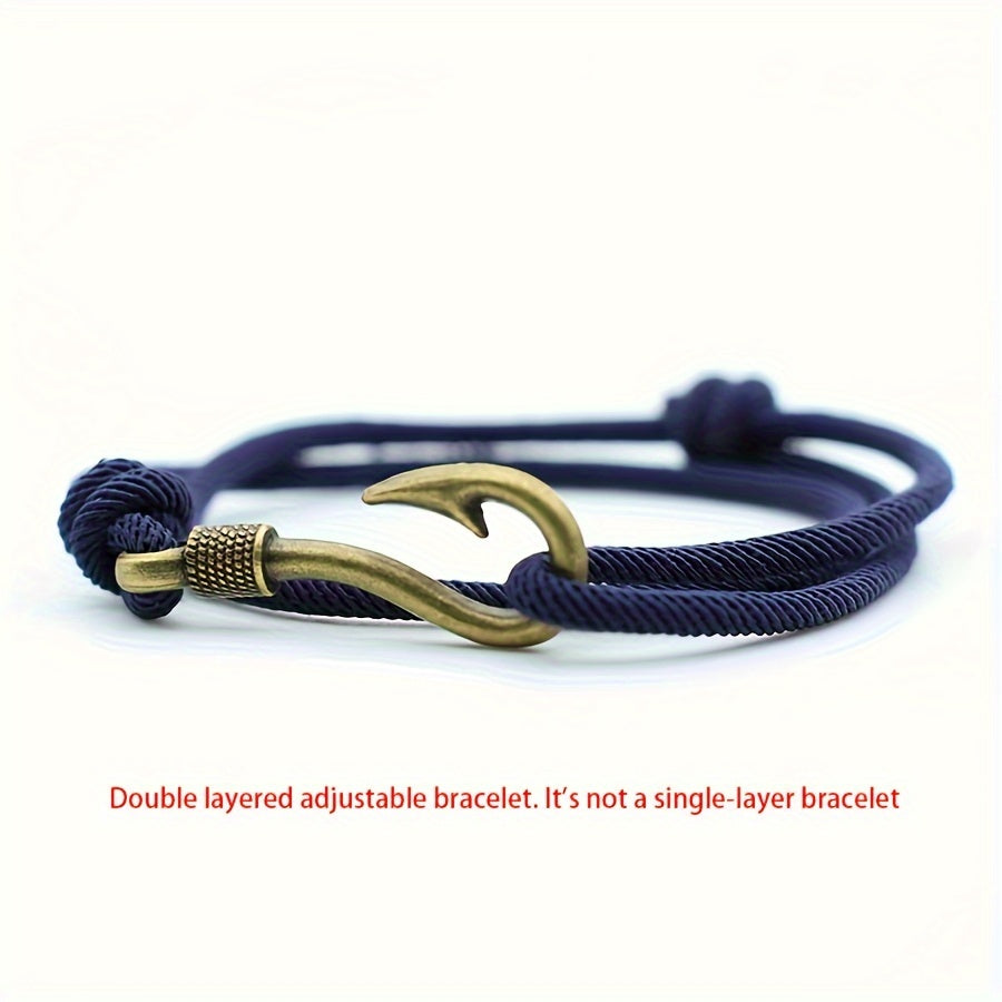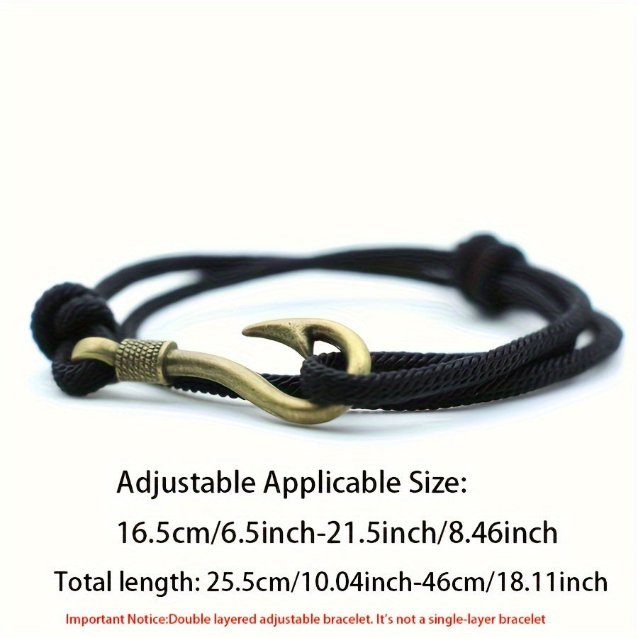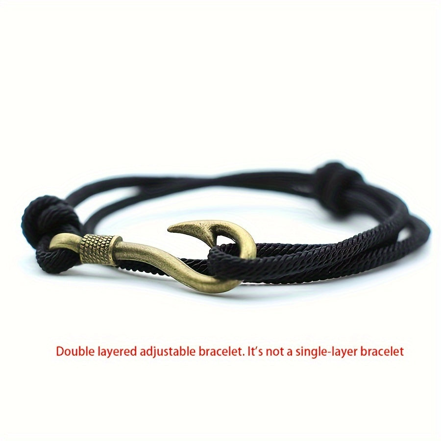 This double layer fish hook bracelet features an adjustable rope design that fits both men and women. It adds a stylish touch to any outfit and is a versatile accessory.