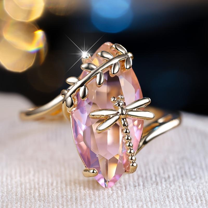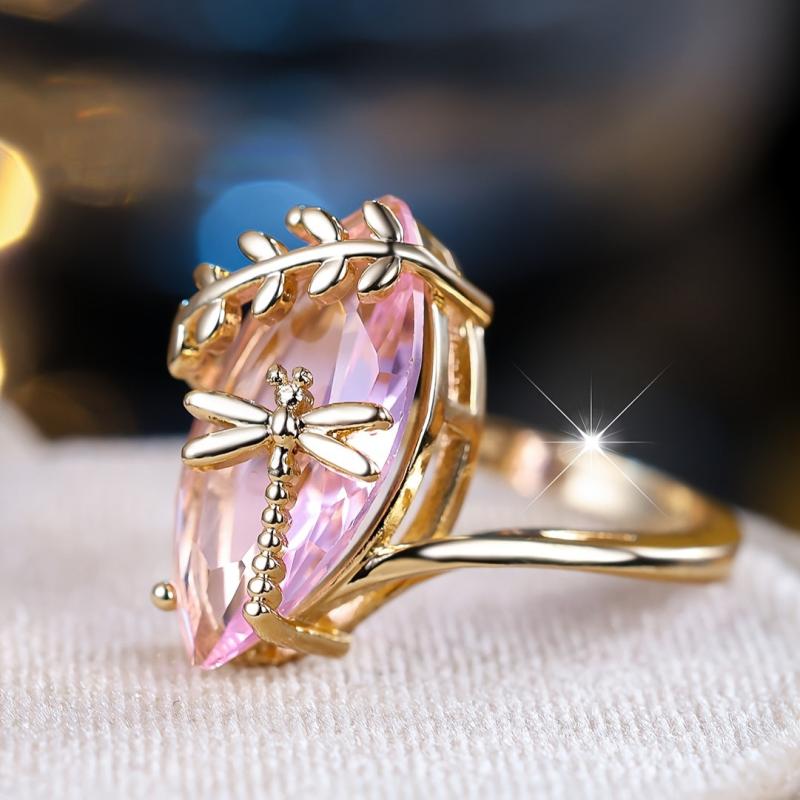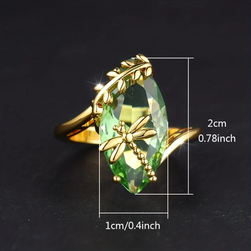 Exquisite ring with a dragonfly design in olive green and pink zirconia, accented with a willow branch for a unique look. Ideal for women.
