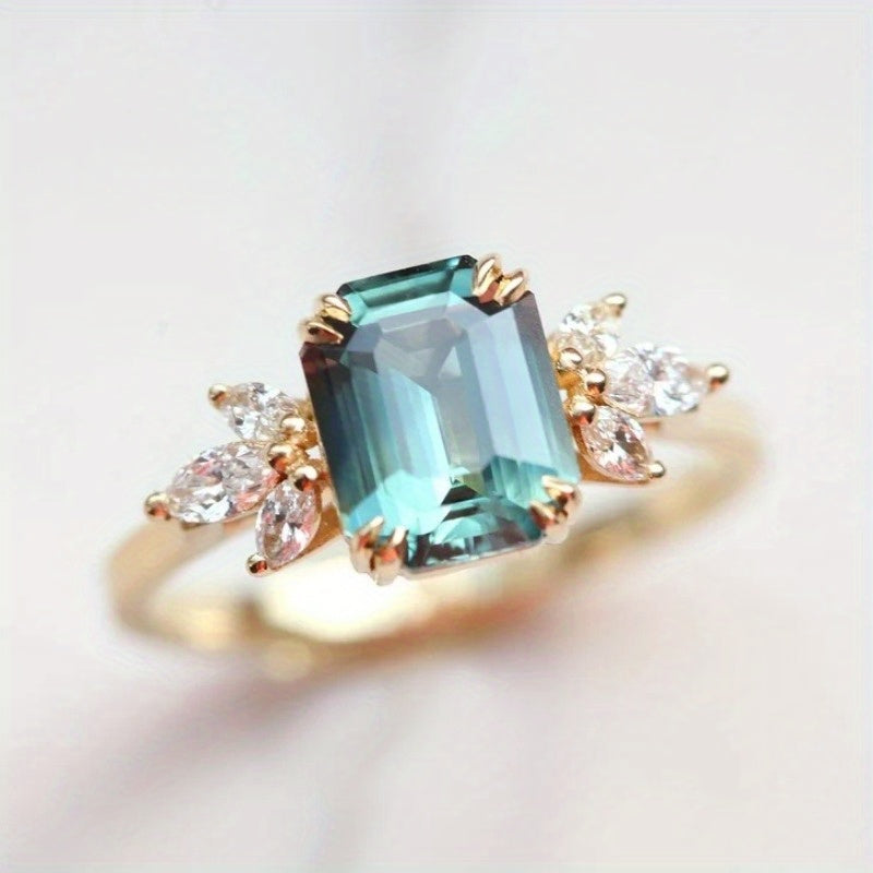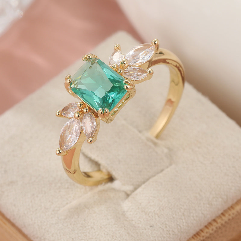 Stunning emerald leaf synthetic cubic zirconia ring with geometric design, perfect for bohemian weddings. Gold-plated for an elegant touch. Ideal gift for women and mothers.