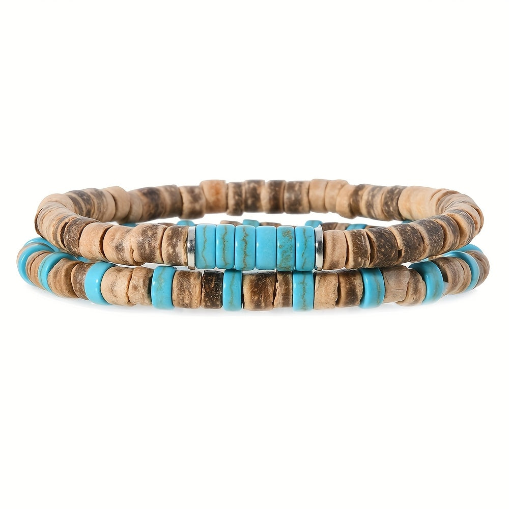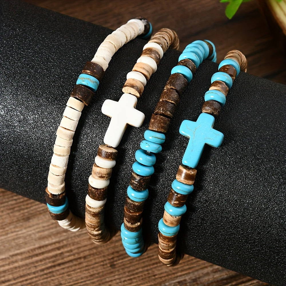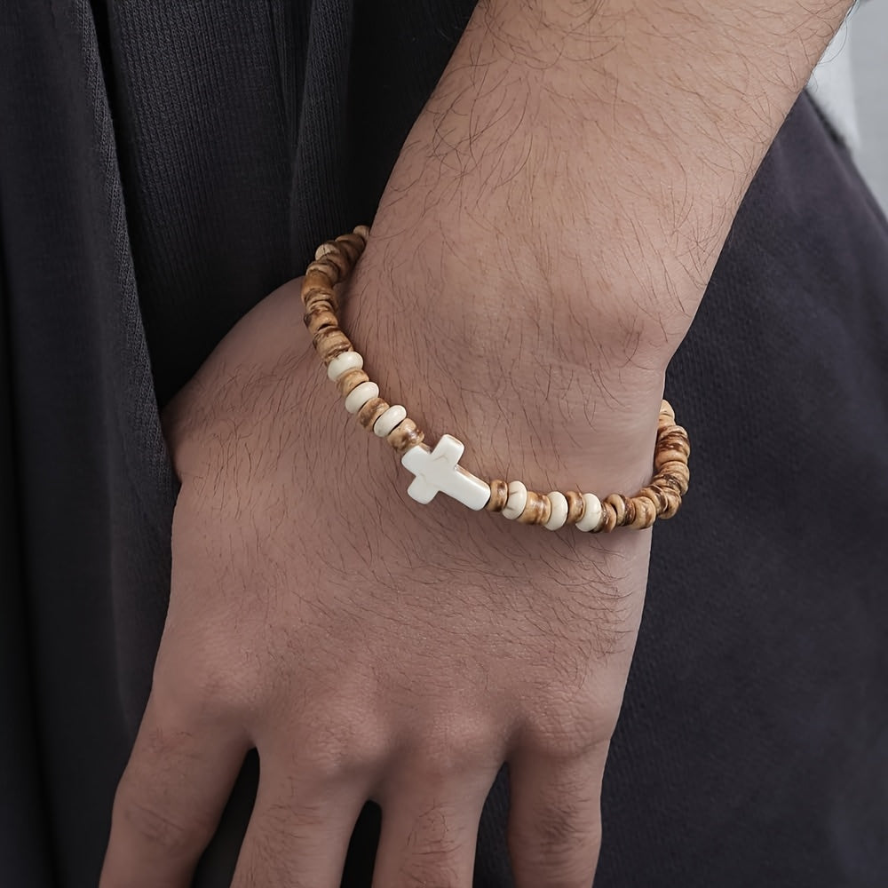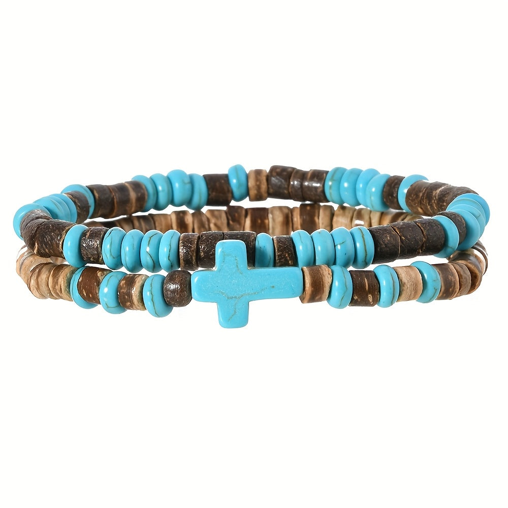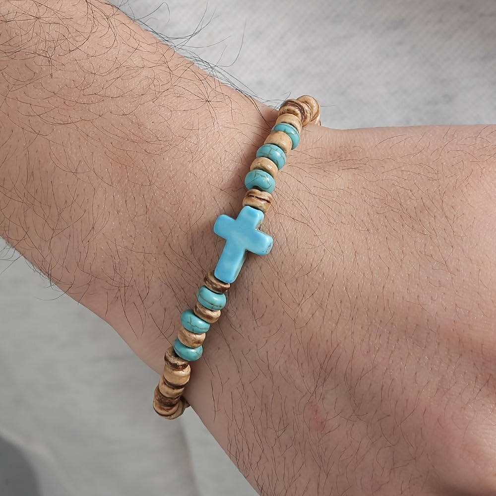 This unisex bracelet features a wooden band with a turquoise cross charm and bohemian coconut beads. It's perfect for casual attire and adds a touch of ethnic style to any outfit.