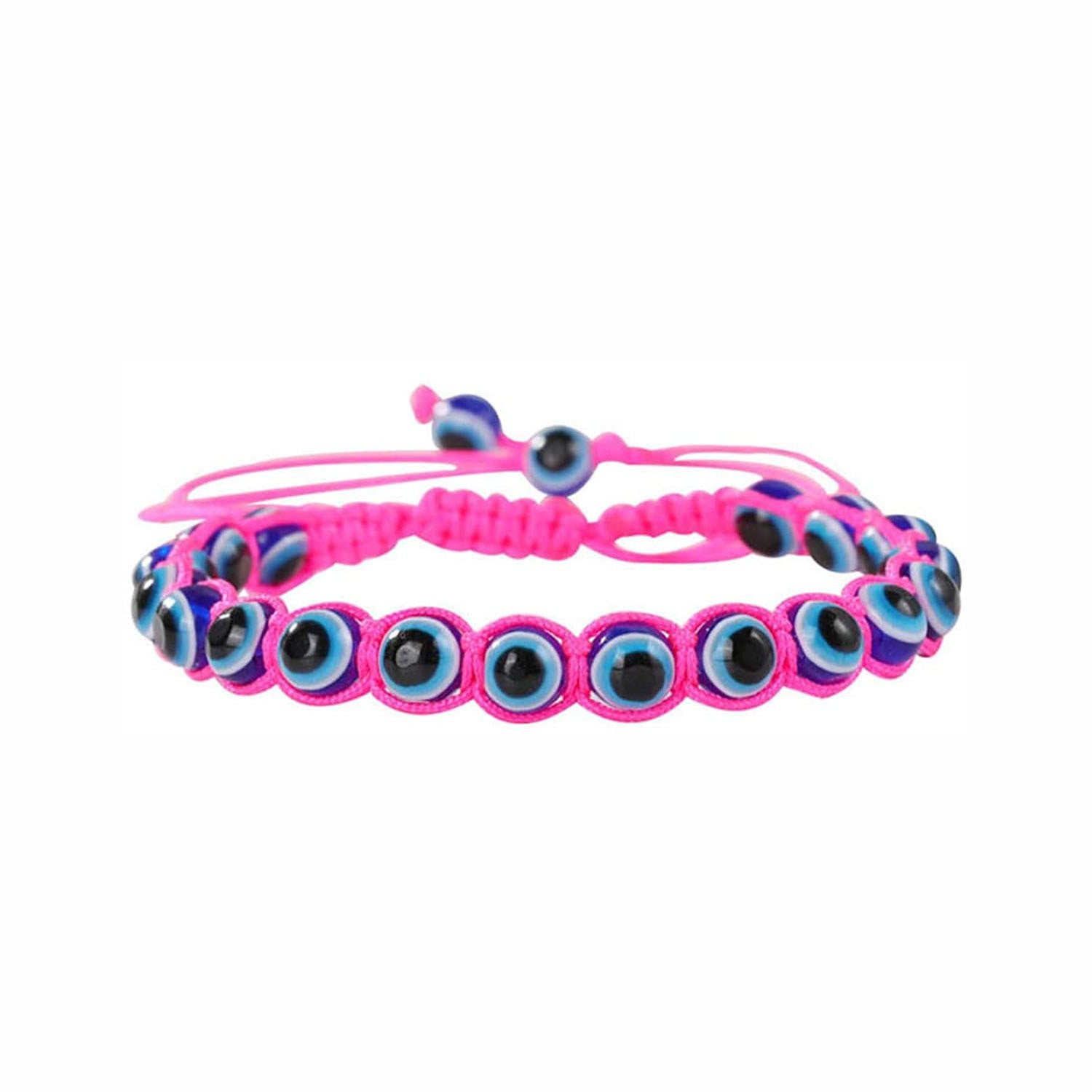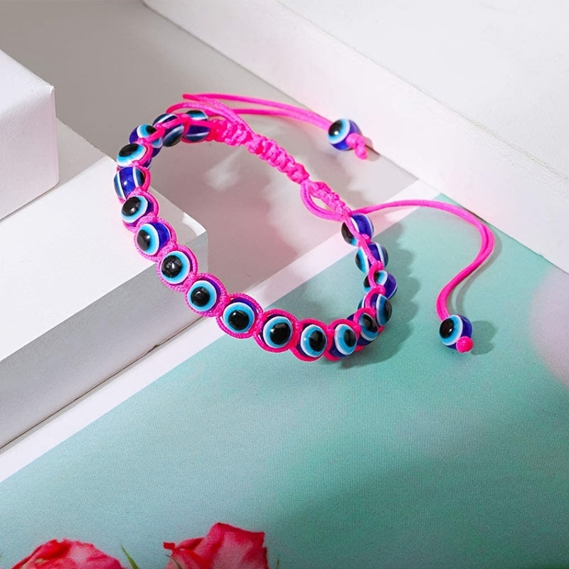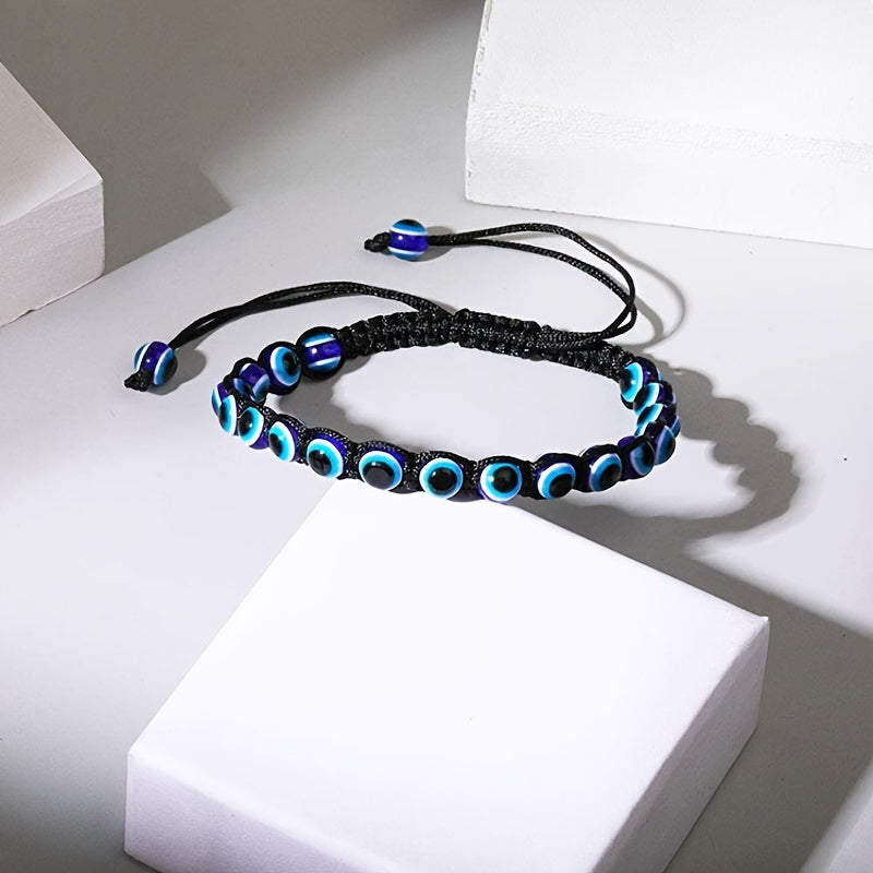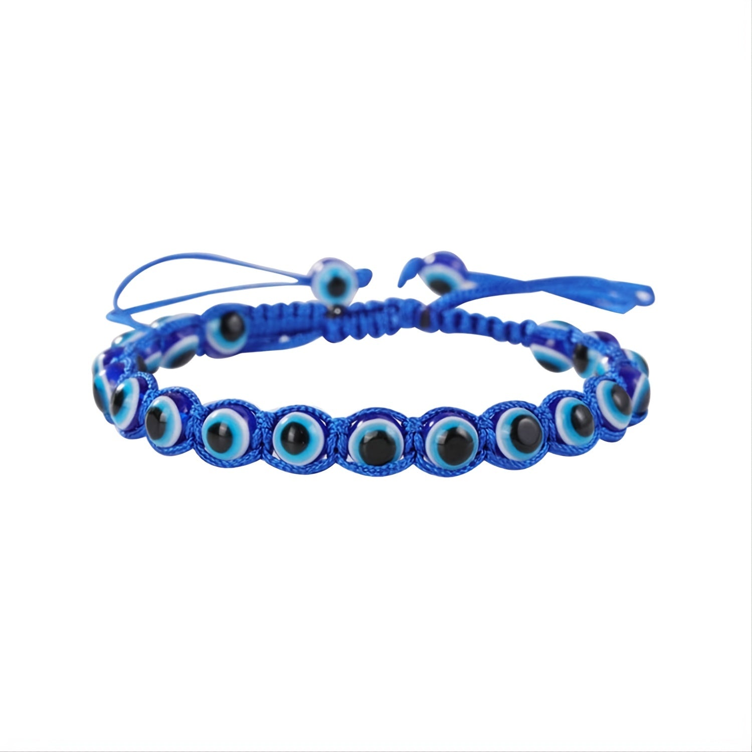 This hand-woven bracelet features an evil eye bead design and an adjustable drawstring closure for a comfortable fit.