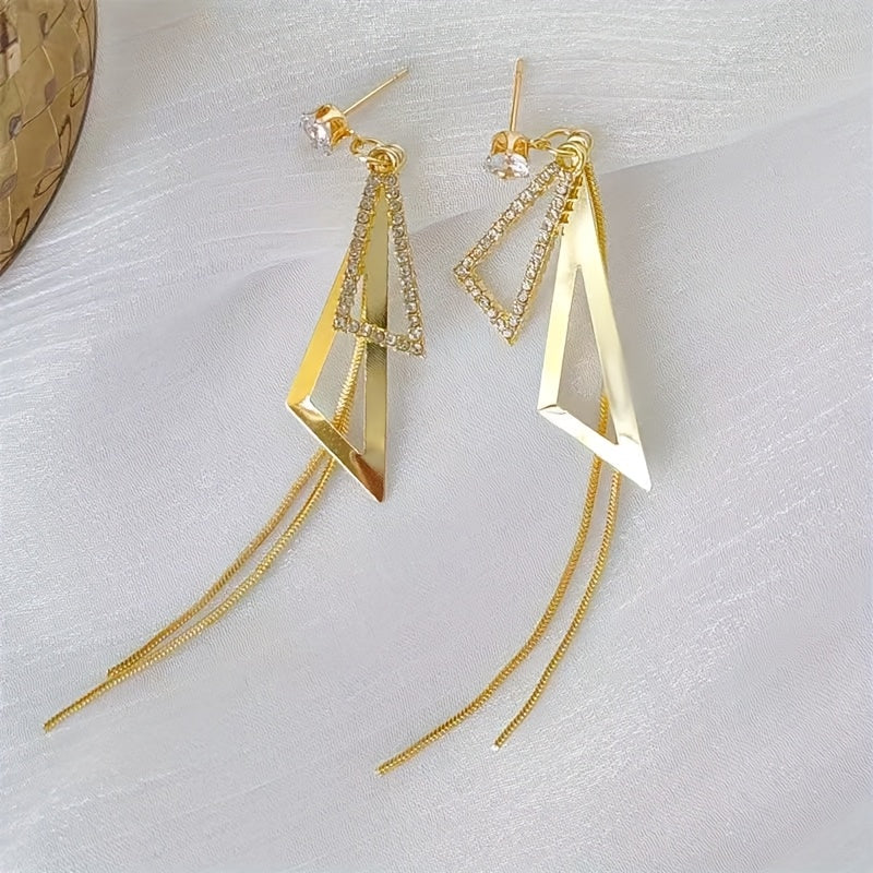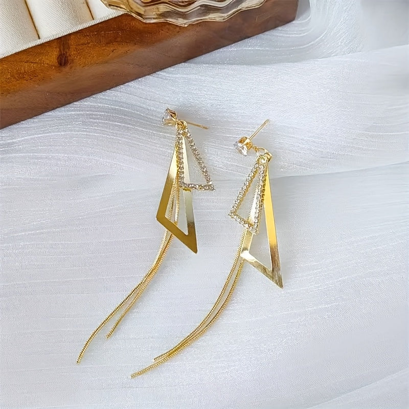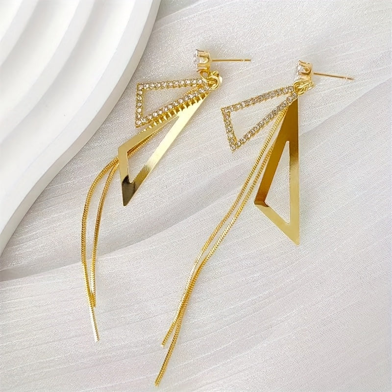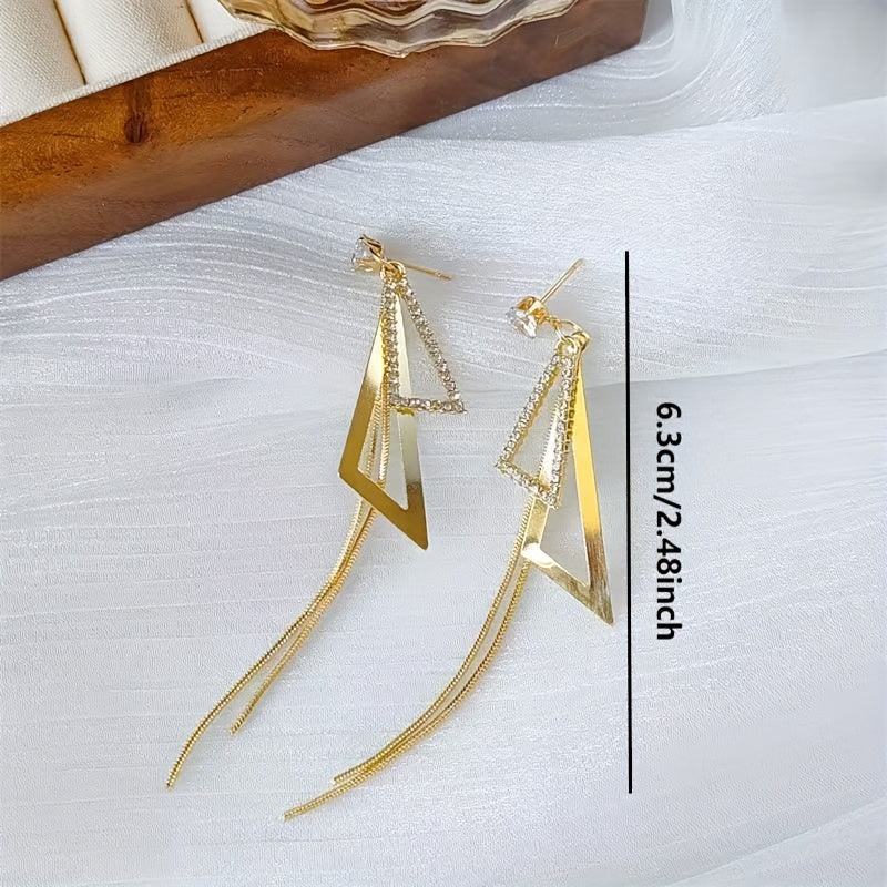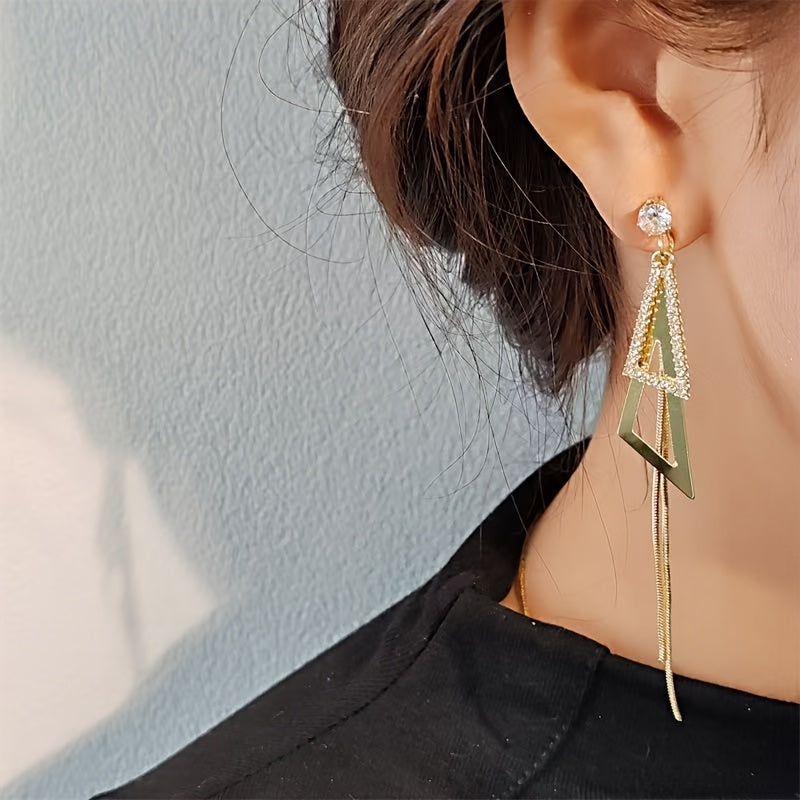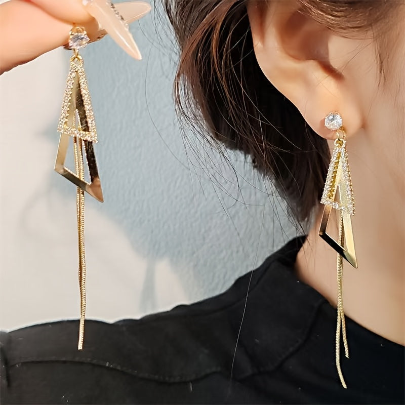 Eye-catching retro dangle earrings featuring sparkling synthetic zirconia in golden tone metal. Versatile for daily wear.