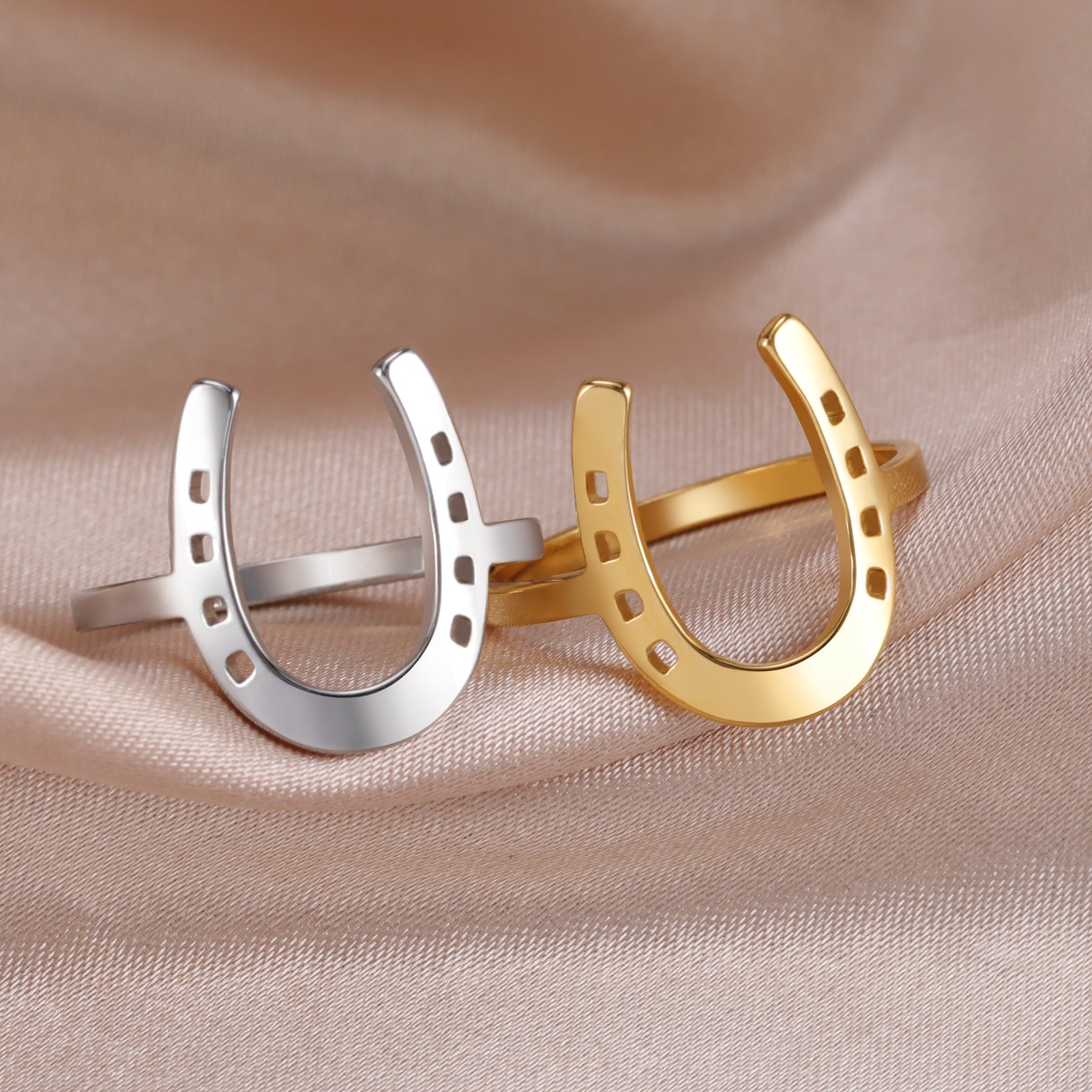 This U-shaped horseshoe ring is a stylish piece of jewelry suitable for both men and women. Made from stainless steel, it features a golden color that adds a touch of elegance. Perfect as a birthday gift for a friend.