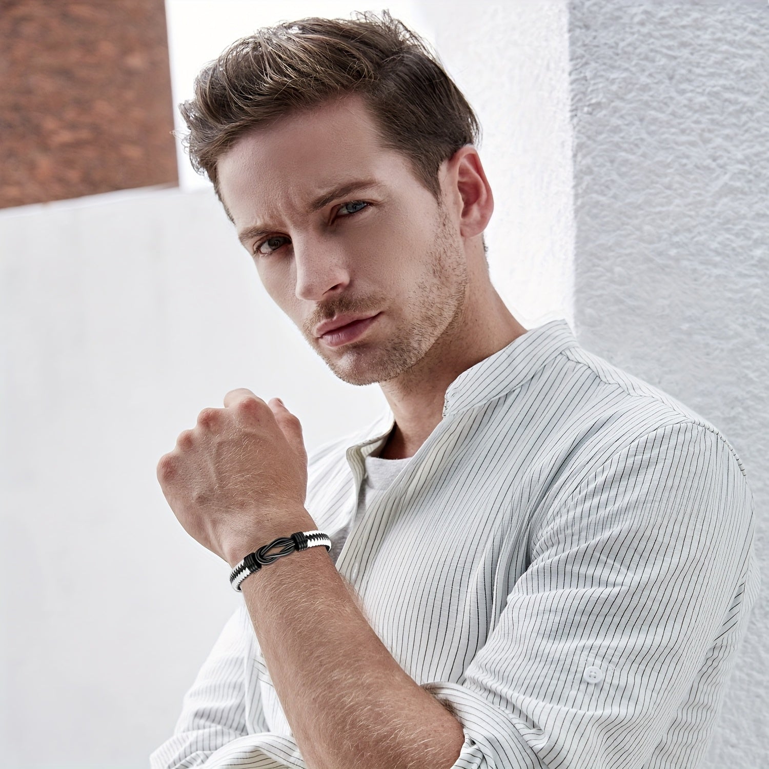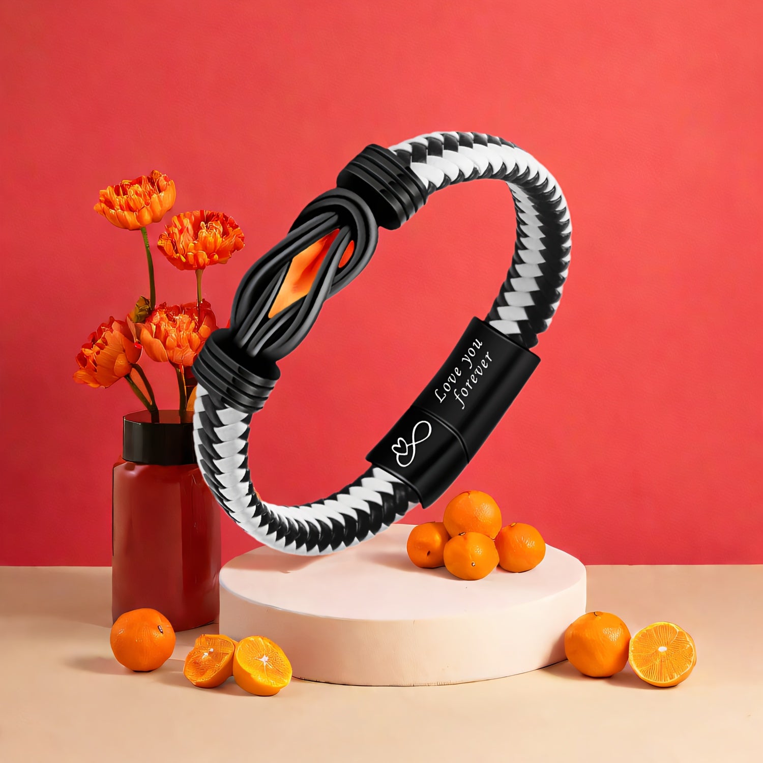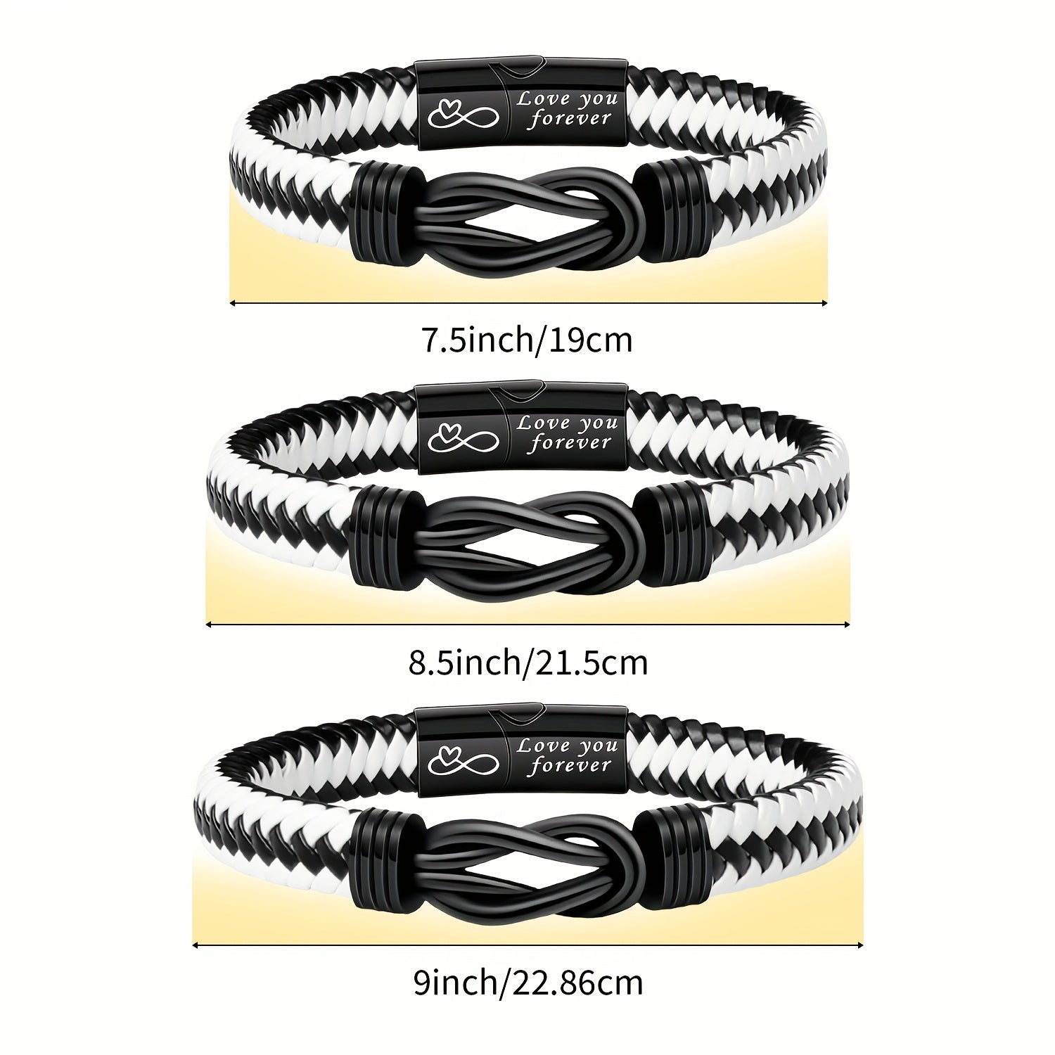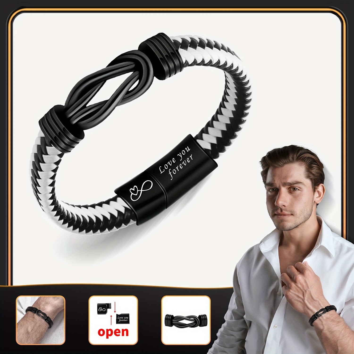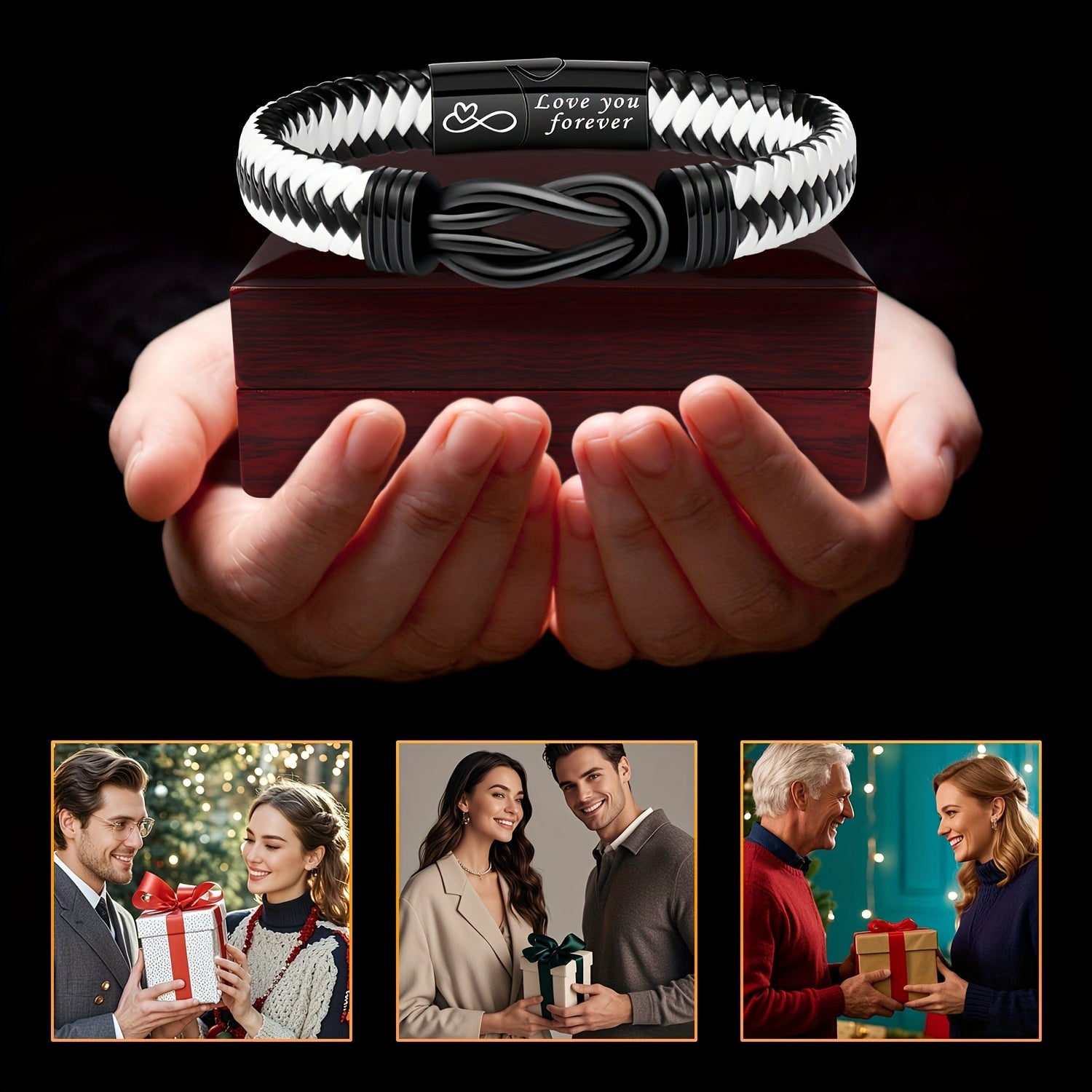 This knot love buckle bracelet with a 'Love You Forever' charm is a durable faux leather accessory perfect for dad, son, or husband. Ideal for Thanksgiving.