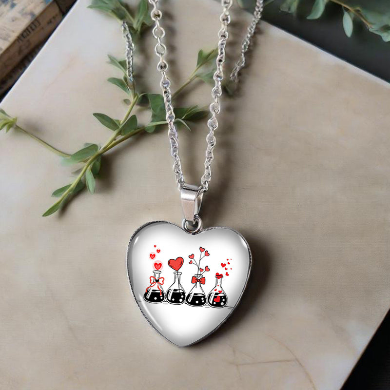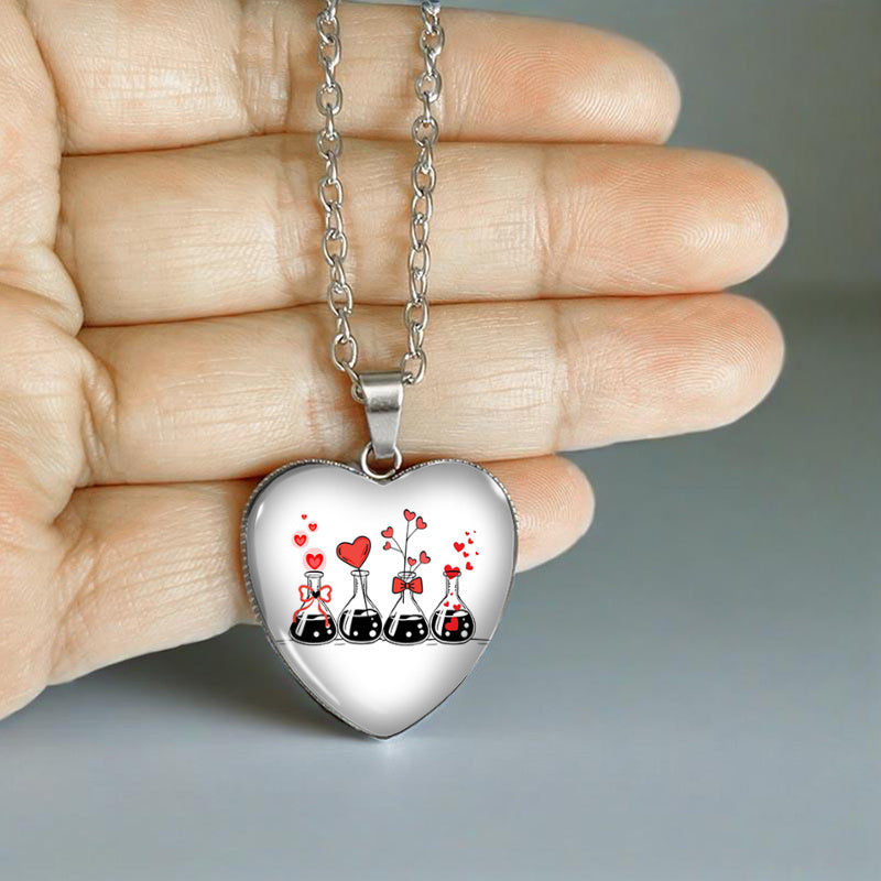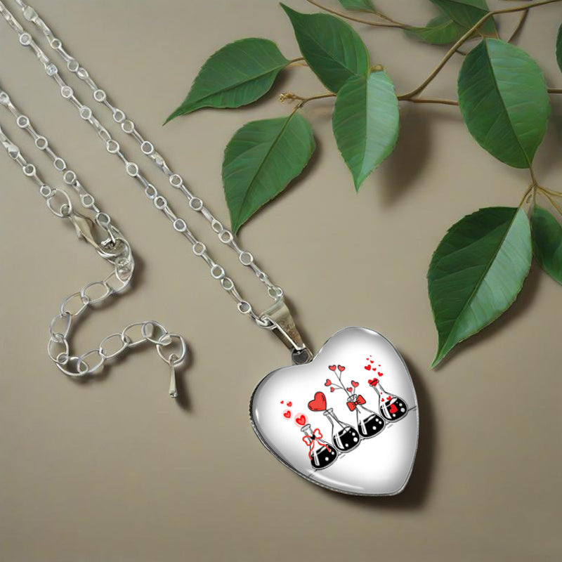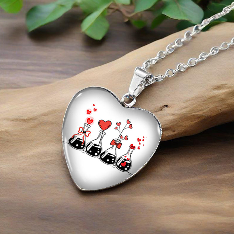 A unique and stylish heart necklace featuring a glass pendant with a love science experiment design. Perfect for men's jewelry collection.