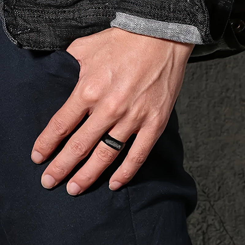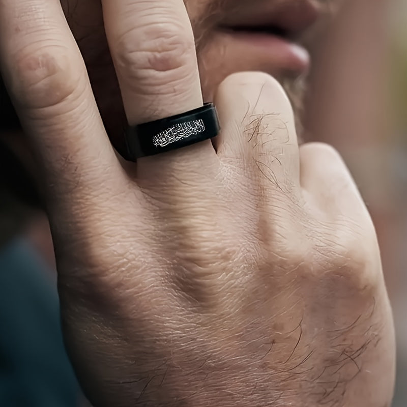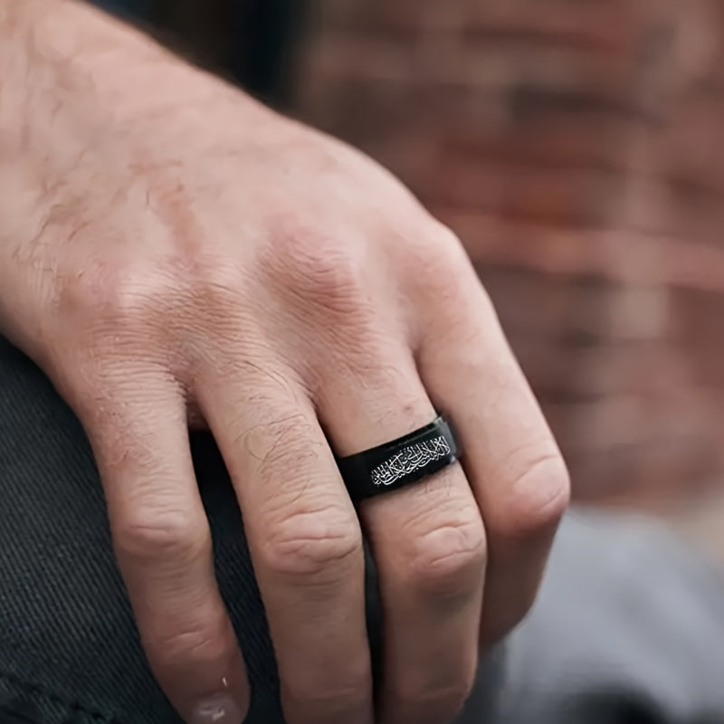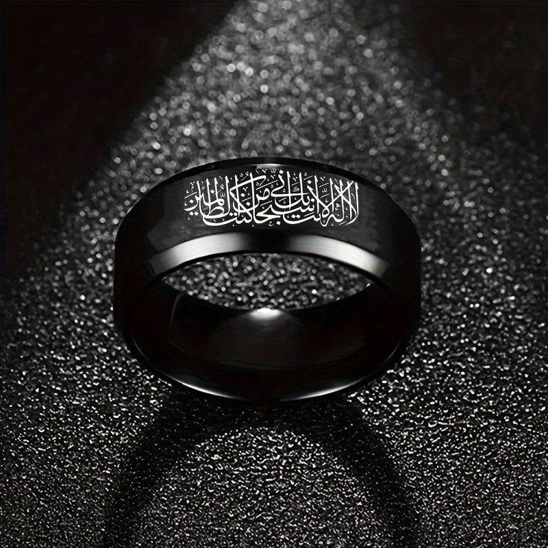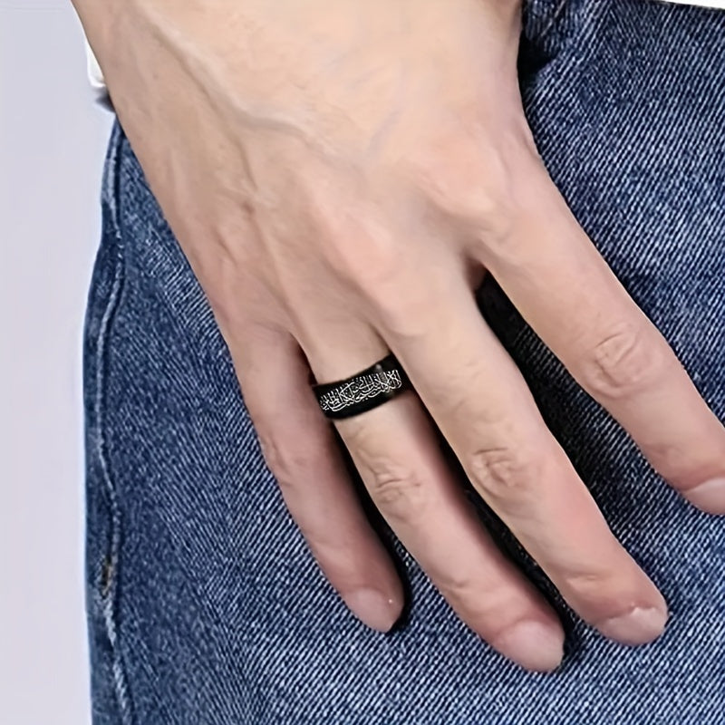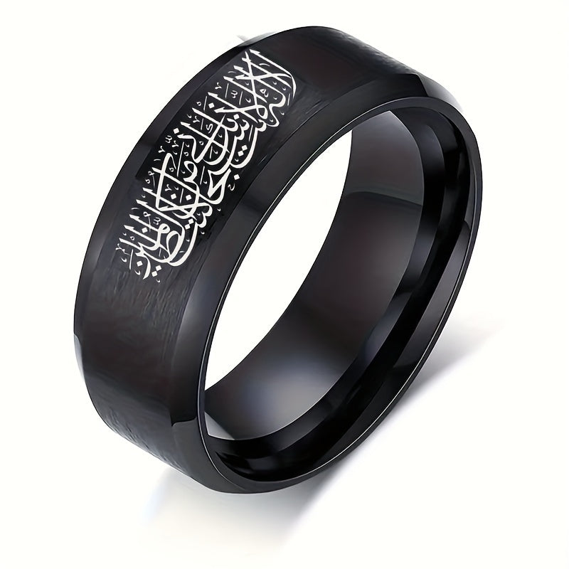 This men's casual stainless steel ring features an Arabic alphabet scripture design, making it a meaningful religious gift. Available in sizes 6 to 12.