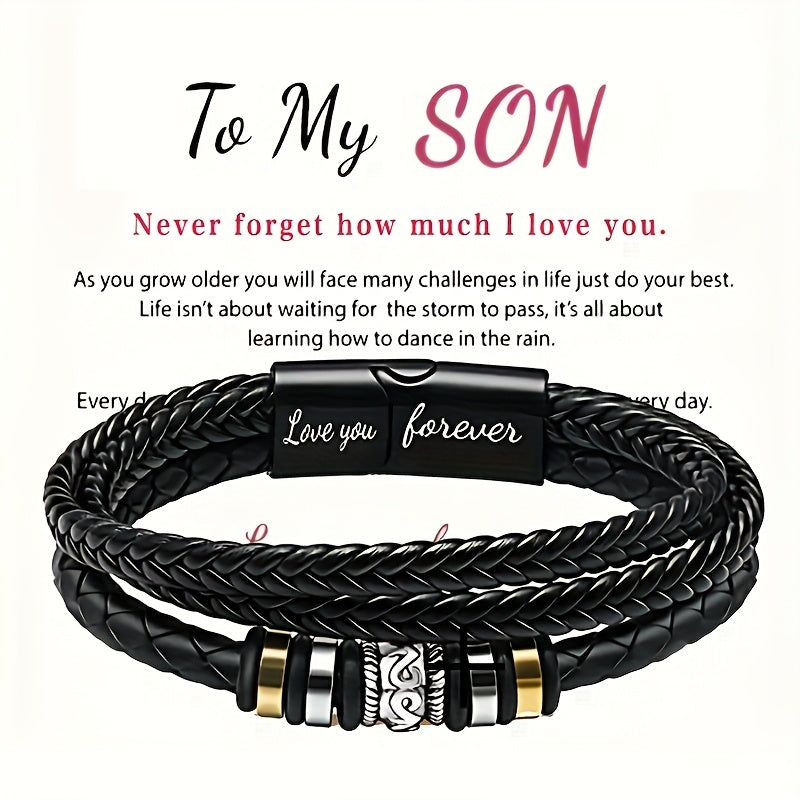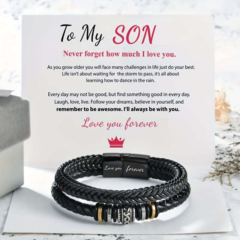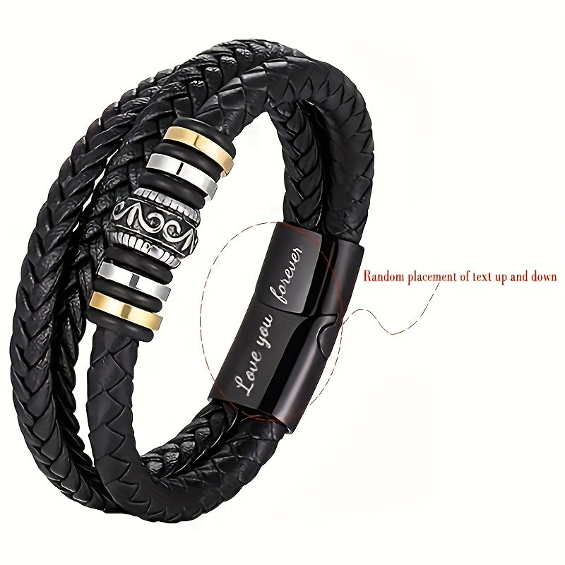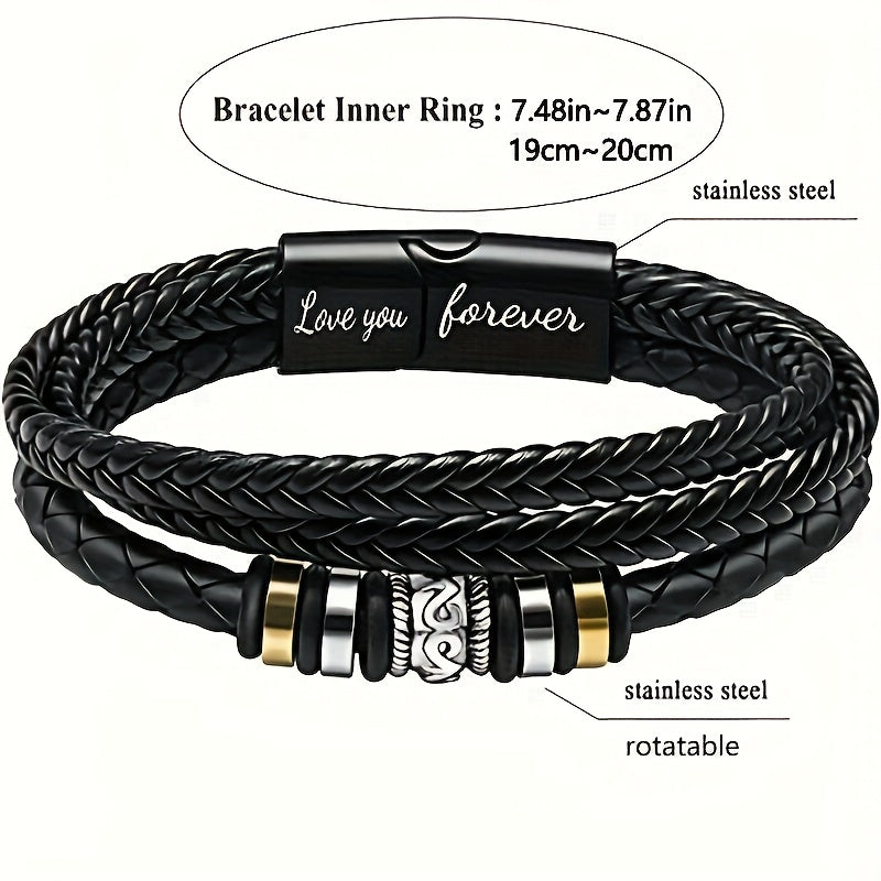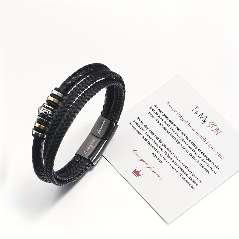 This stylish bracelet features a braided faux leather design with golden accents on the clasp. Perfect gift for a father to give to his son or grandson. Comes with an inspirational card. Retro meets modern style.