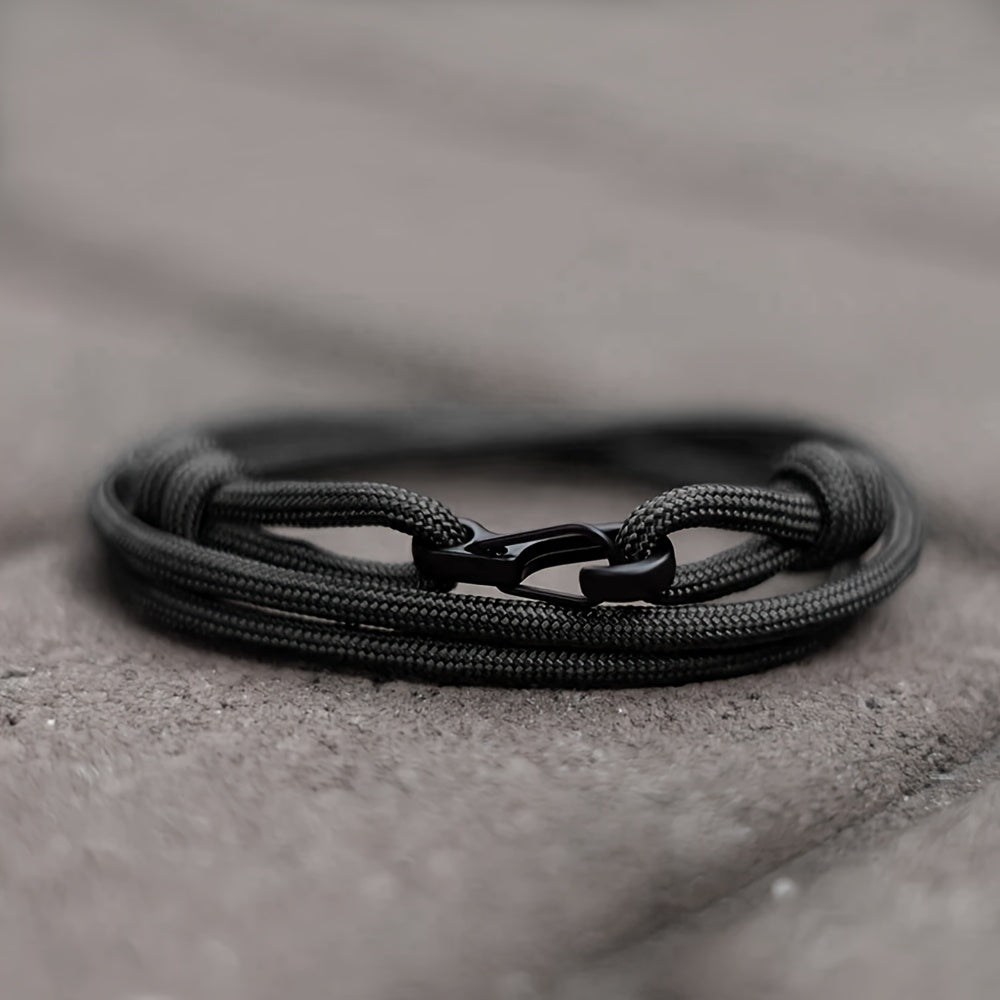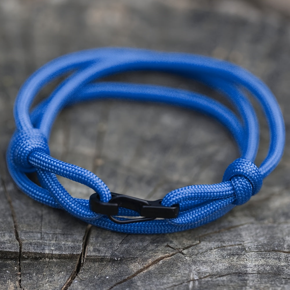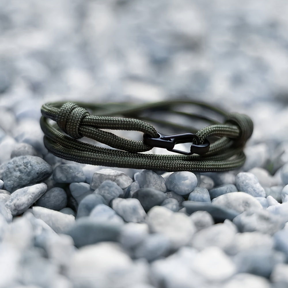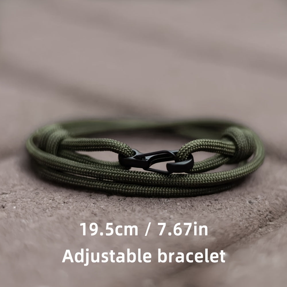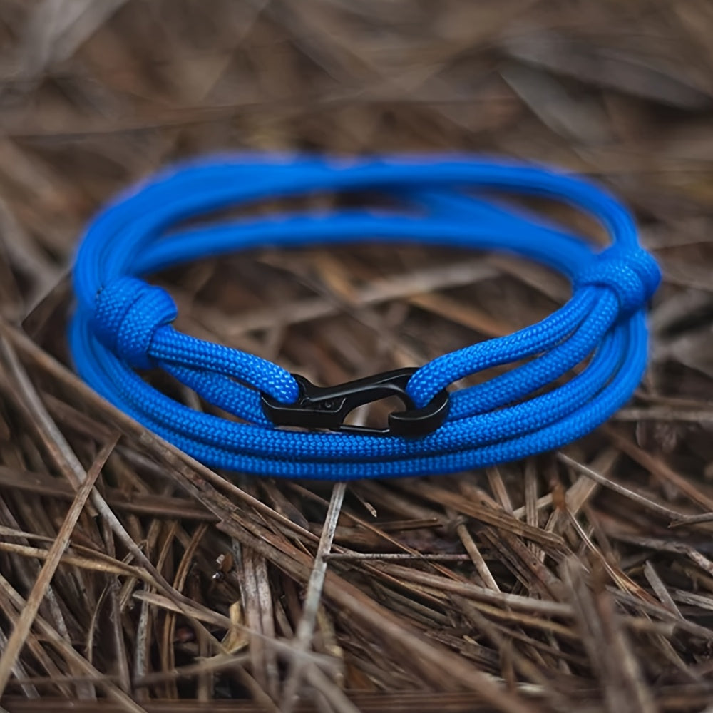 A stylish woven bracelet made of durable paracord, adjustable to fit all sizes. Perfect for outdoor sports enthusiasts.