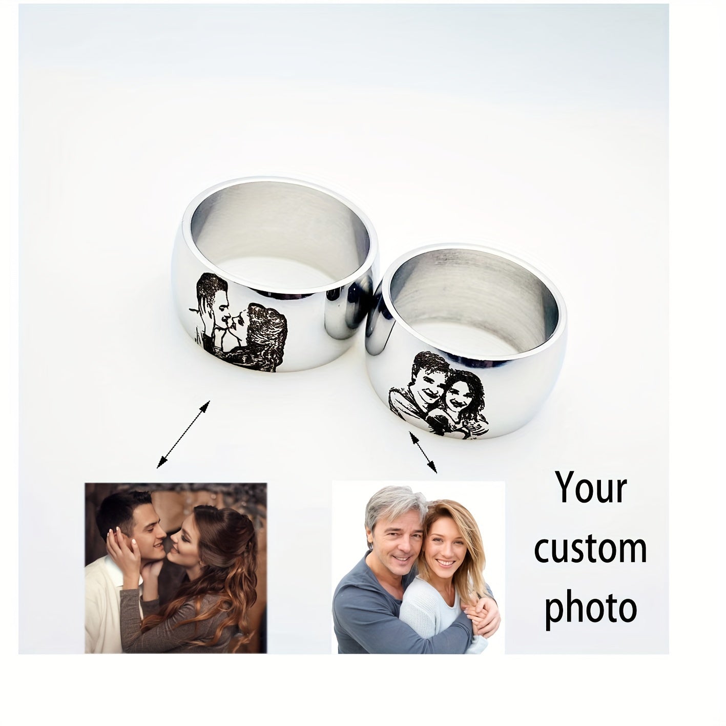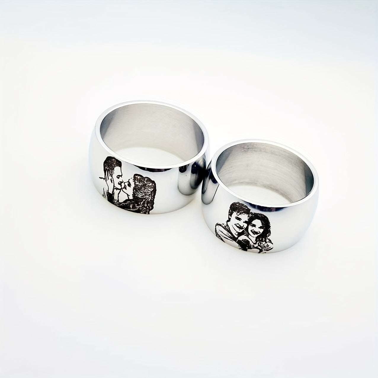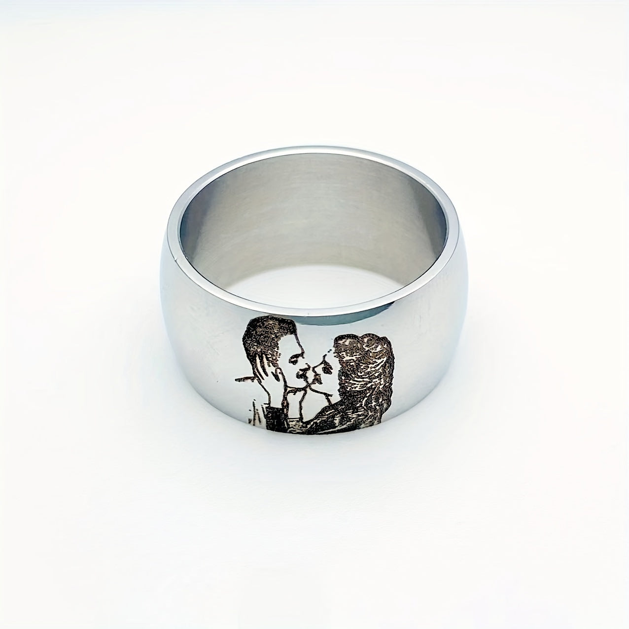 Custom laser engraved stainless steel ring suitable for men with a curved mirror finish.