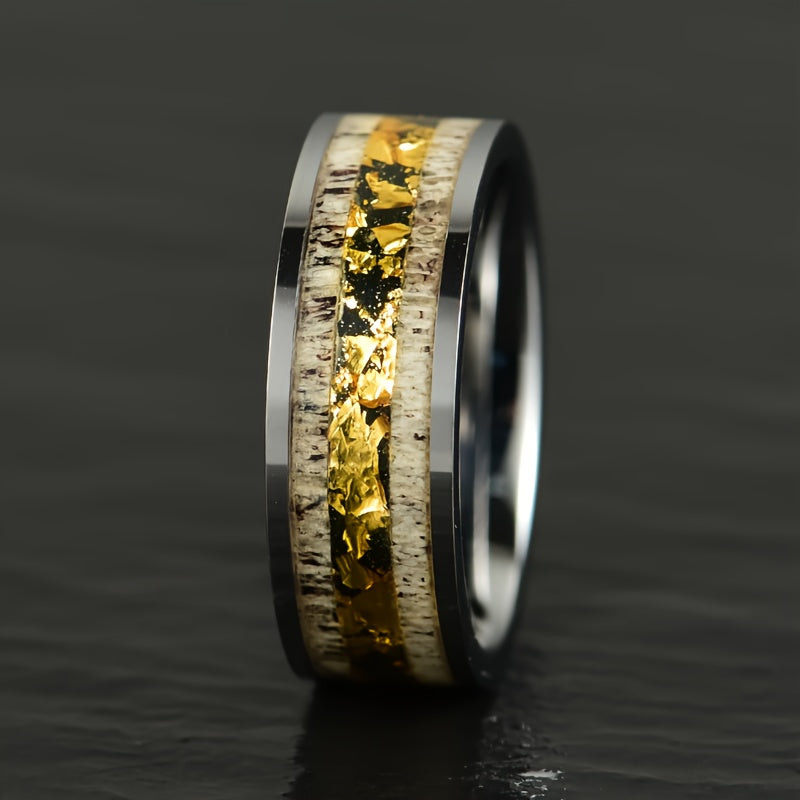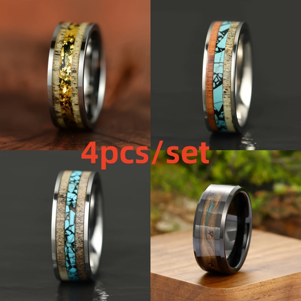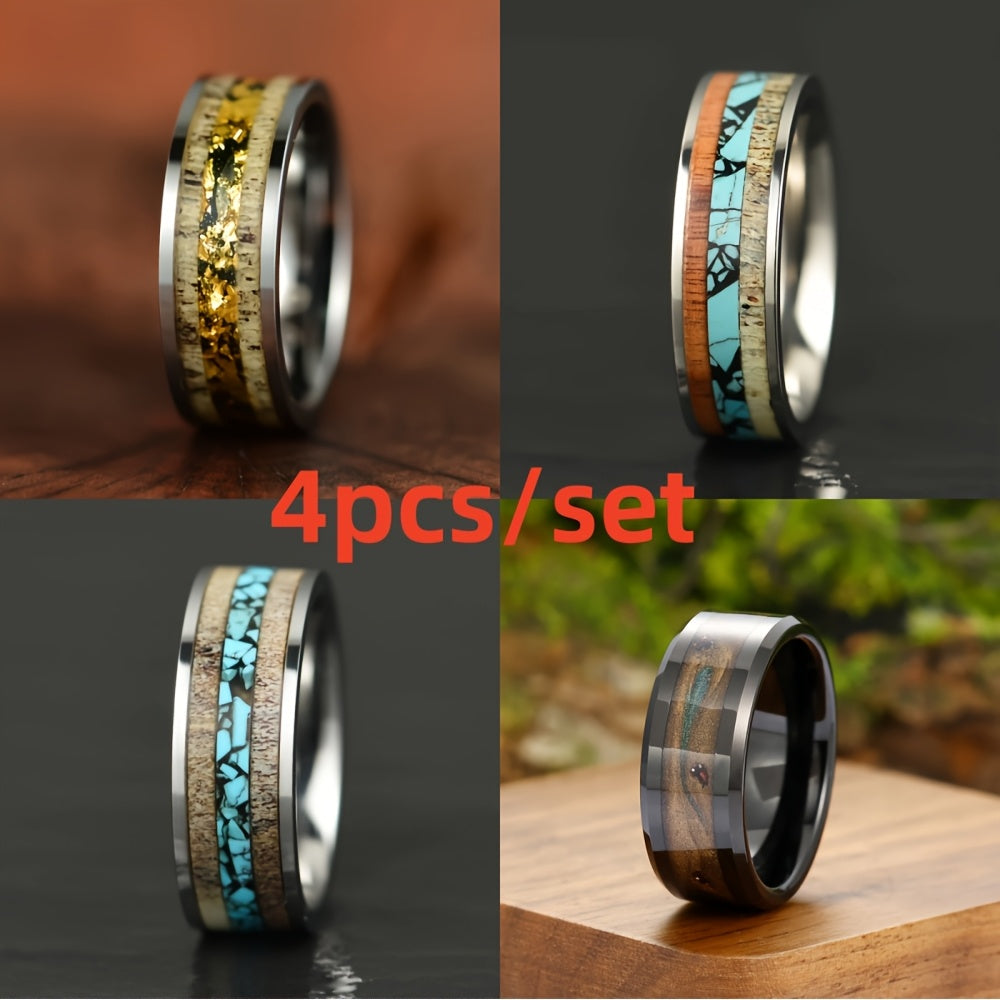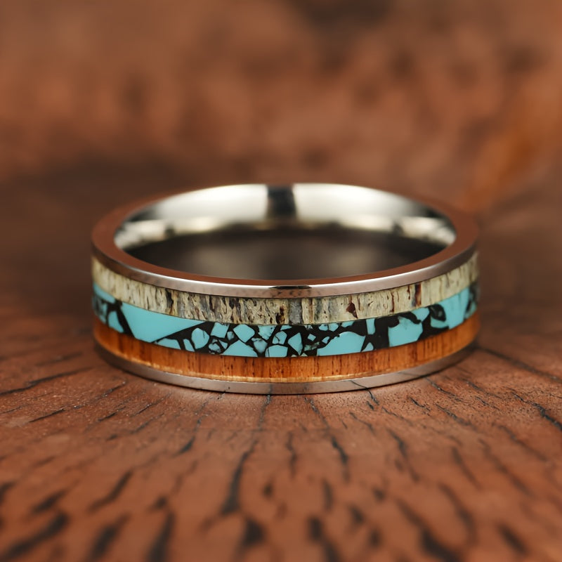 This vintage style ring set is ideal for weddings and anniversaries, making it a perfect gift for fathers or as an everyday accessory. Crafted from stainless steel with synthetic turquoise inlay.
