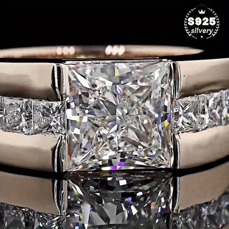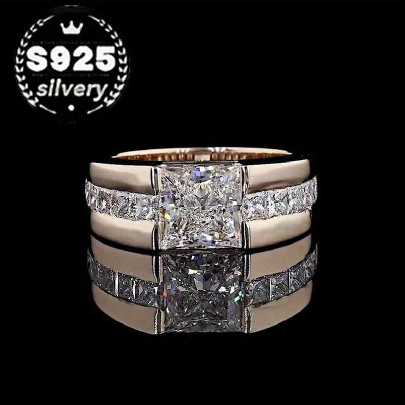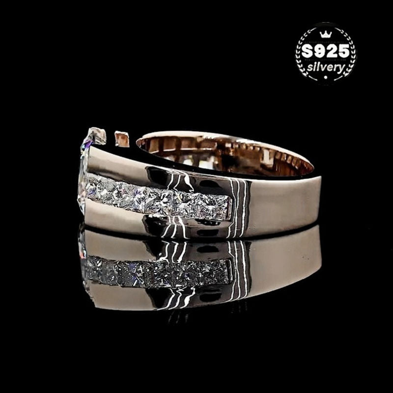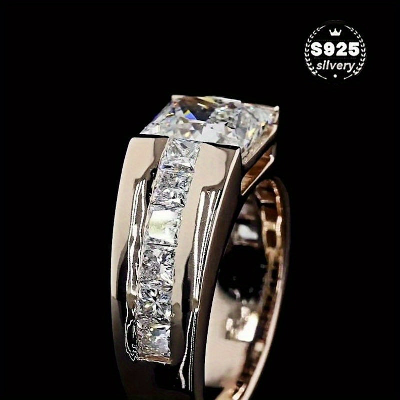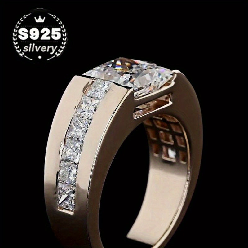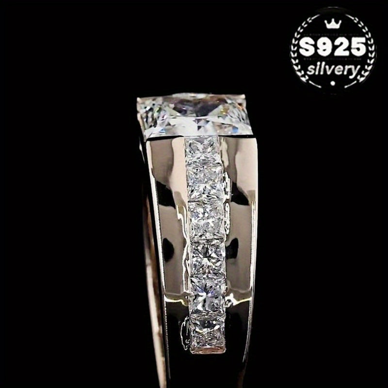 This men's wedding band features a 2ct cubic zirconia stone in a round square cut, set in 925 sterling silver with a hollow inner design.