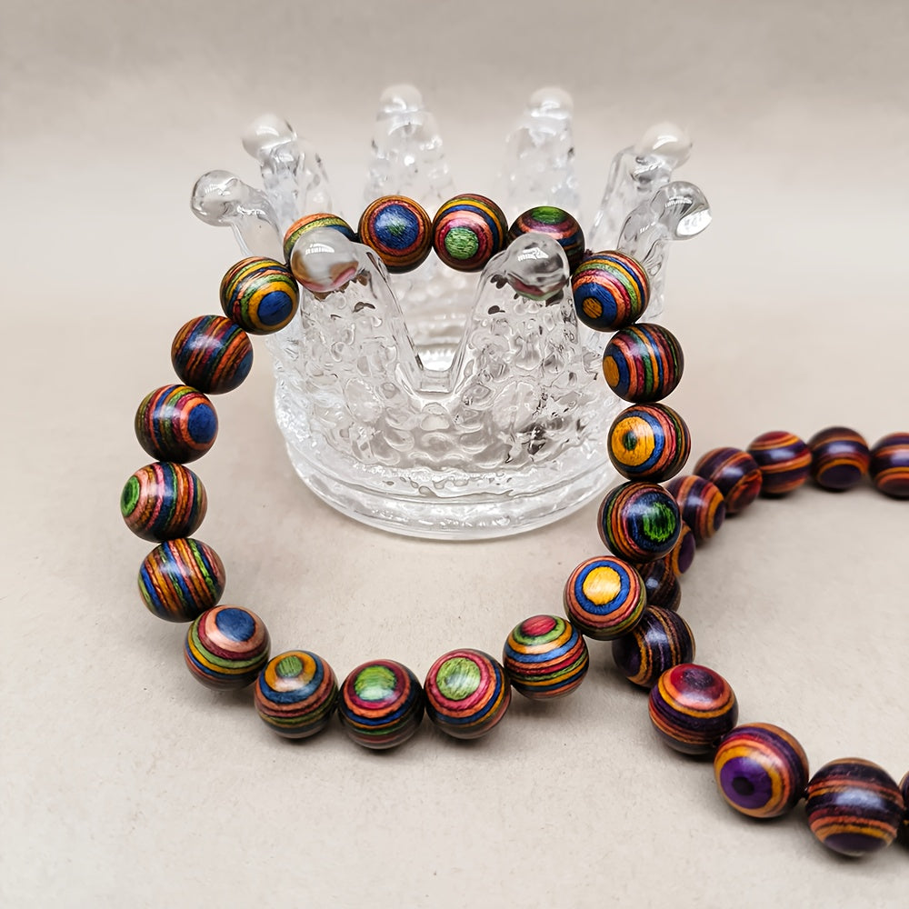 Add a touch of urban chic to your outfit with this colorful wooden bead bracelet. The 10cm wristband is made of natural wood and features a multi-color design. This unisex accessory is perfect for personalized style.