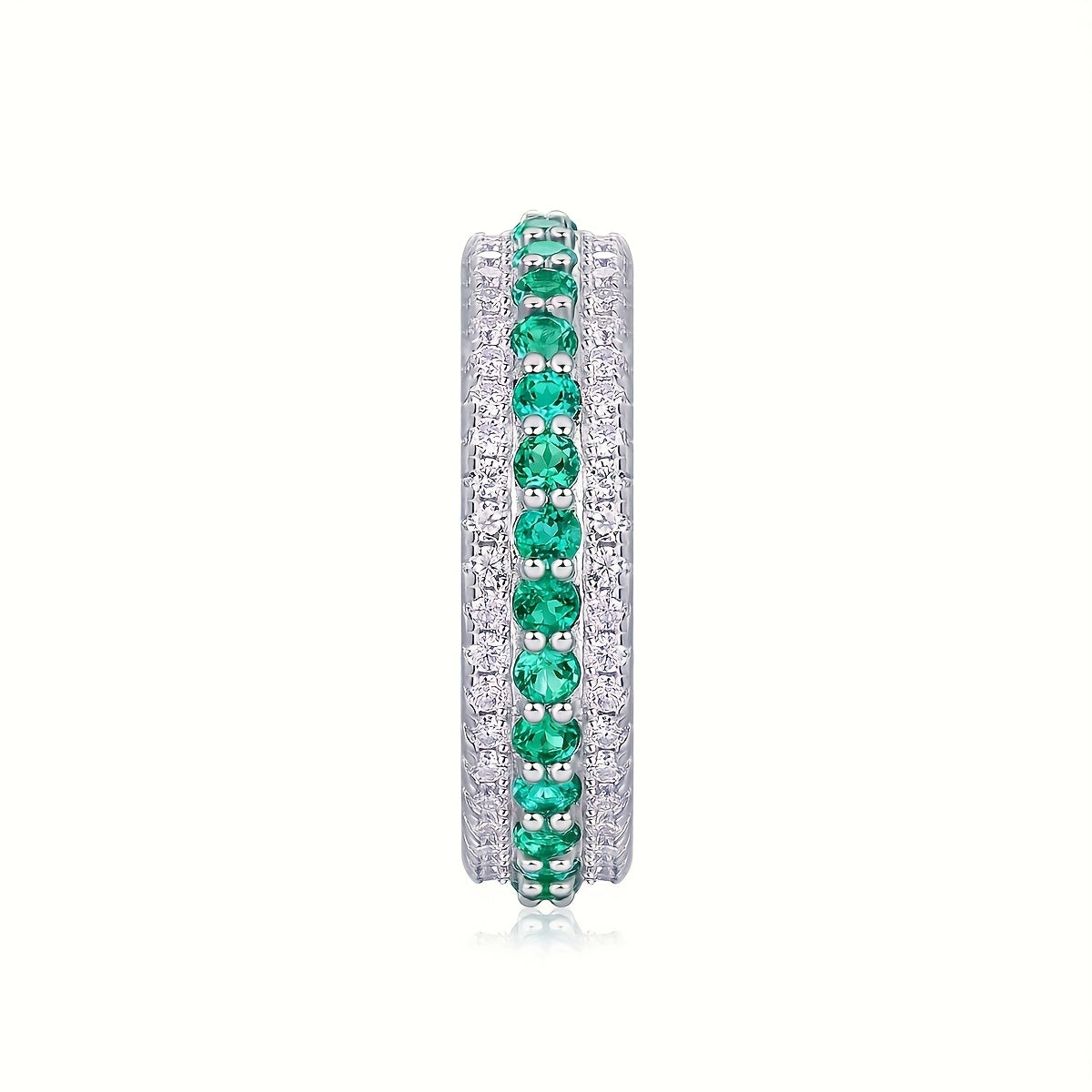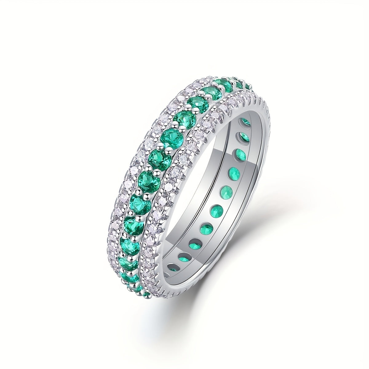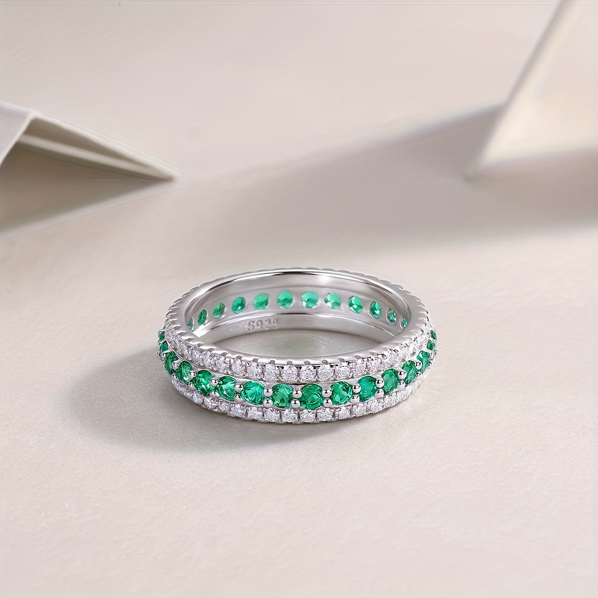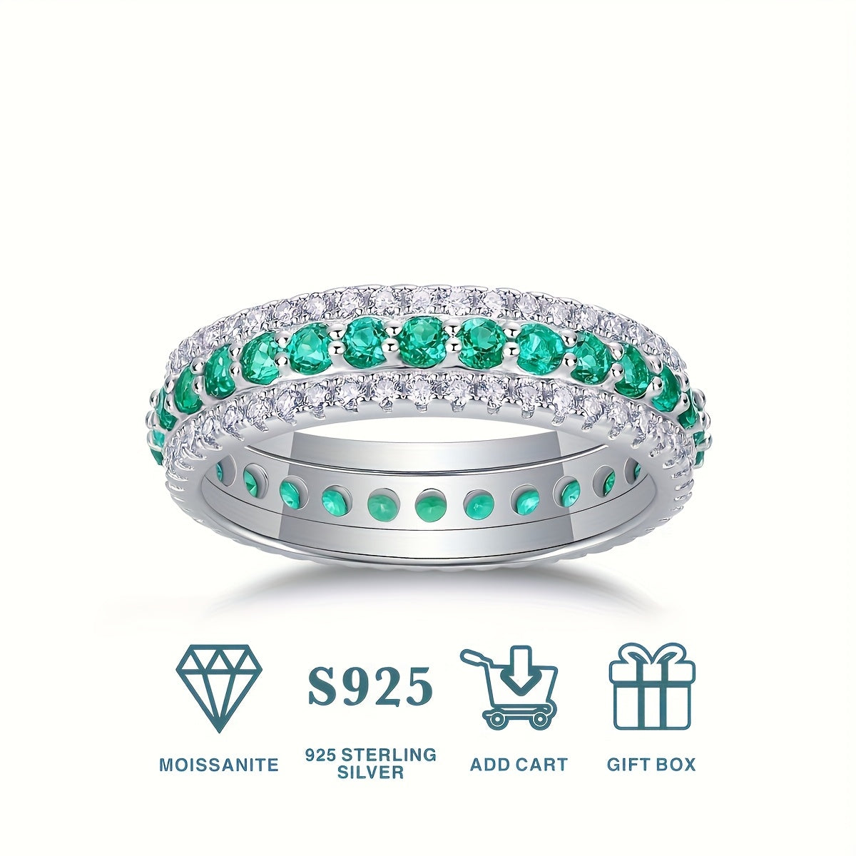 Elegant S925 silver ring featuring 3 rows of moissanite stones and emerald green gemstones. Perfect for stacking or wearing alone.