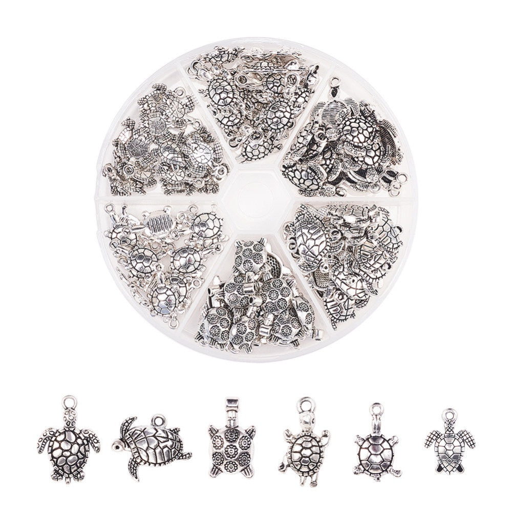 Get this box of 90pcs of 6 styles sea turtle shape alloy pendants, perfect for DIY bracelet and necklace making. These antique silver beads are ideal for crafting unique jewelry pieces.