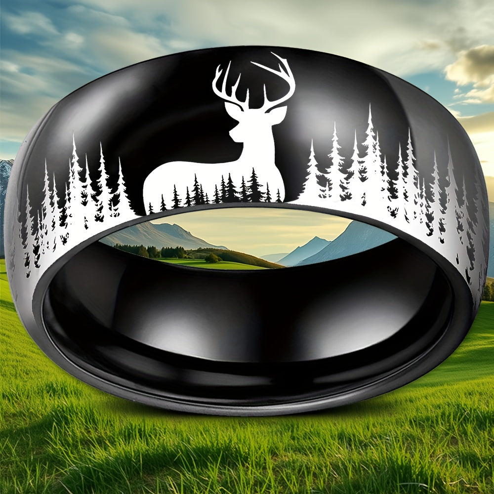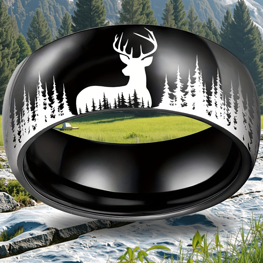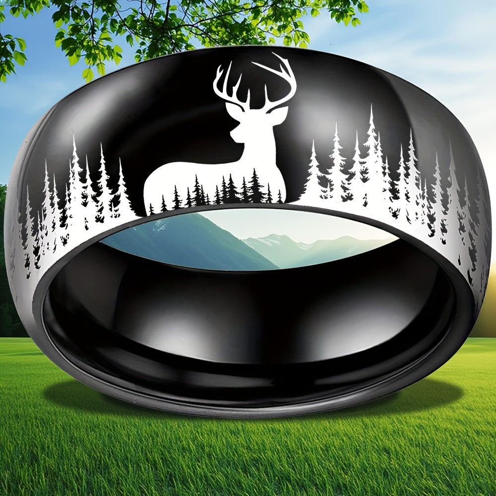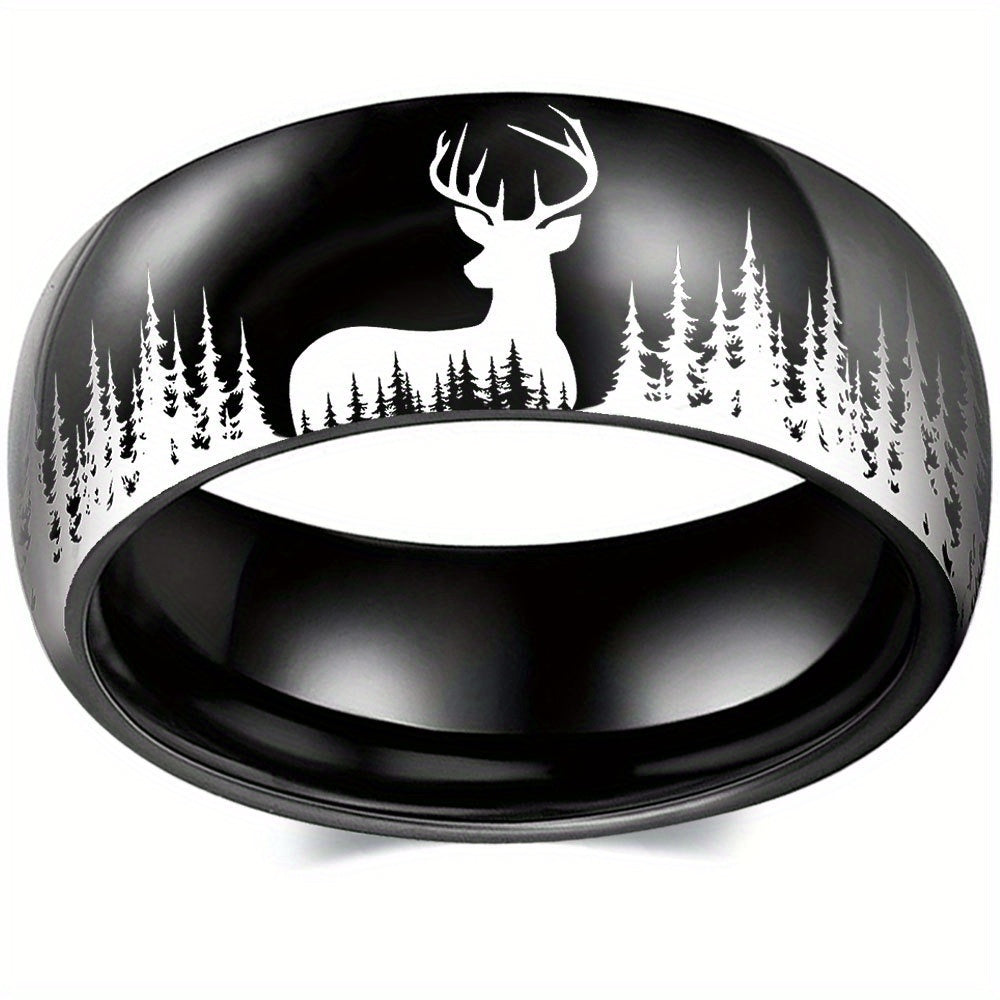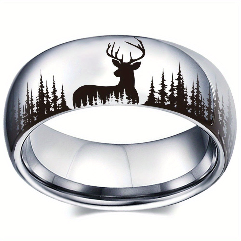 Add a touch of nature to your style with this silvery forest deer pattern stainless steel ring. This men's jewelry piece is perfect for everyday wear or special occasions.