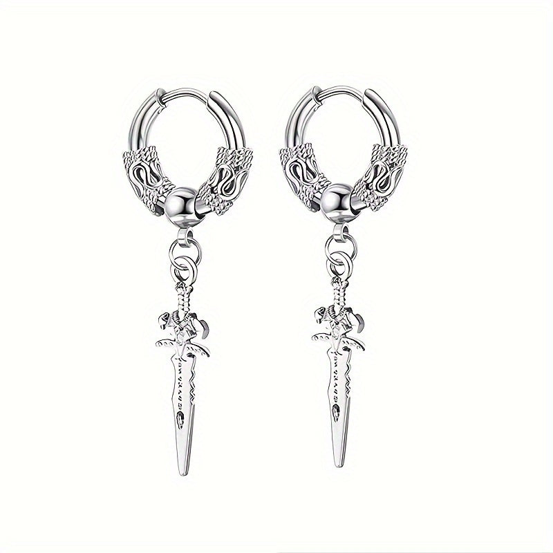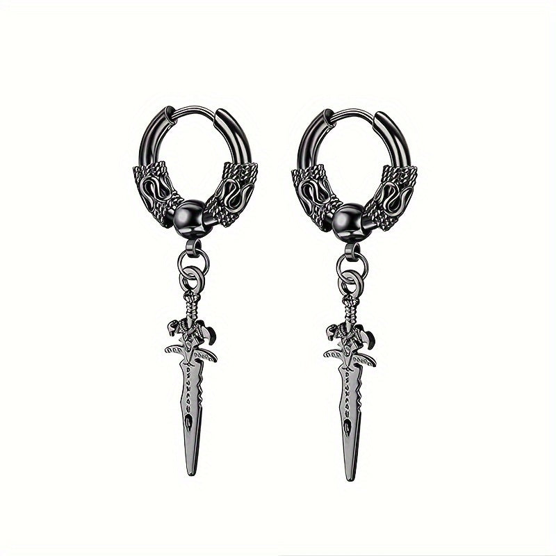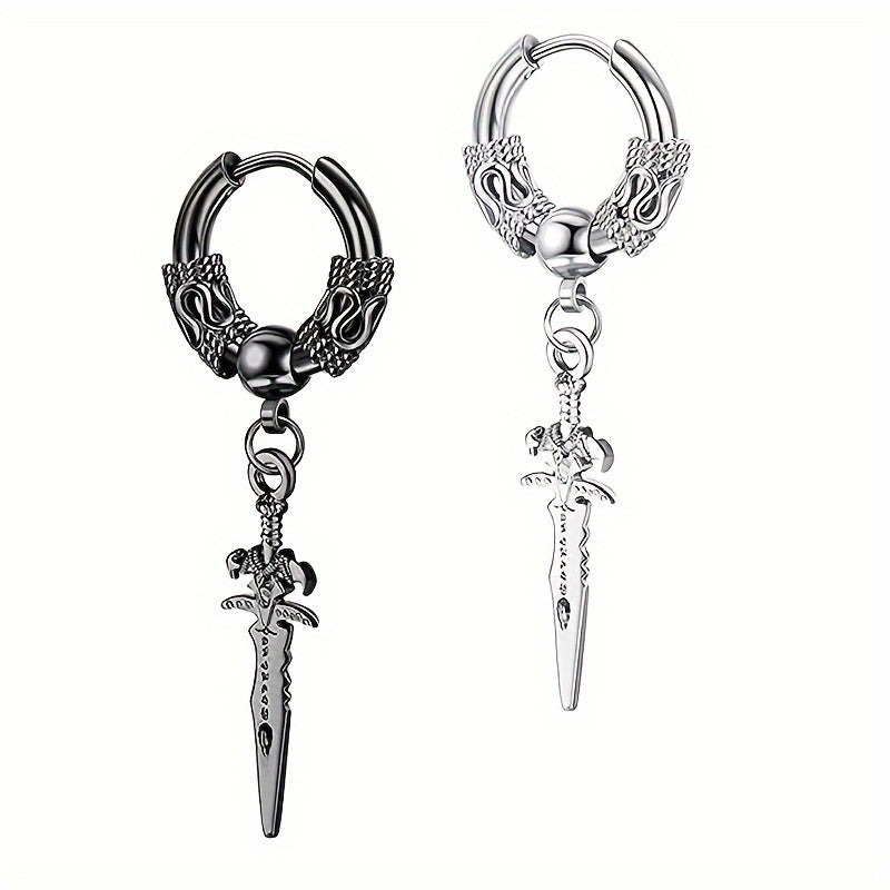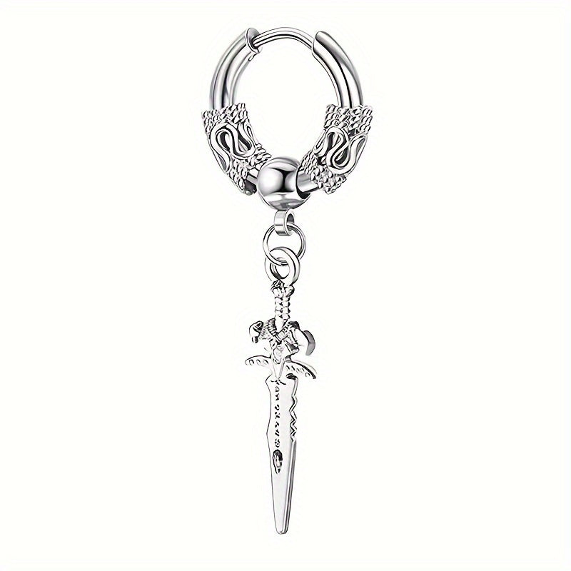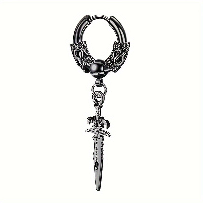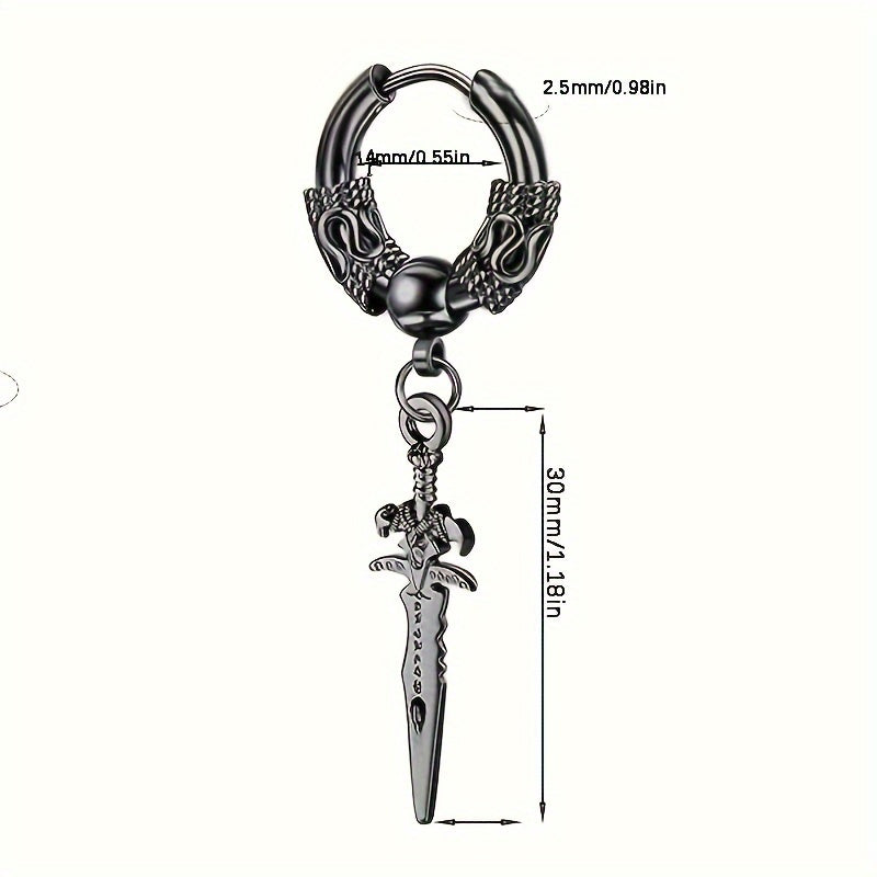 Pair of hypoallergenic golden-plated stainless steel clip-on earrings for men. Features a funky and edgy sword and wings design. Suitable for casual and formal occasions.