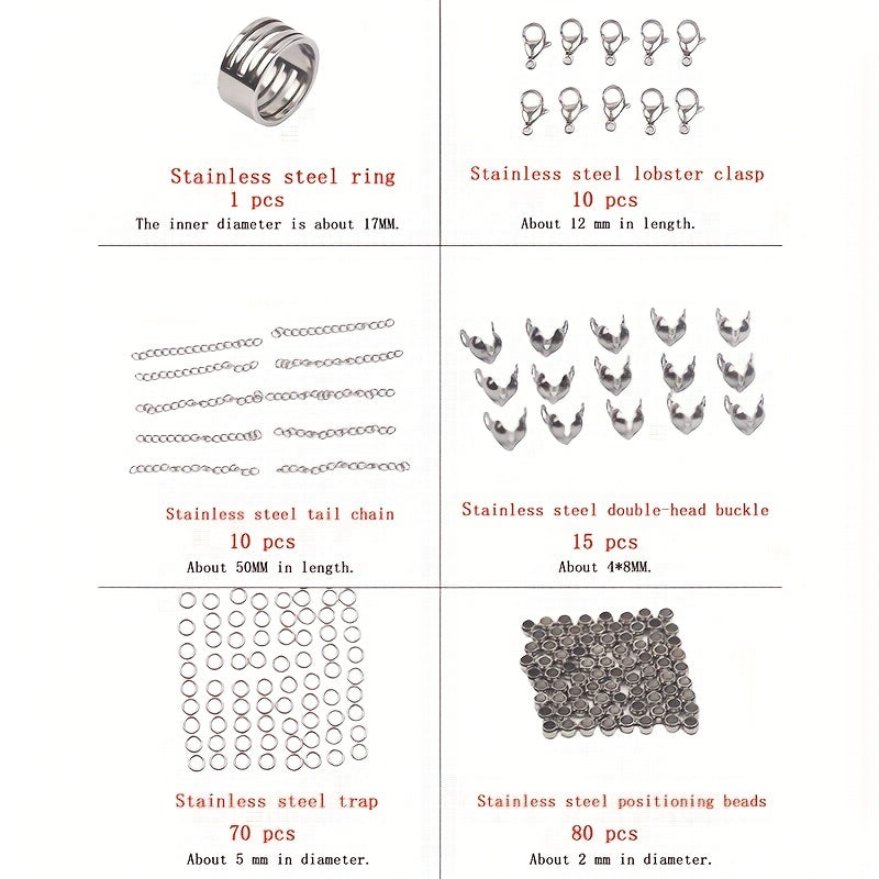 This set includes lobster clasp, positioning beads, and more for DIY bracelets and necklaces.