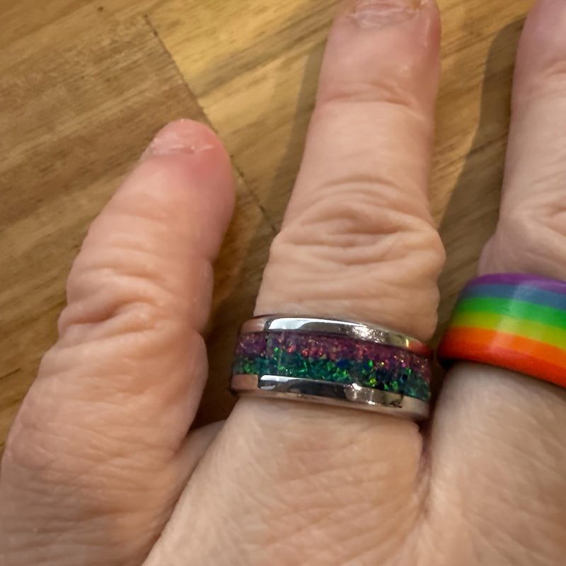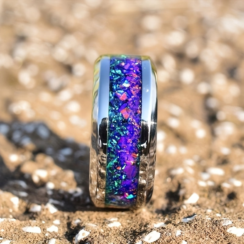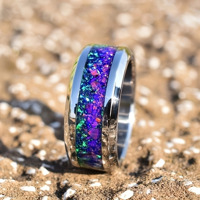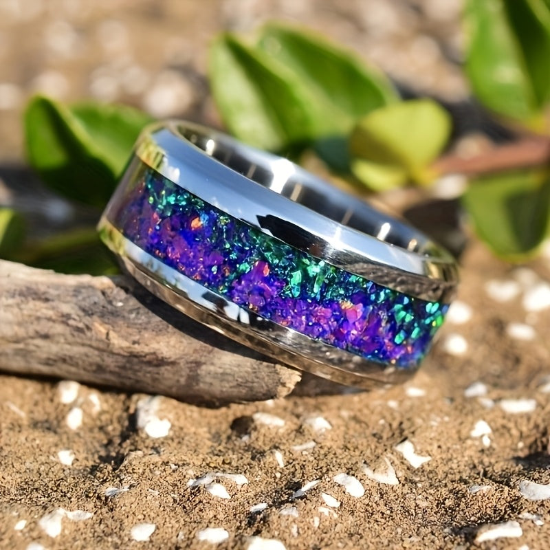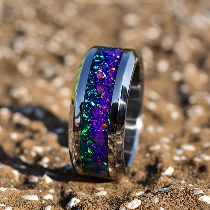 This 316L stainless steel ring features a unique design with crushed dark green accents, inspired by a starry night. Perfect as a wedding ring for both men and women.