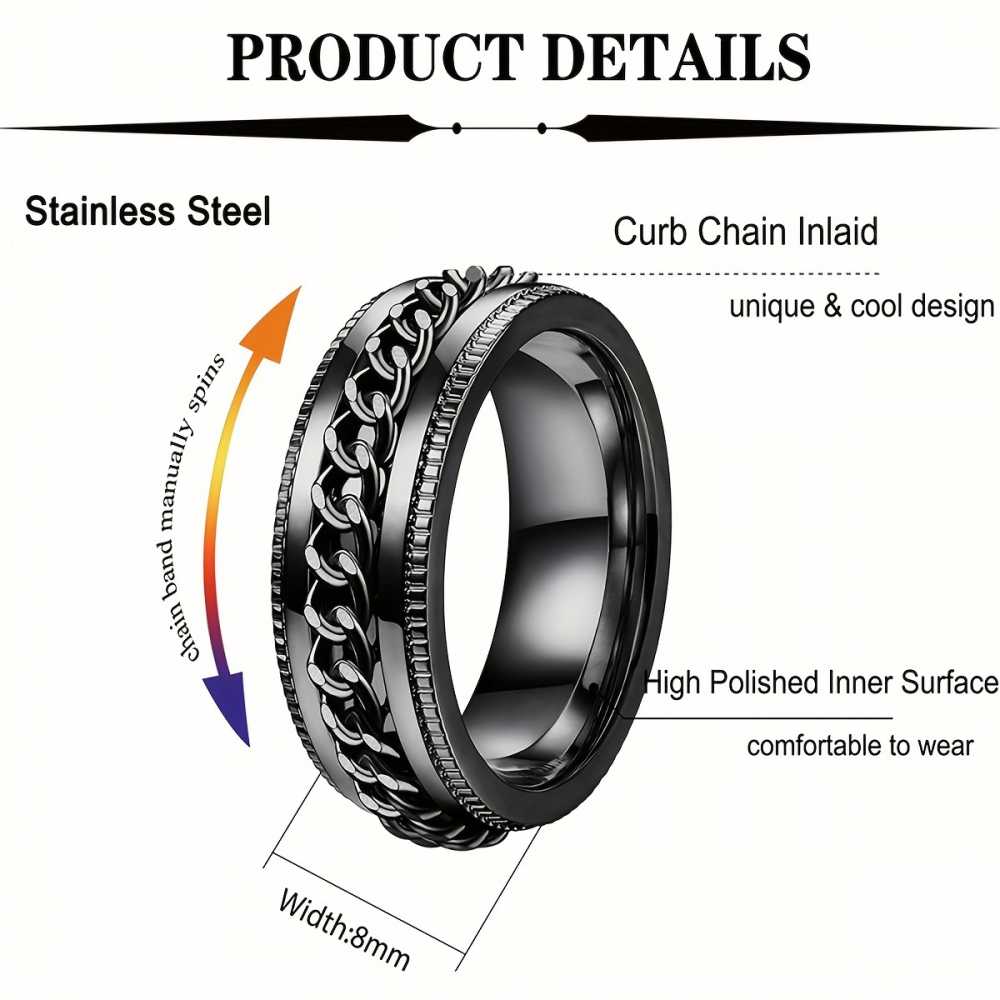 Bling Queen ist eine erschwingliche Modeschmuckmarke mit verschiedenen Produkttypen wie Armbändern, Halsketten, Ohrringen, Ringen usw., geeignet für Frauen, Männer und Kinder. Wir präsentieren den schwarzen Edelstahl-Drehring, ein stilvolles und funktionales Accessoire mit elegantem Schwarz und drehbarem Außenband für den ganzen Tag. Hergestellt aus langlebigem, hypoallergenem Edelstahl bietet er Tragekomfort für jeden Tag. Sein minimalistisches Design macht ihn vielseitig einsetzbar und zu jedem Anlass geeignet. Das ideale Geschenk für Sie selbst oder einen geliebten Menschen, der moderne Ästhetik schätzt.